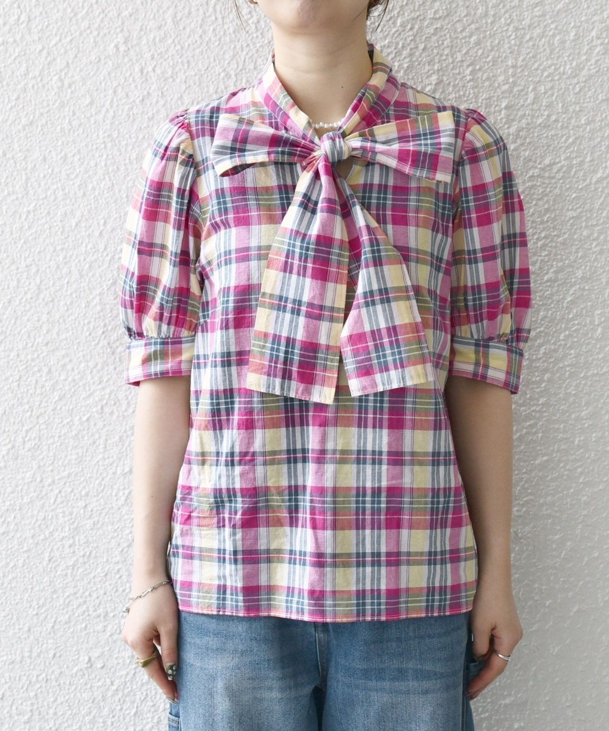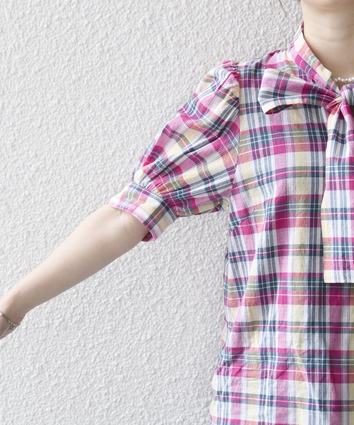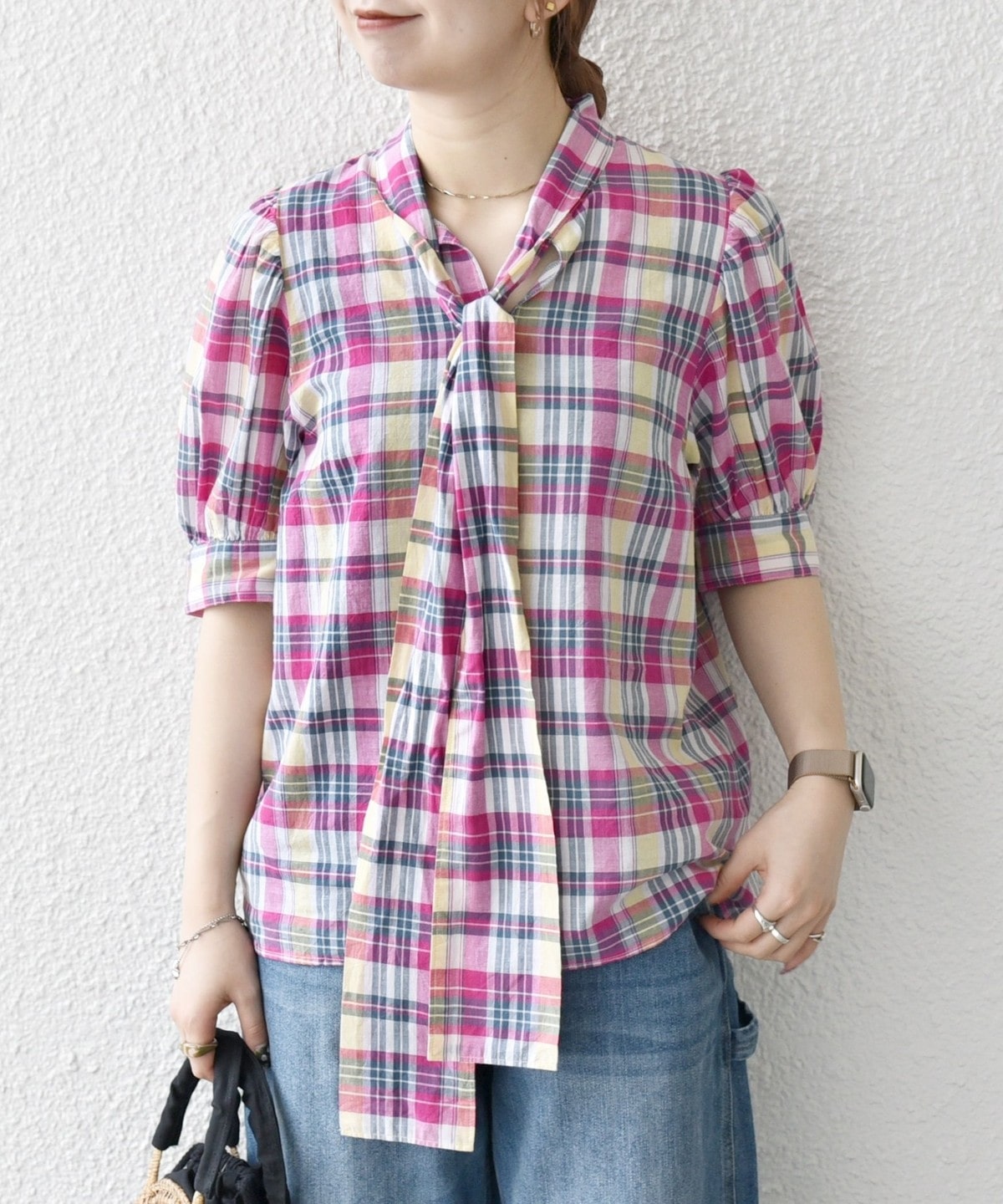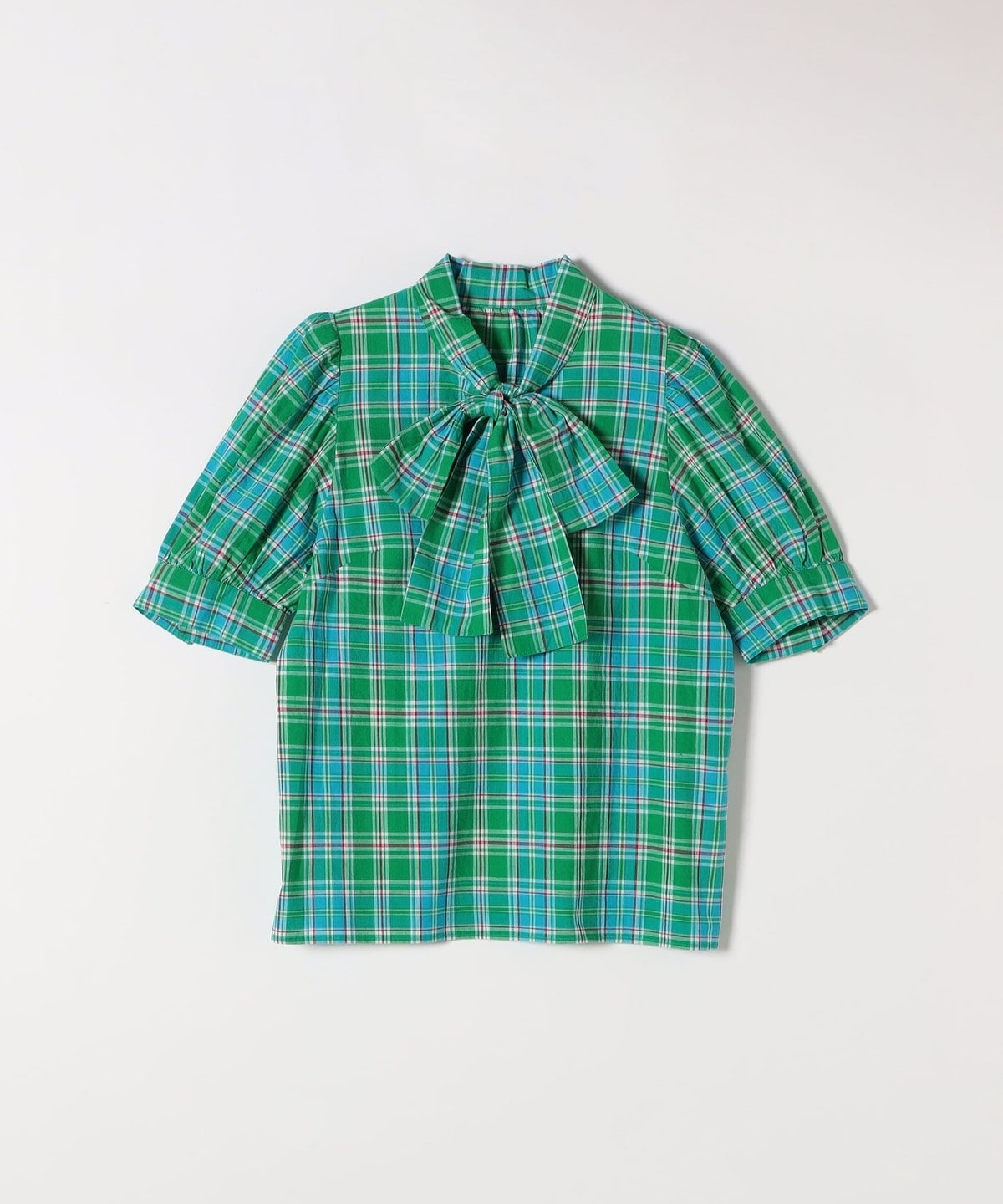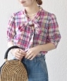 アメリカントラッドの定番、マドラスチェックを使用したクラシックなボウブラウス。