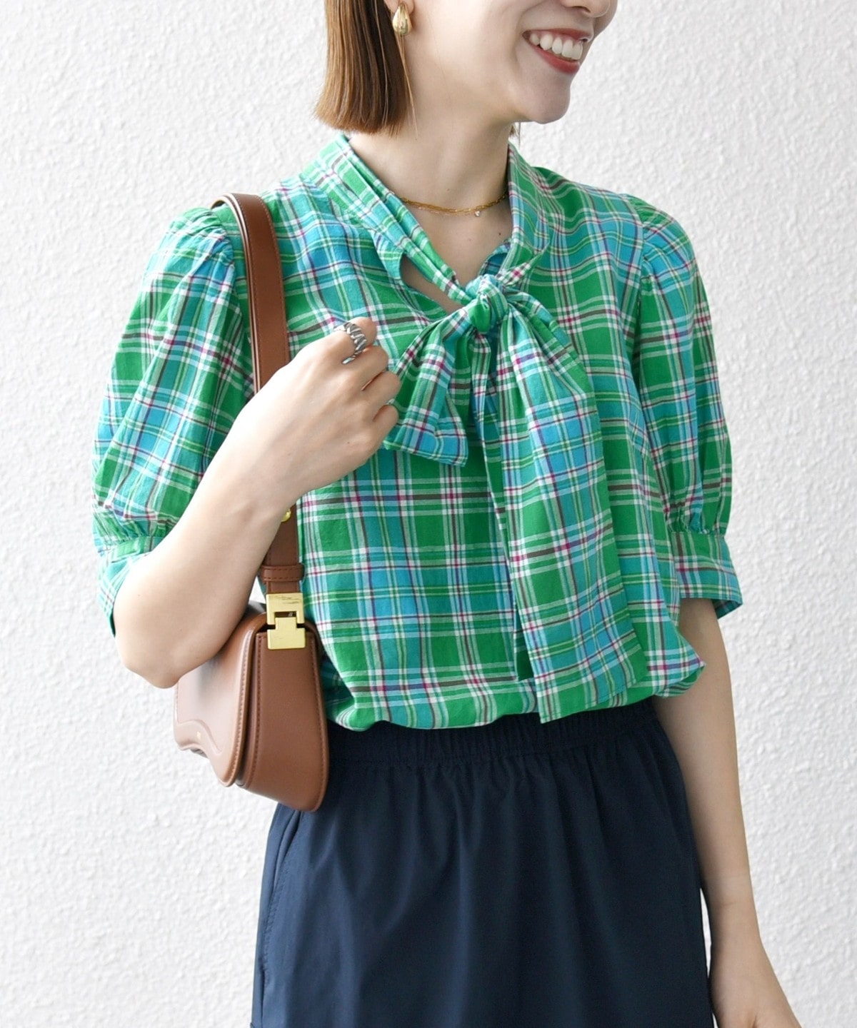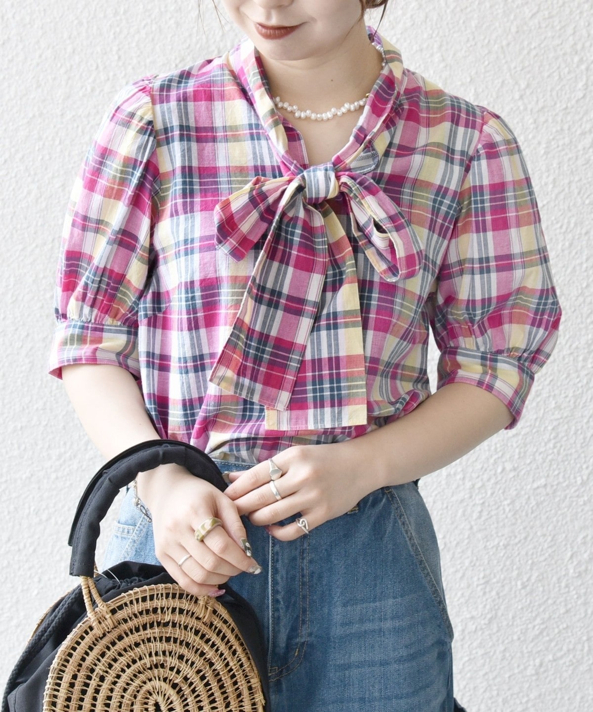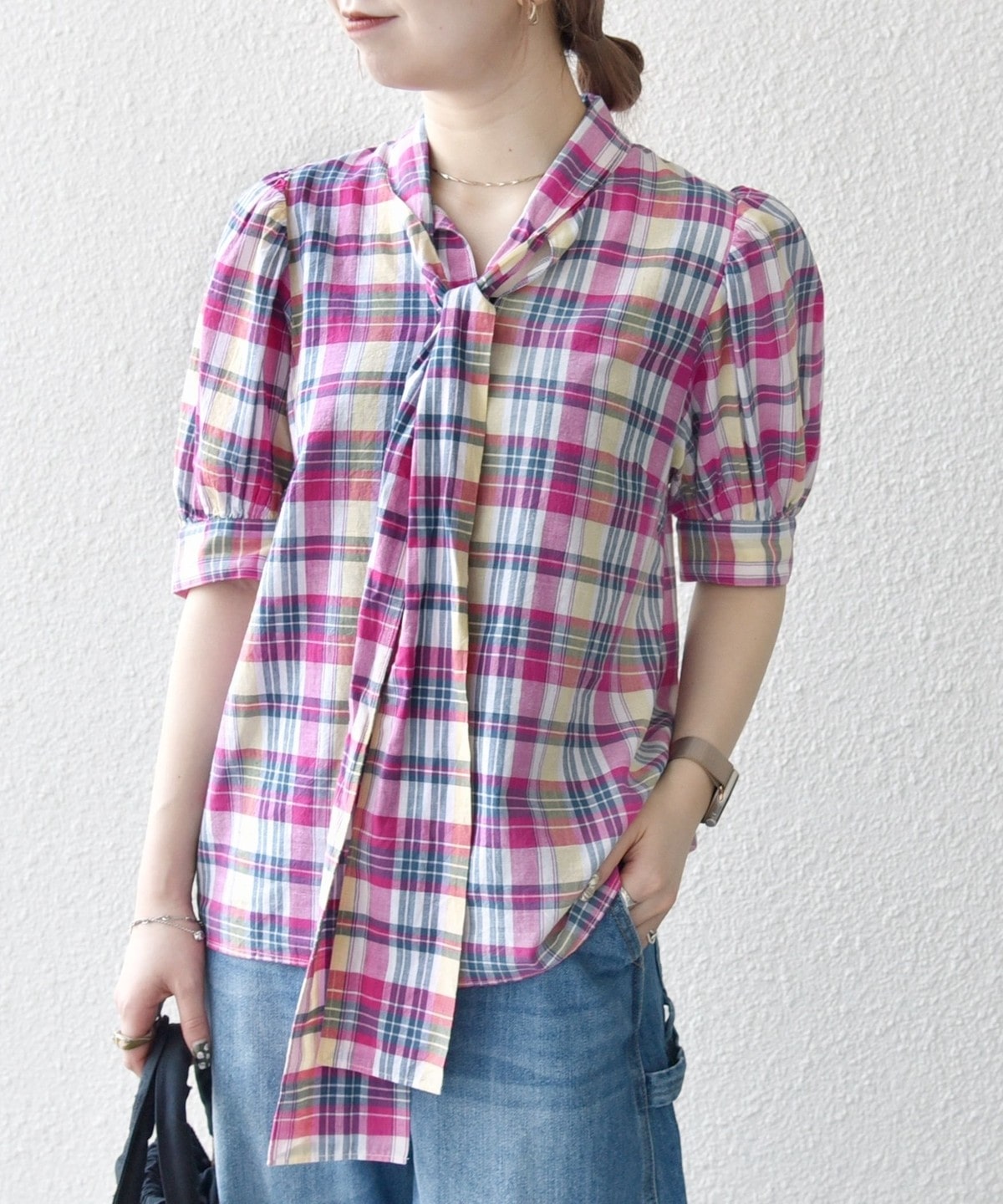 アメリカントラッドの定番、マドラスチェックを使用したクラシックなボウブラウス。