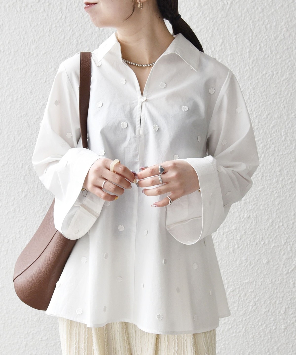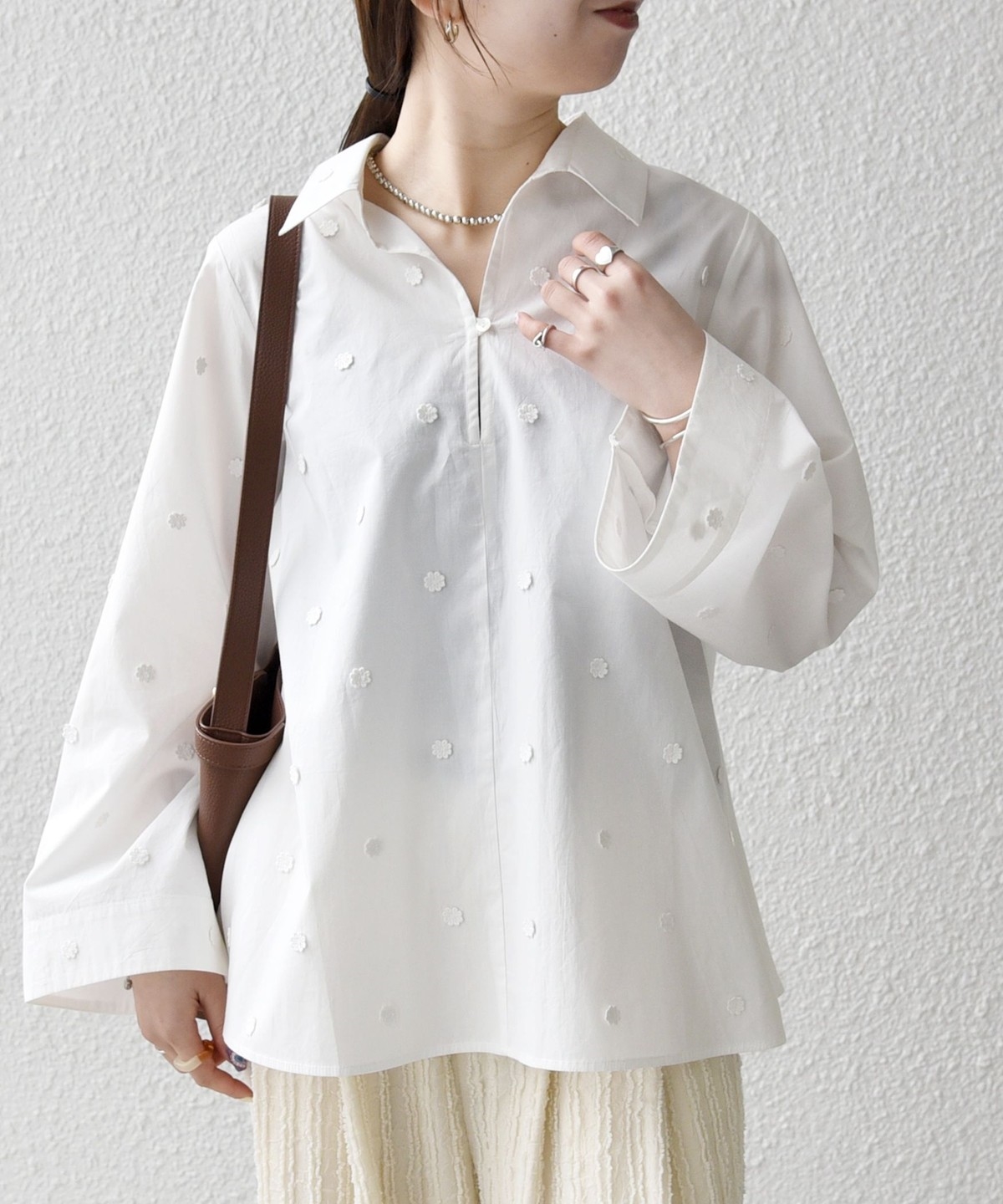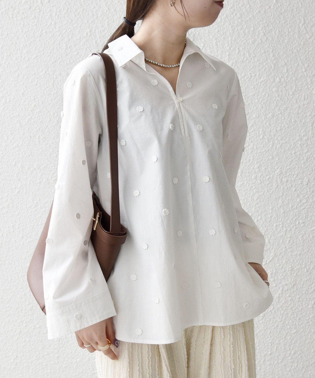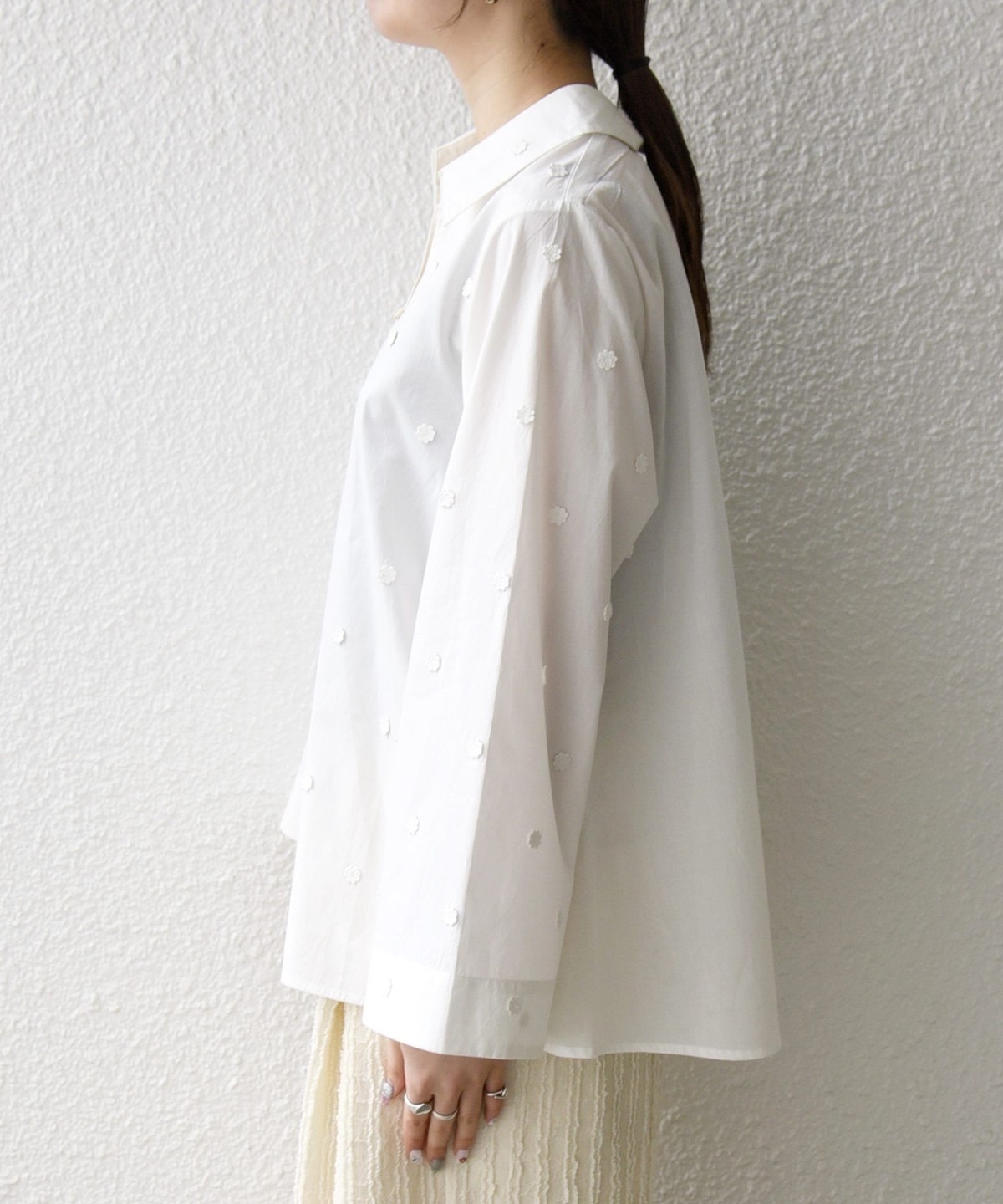 小さなお花のモチーフがフロントと袖に散りばめられた襟付きブラウス。