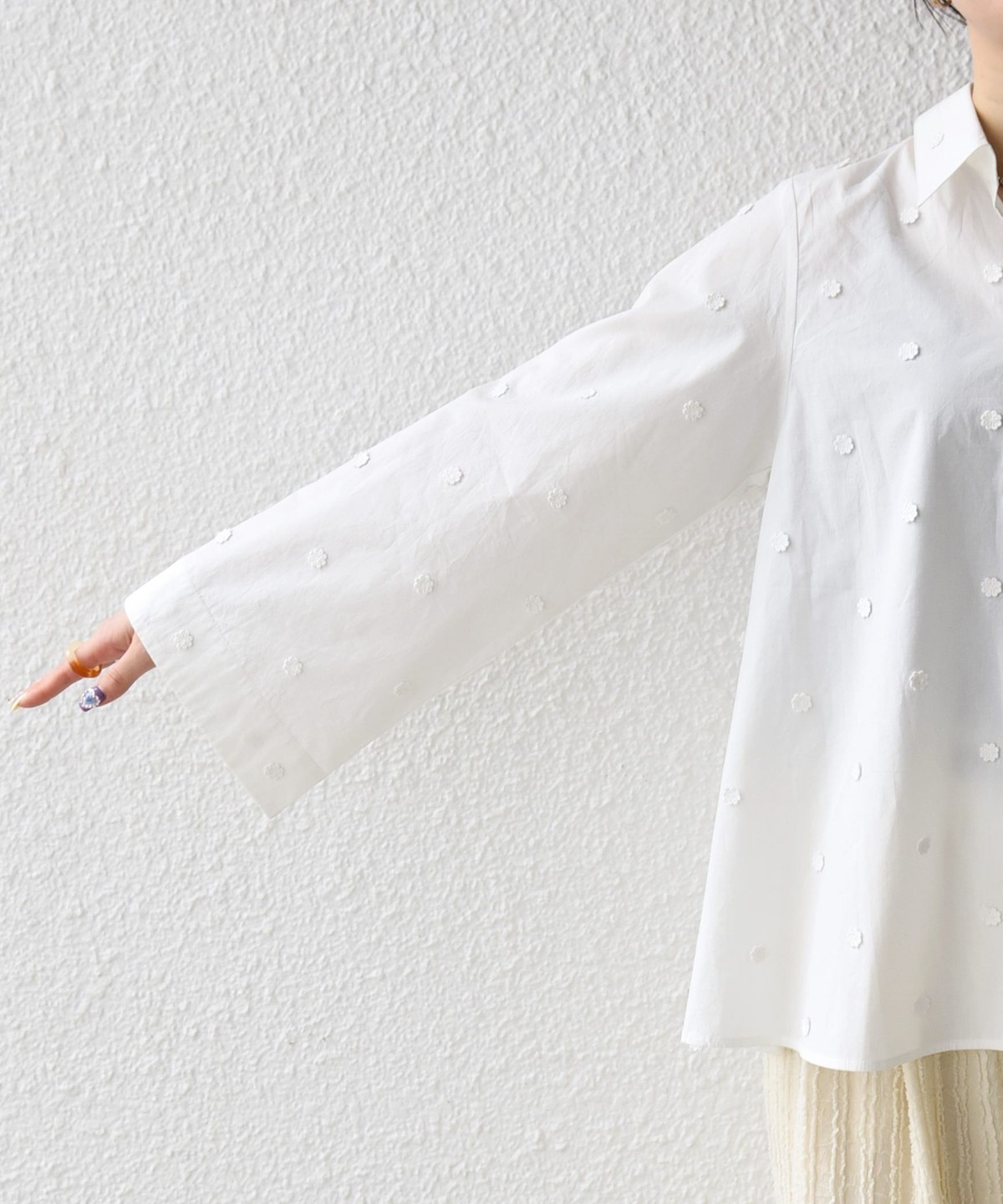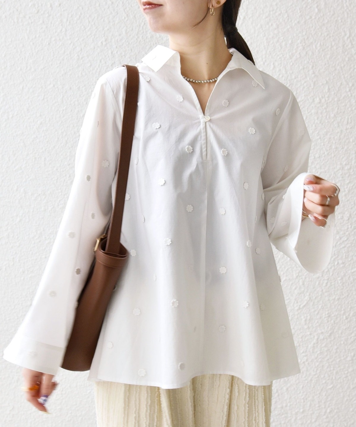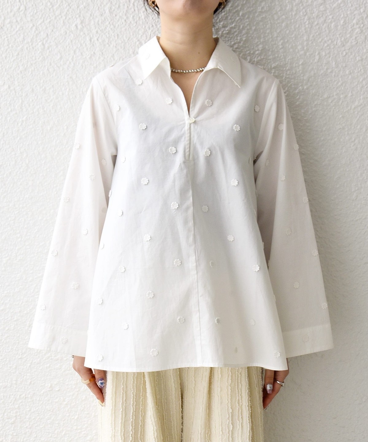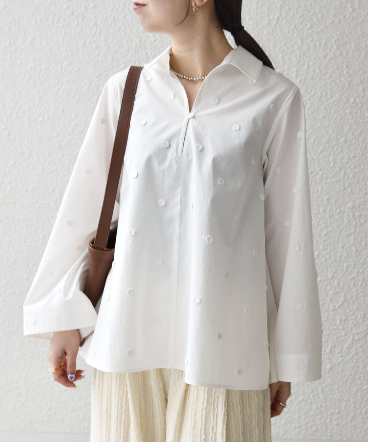 小さなお花のモチーフがフロントと袖に散りばめられた襟付きブラウス。