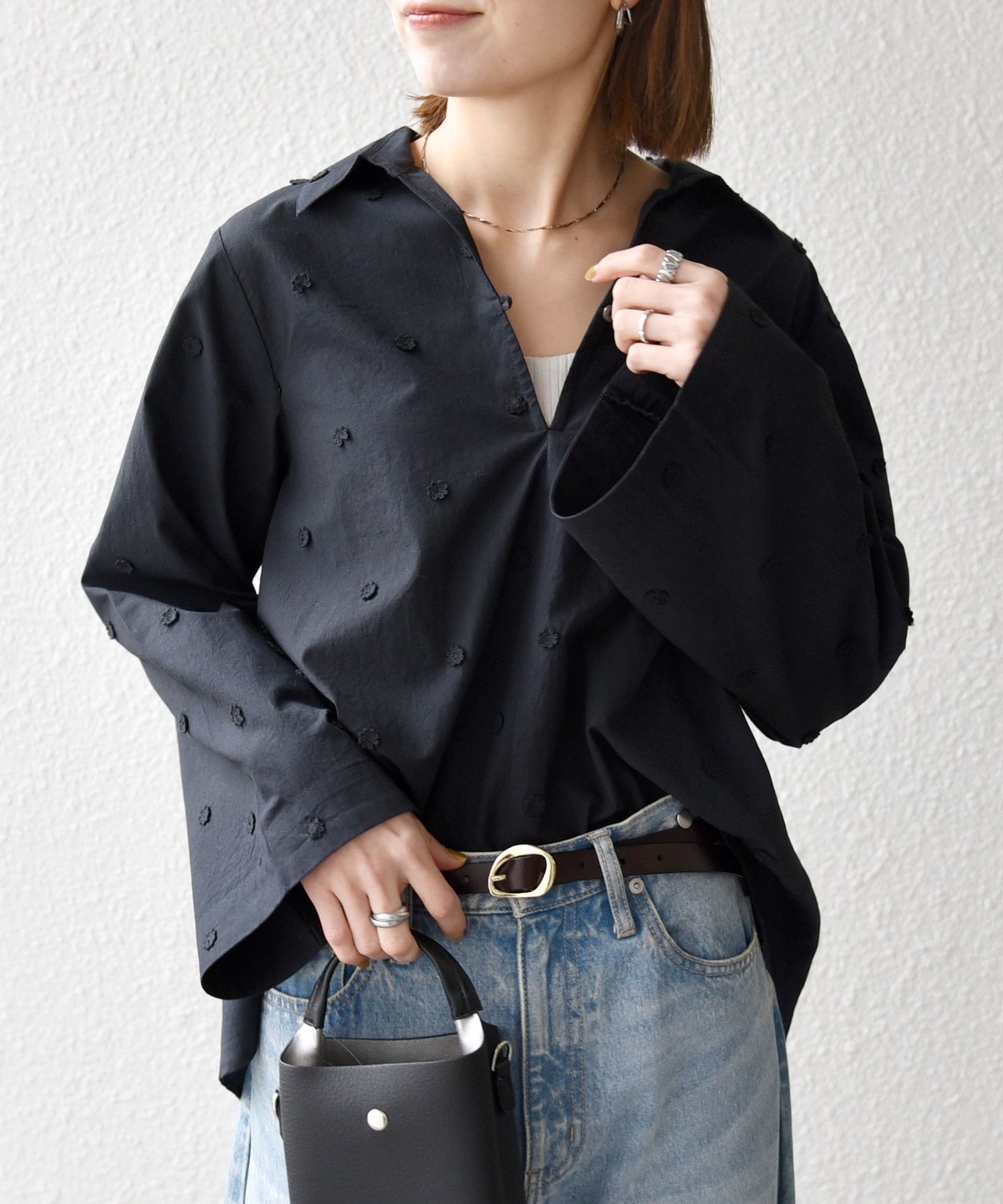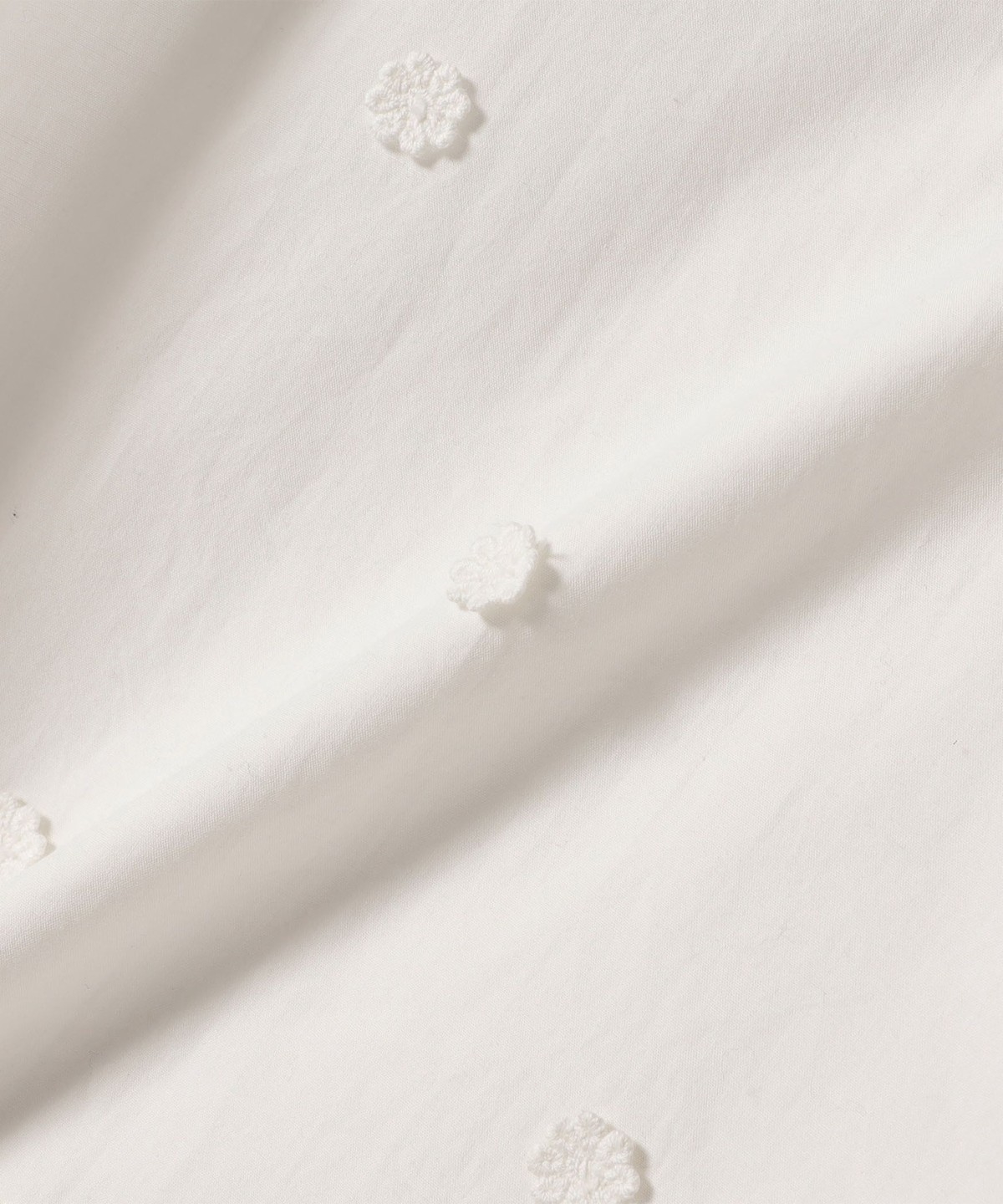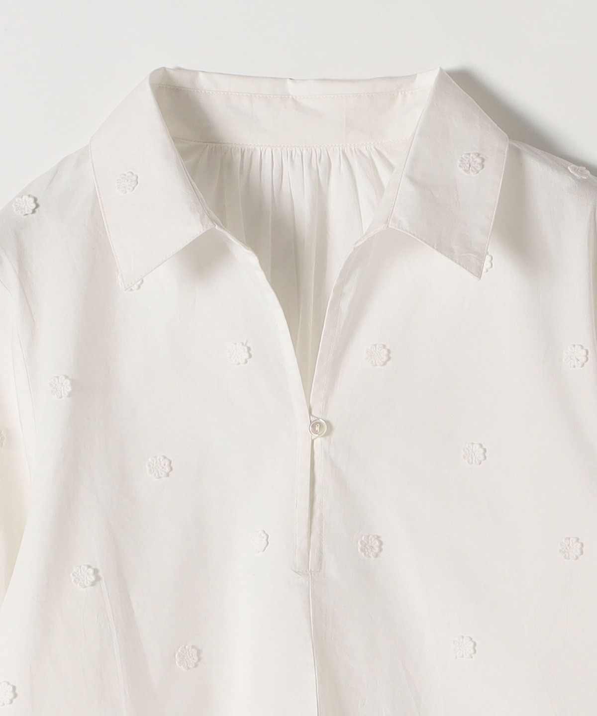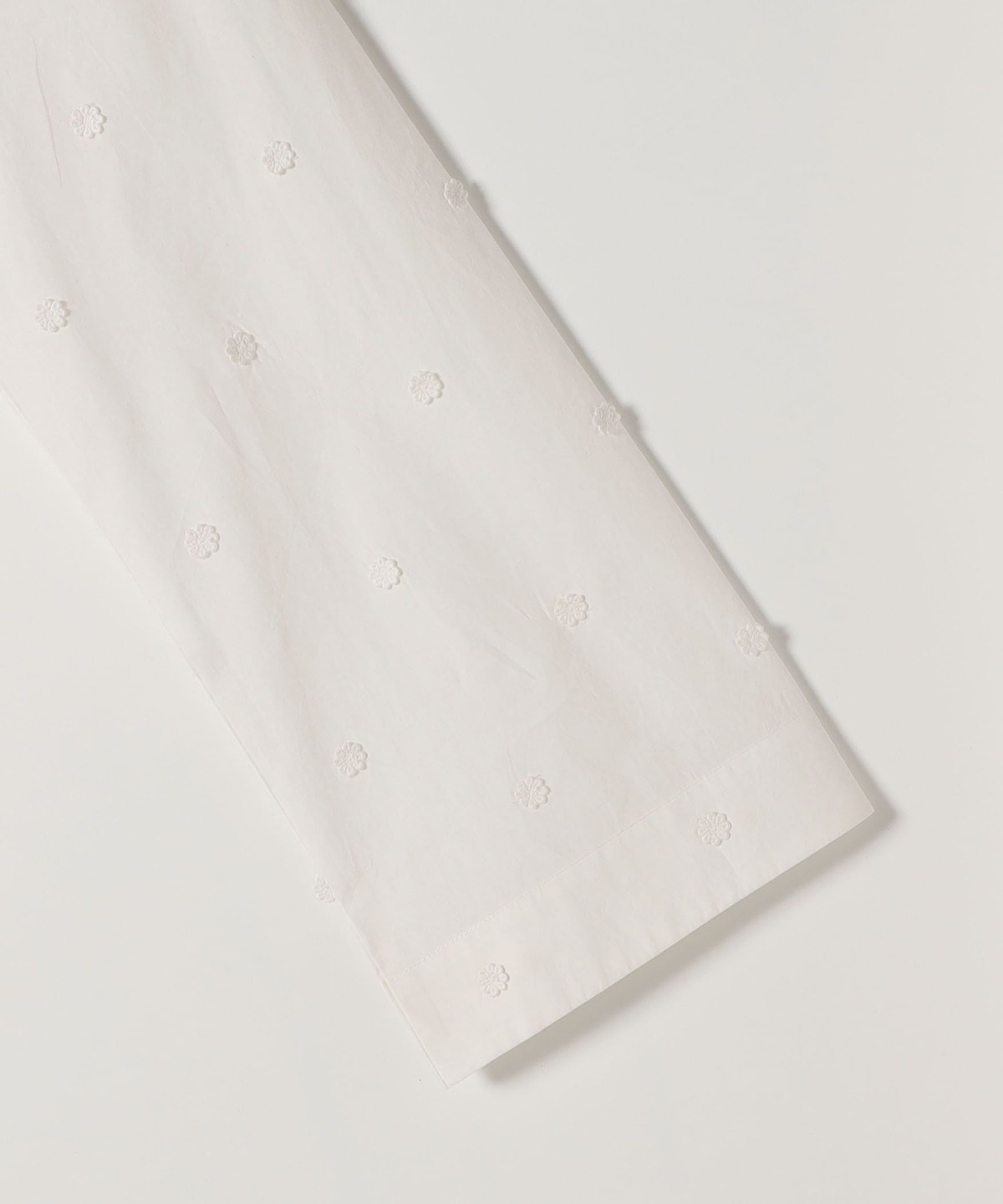 小さなお花のモチーフがフロントと袖に散りばめられた襟付きブラウス。