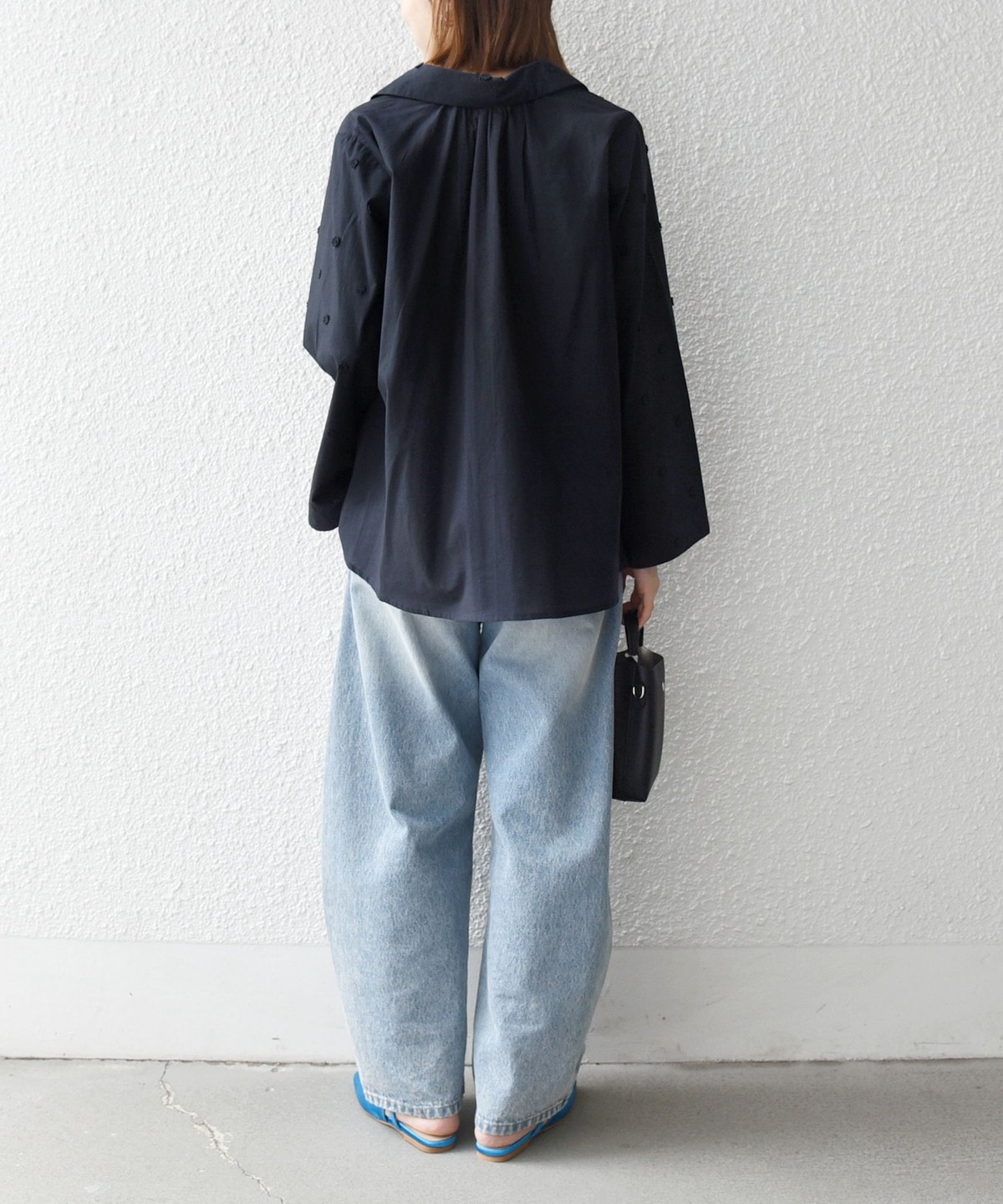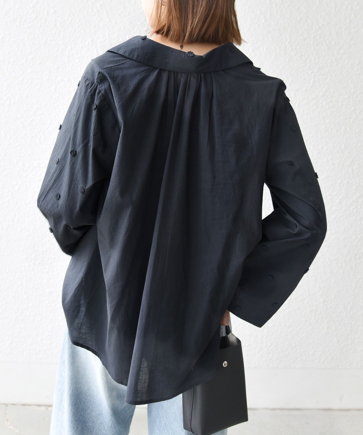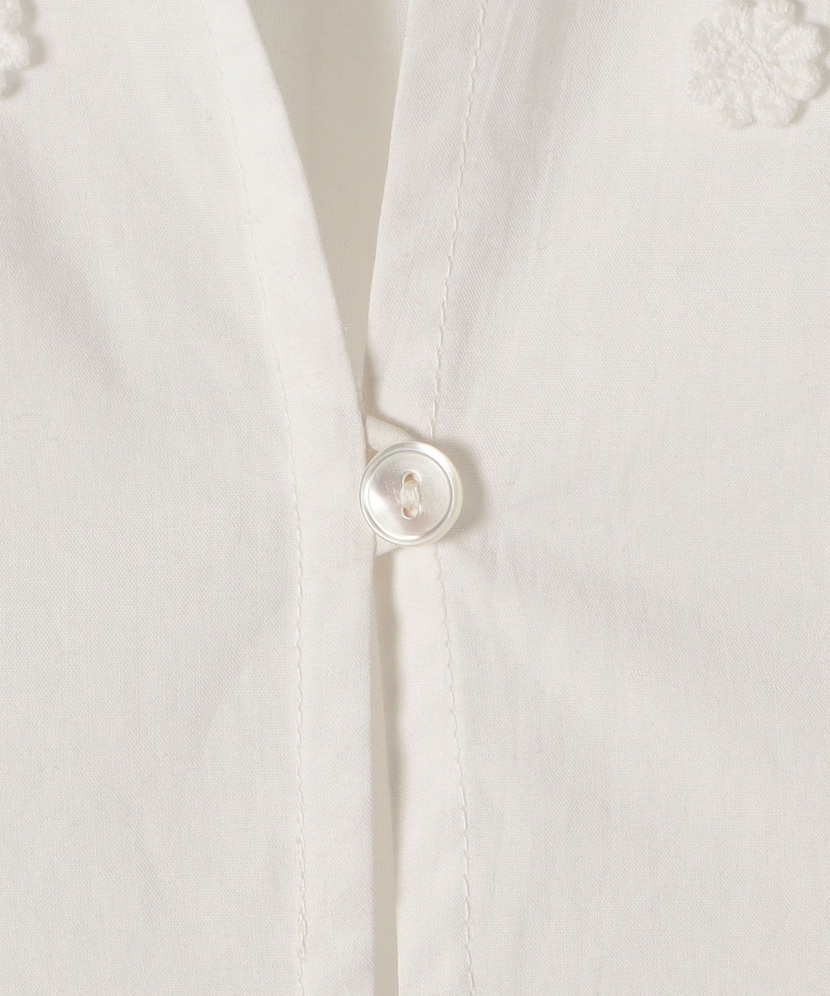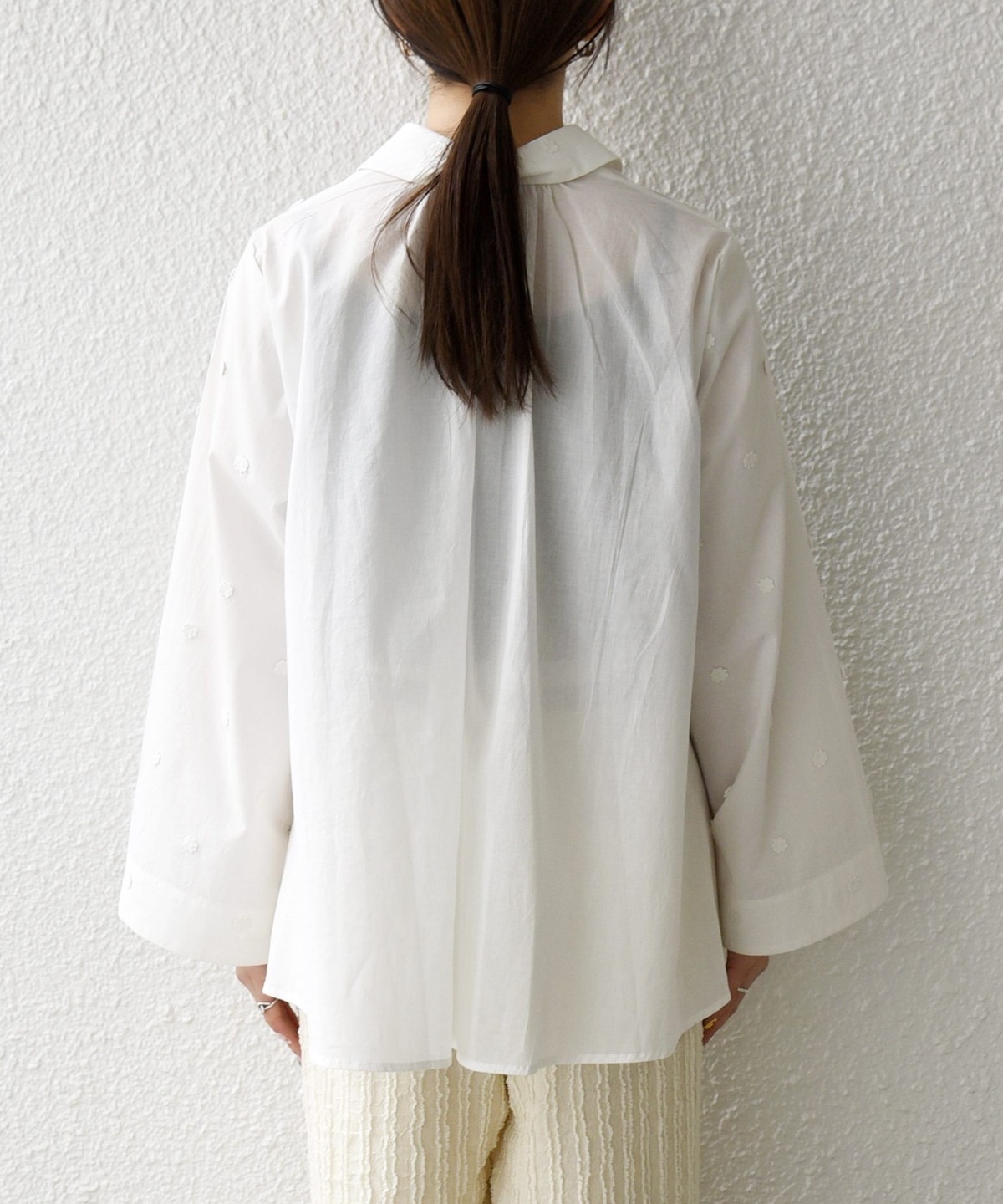 小さなお花のモチーフがフロントと袖に散りばめられた襟付きブラウス。