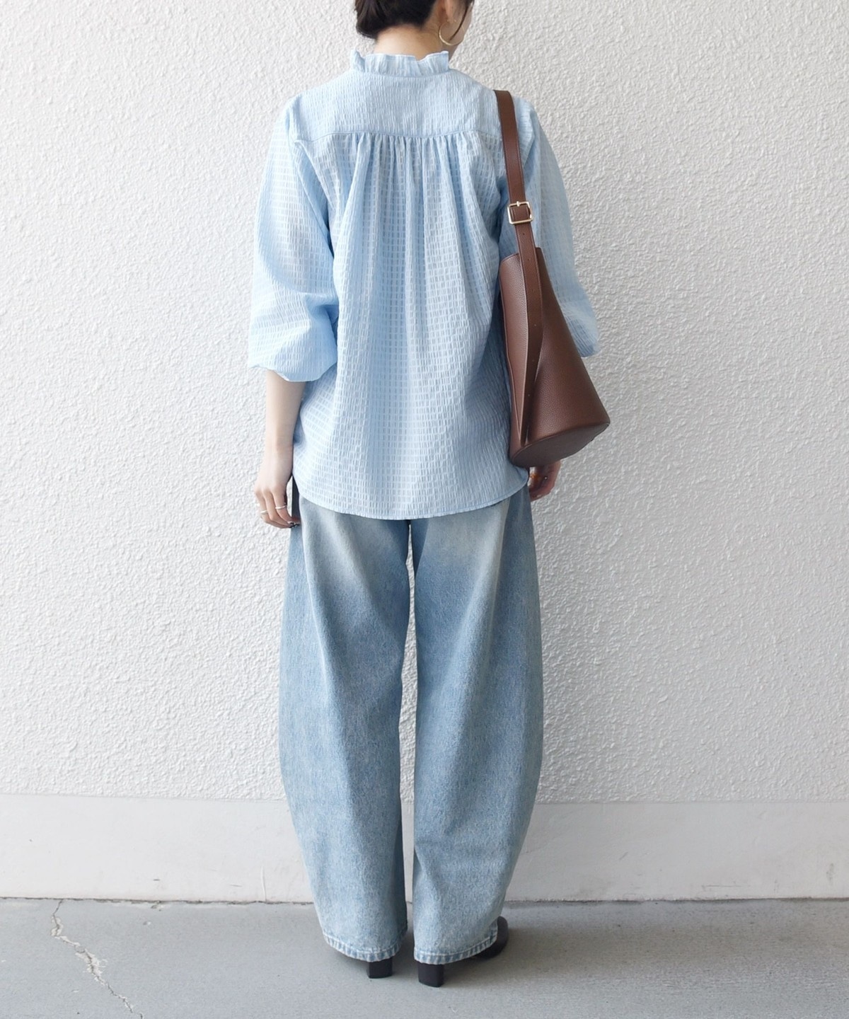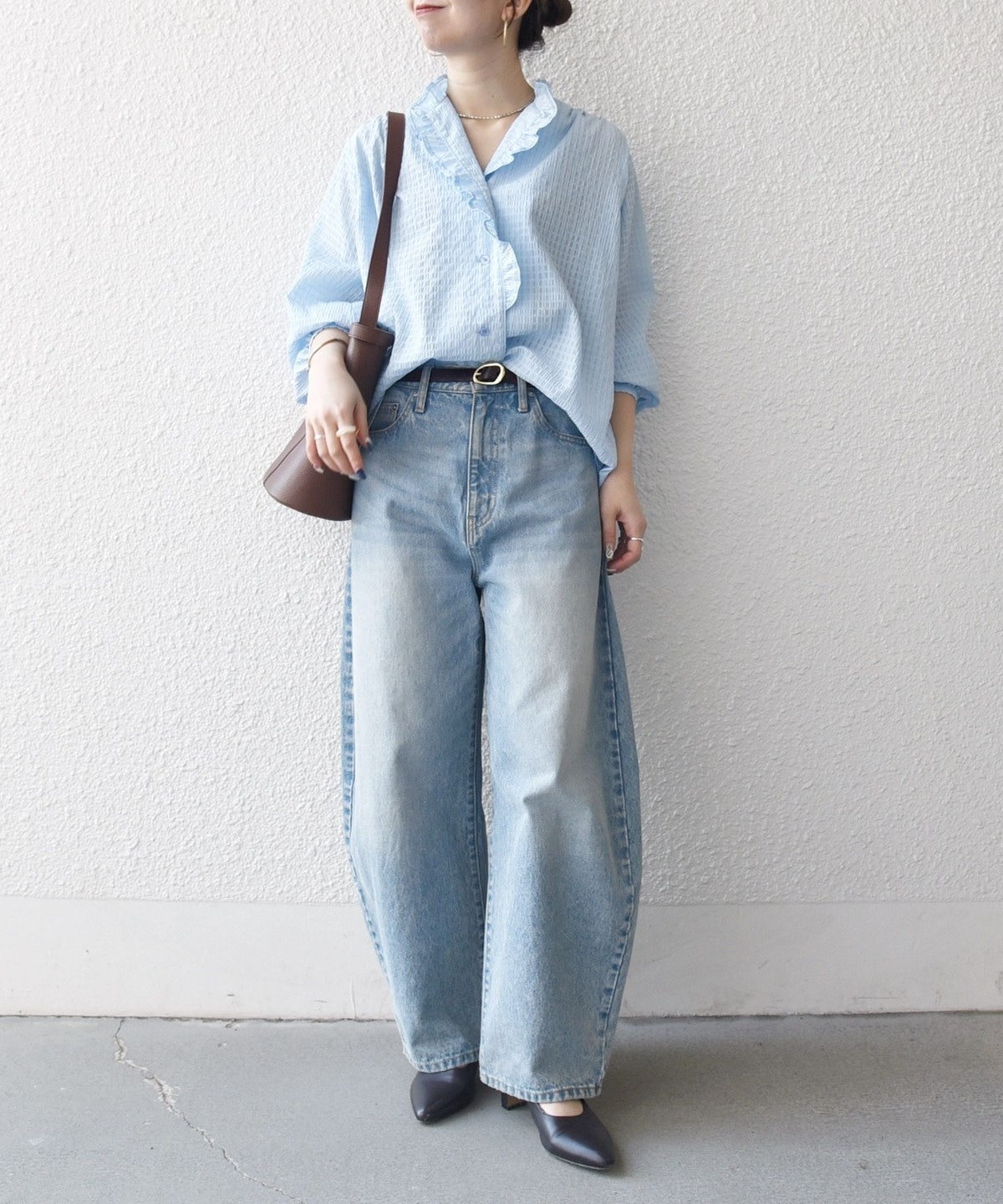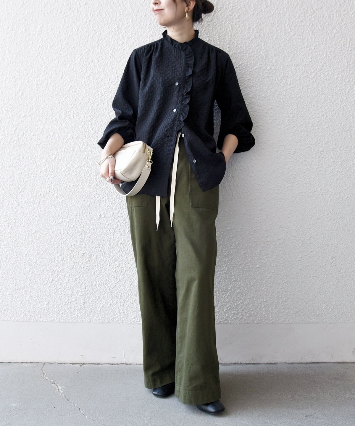 フェミニンなフリルデザインなので、デニムやチノパンなどカジュアルボトムと合わせるのがおすすめ。
