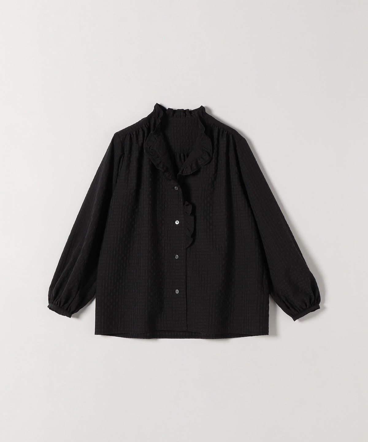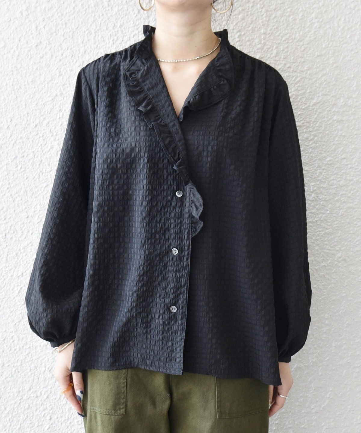襟から前立てまで続くフリルディテールが、ジャケットなどと合わせても華やかに見せてくれる一着です。