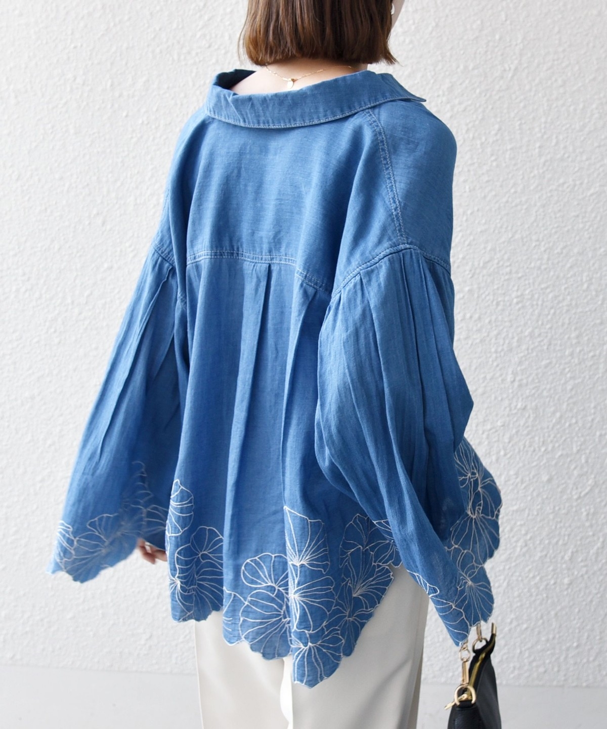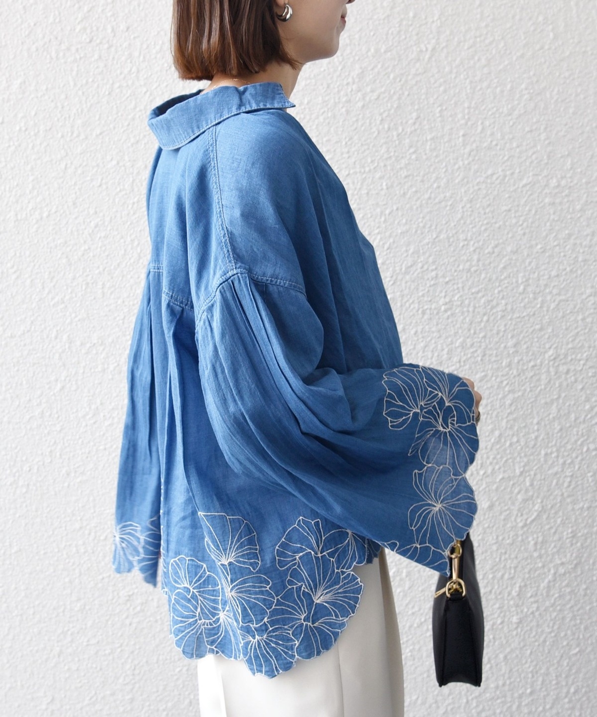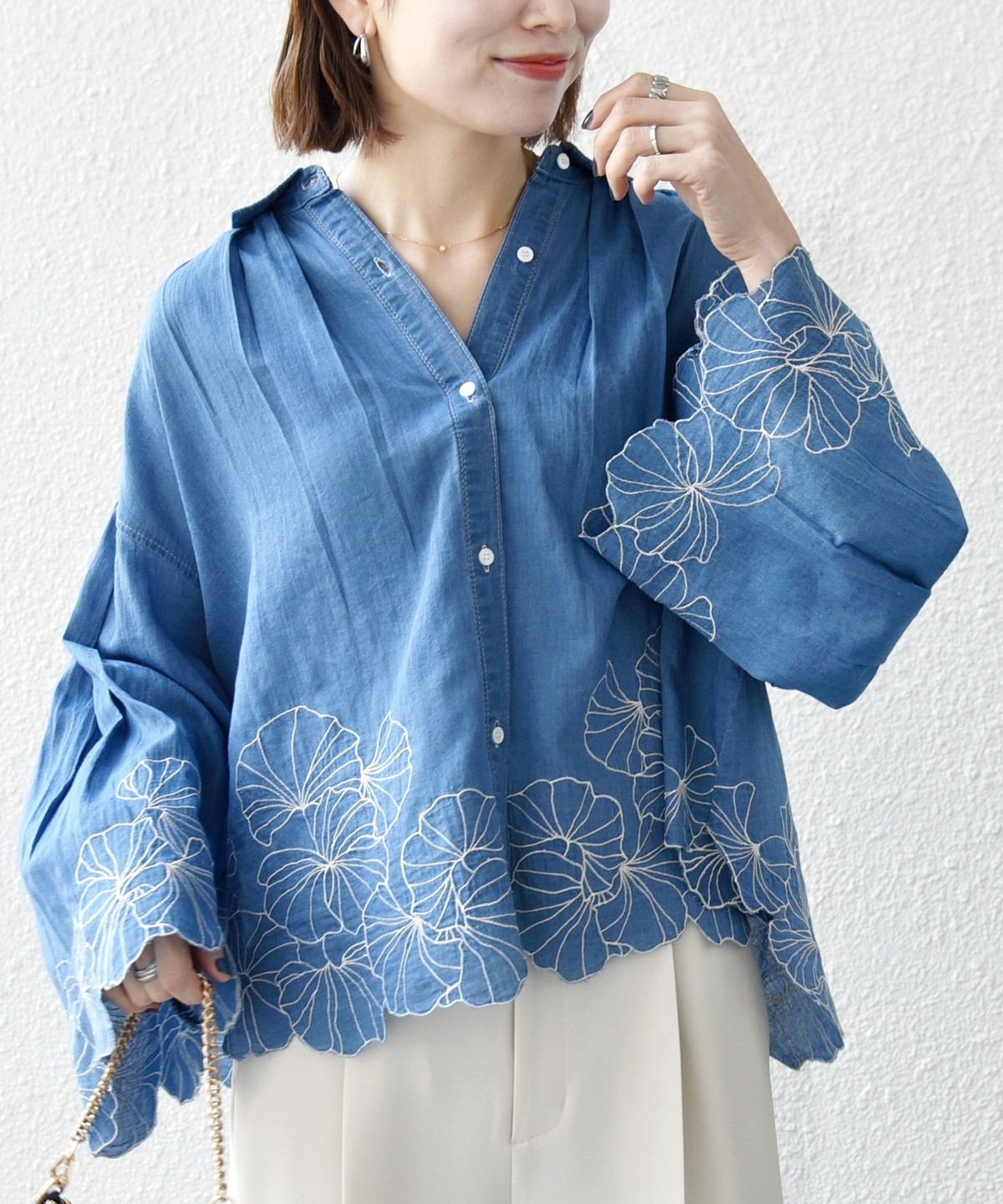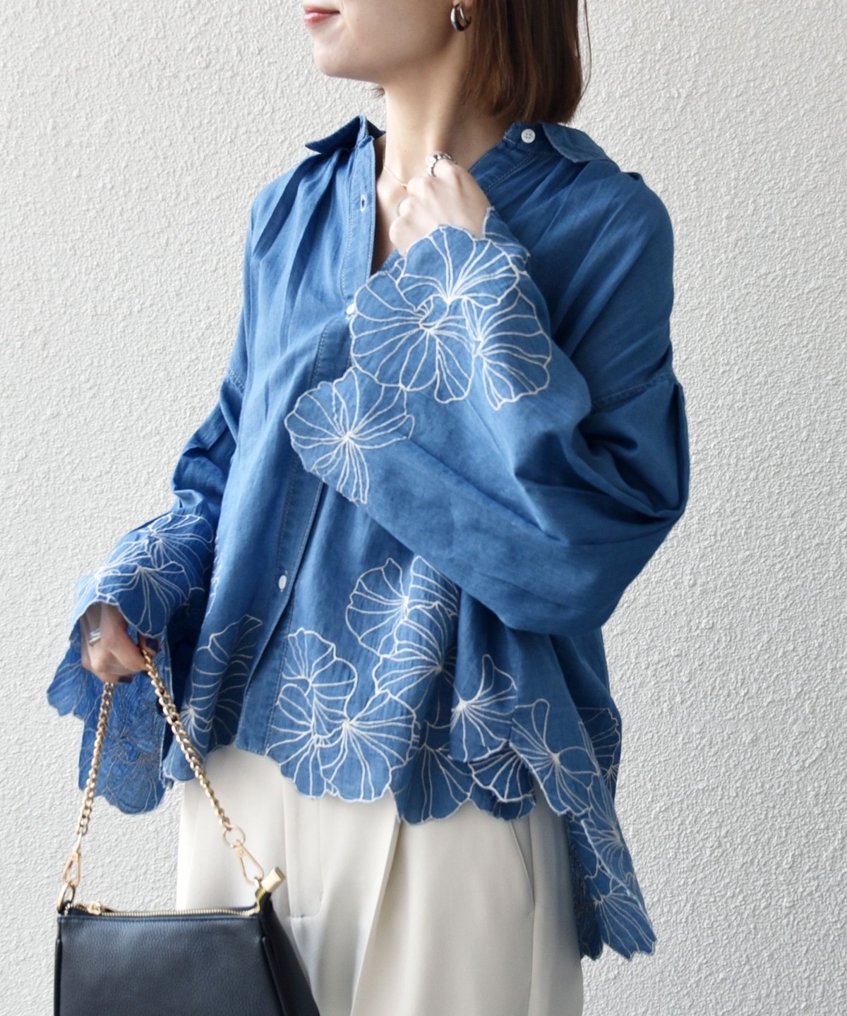 シアーデニム素材にフラワー刺繍を施したシャツブラウス。