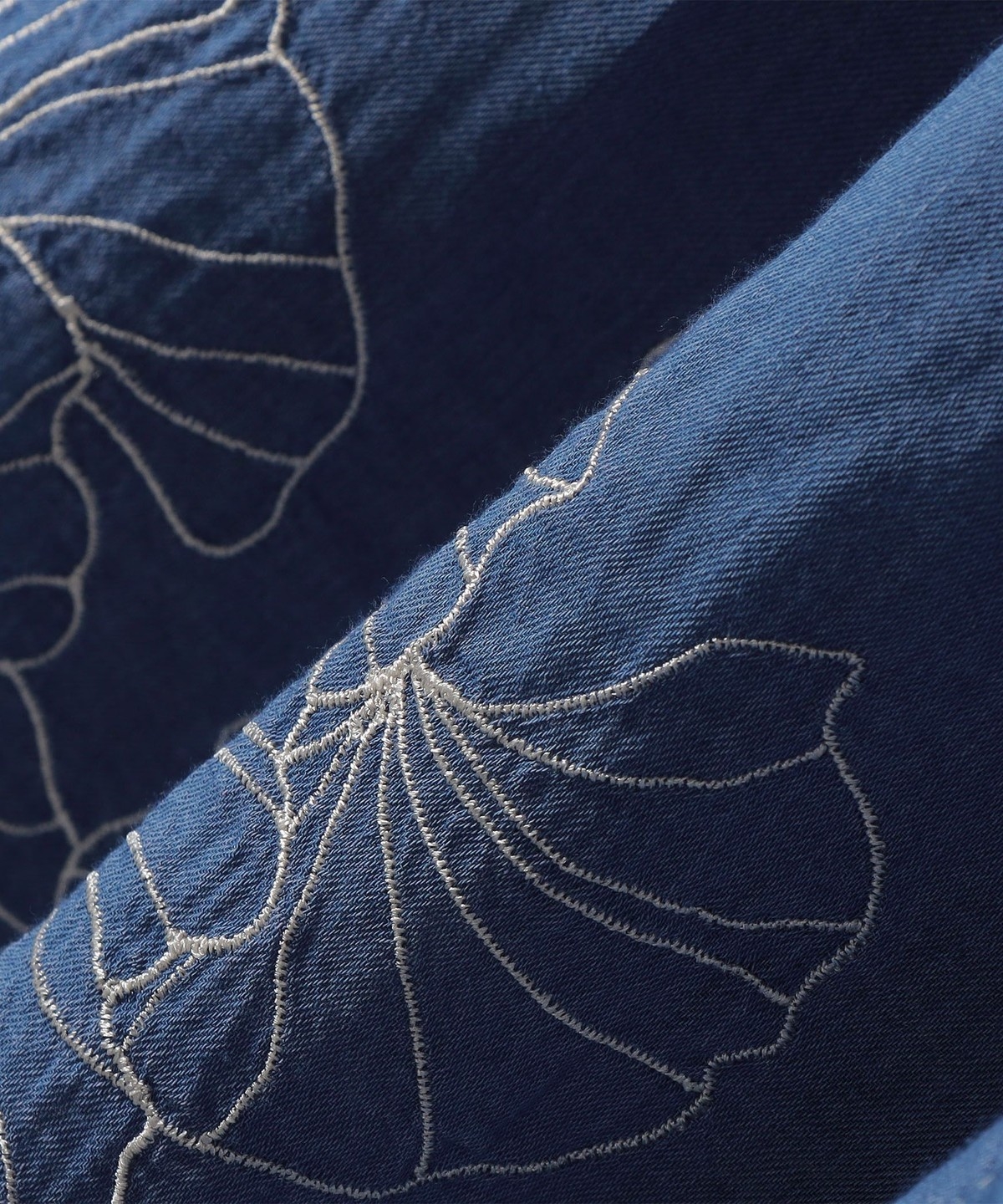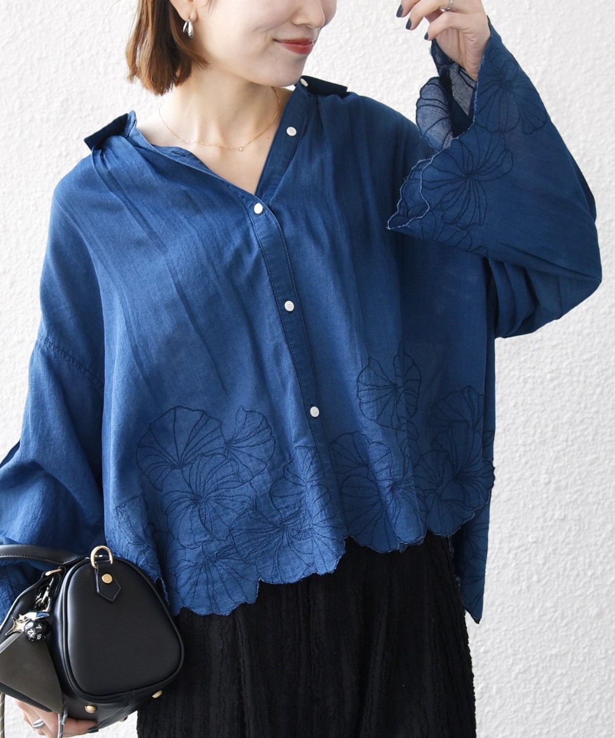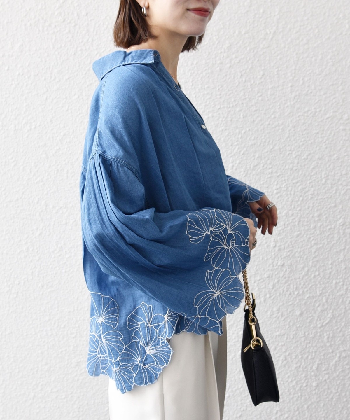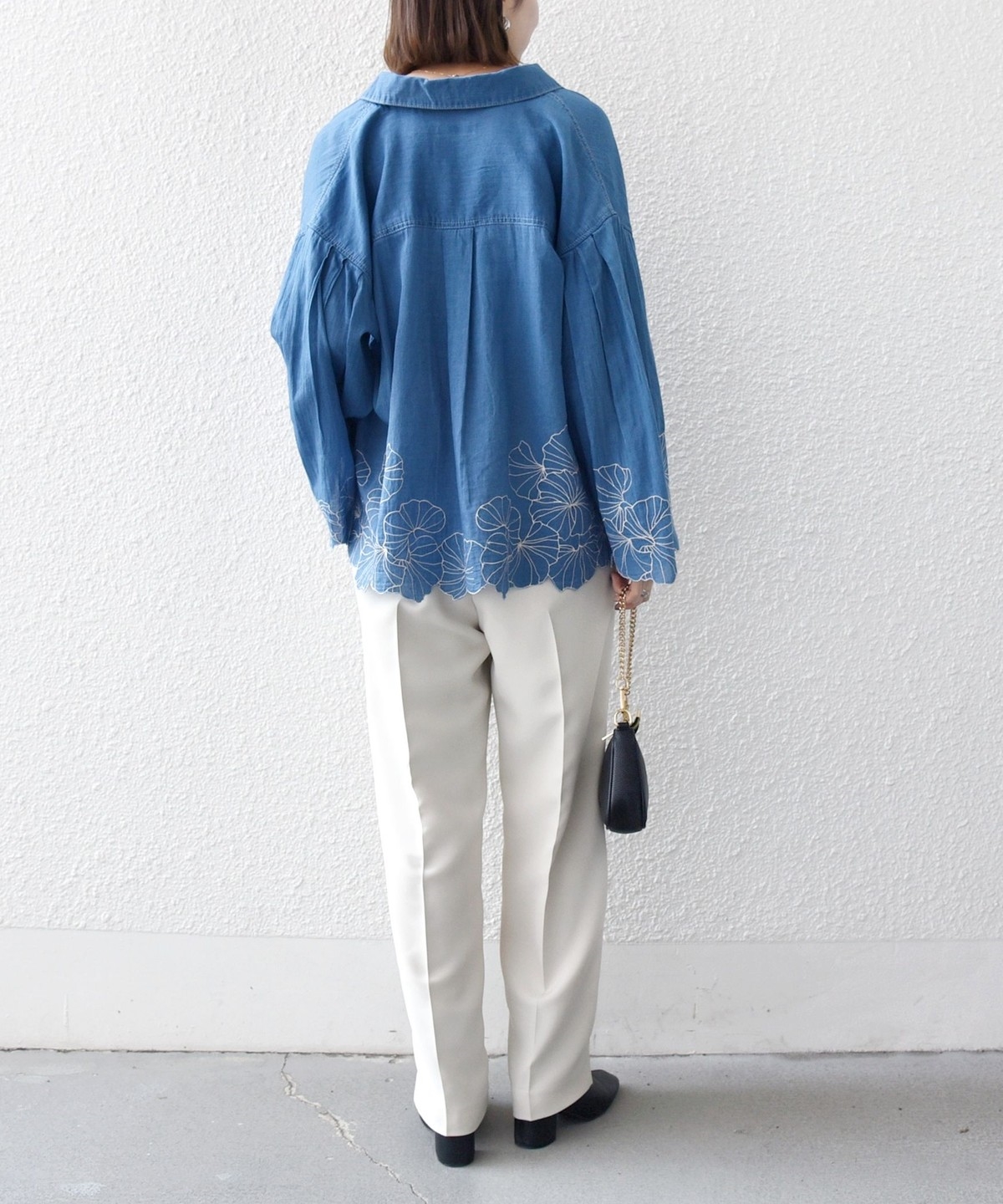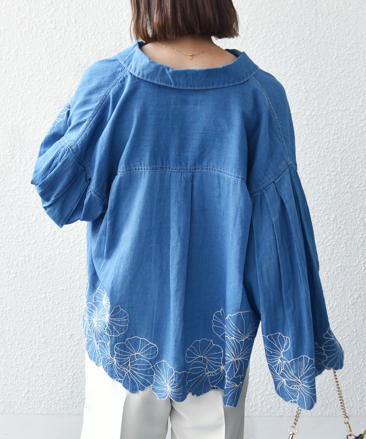 シアーデニム素材にフラワー刺繍を施したシャツブラウス。