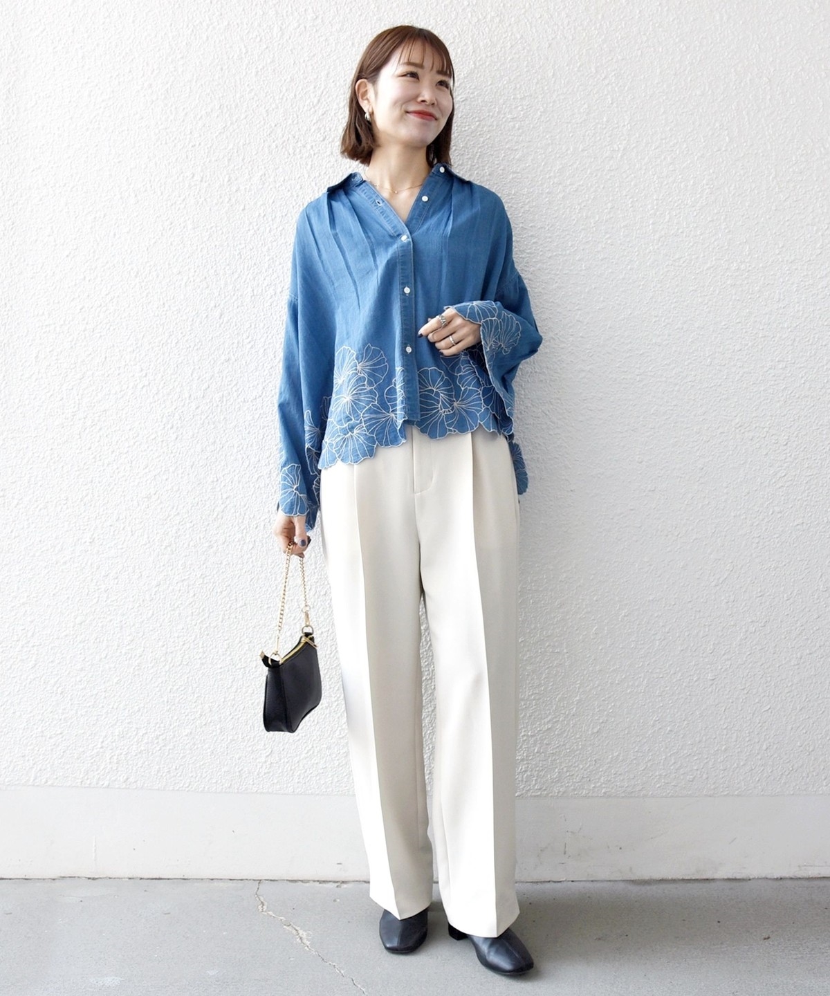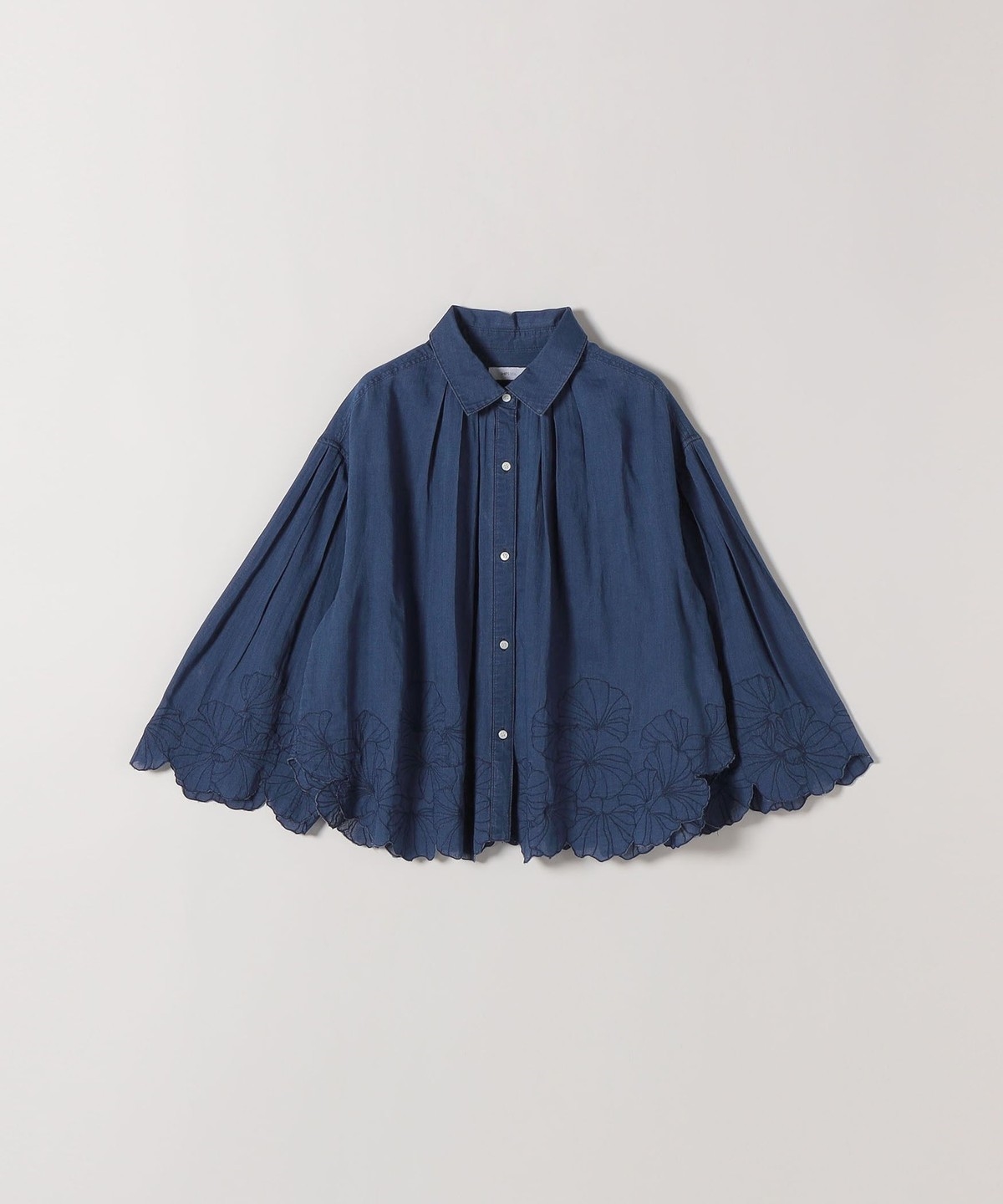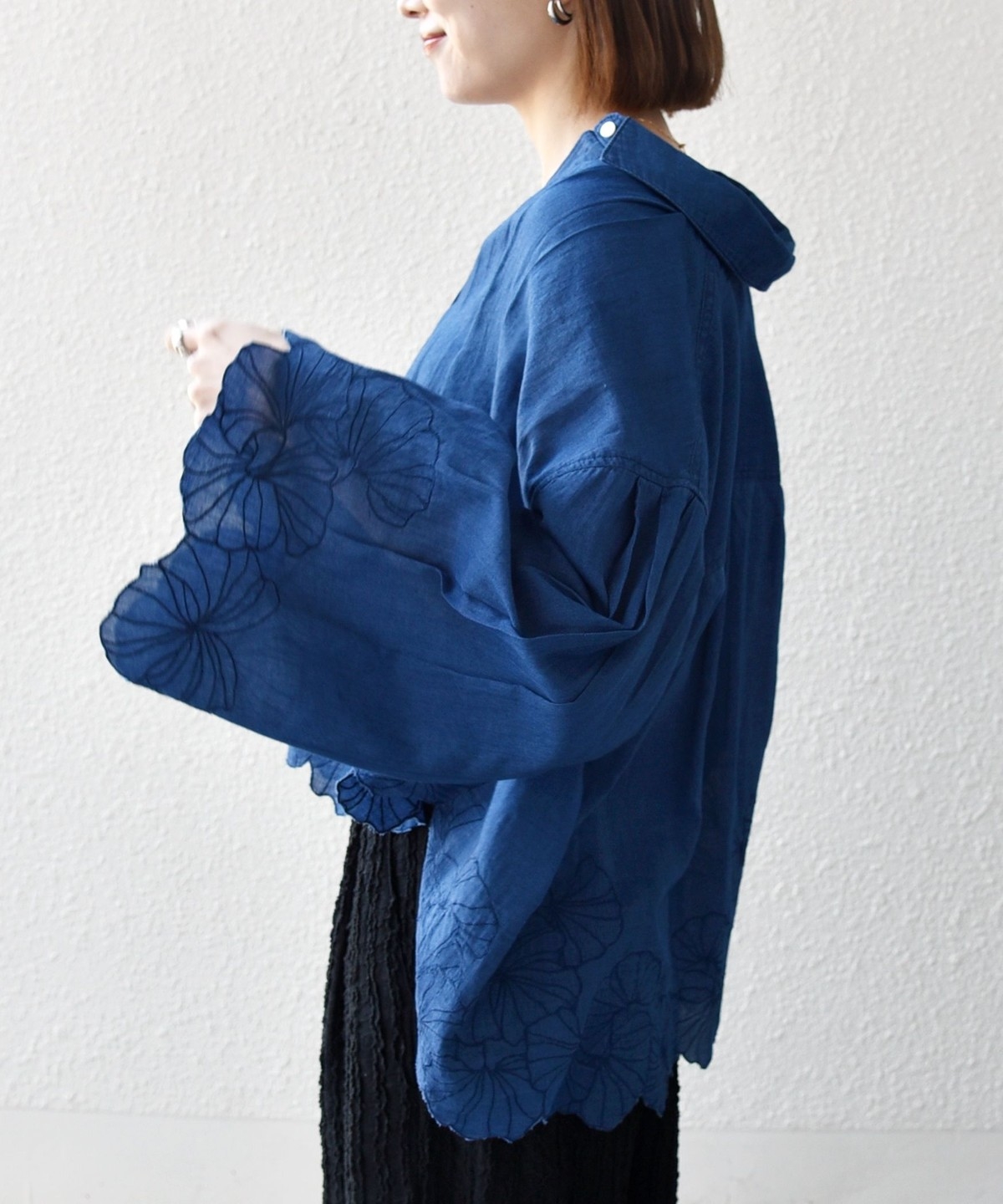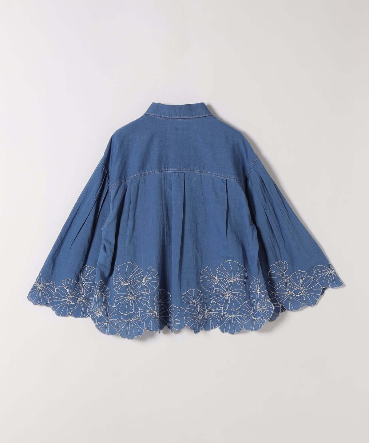 シアーデニム素材にフラワー刺繍を施したシャツブラウス。