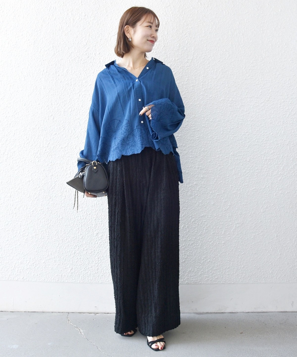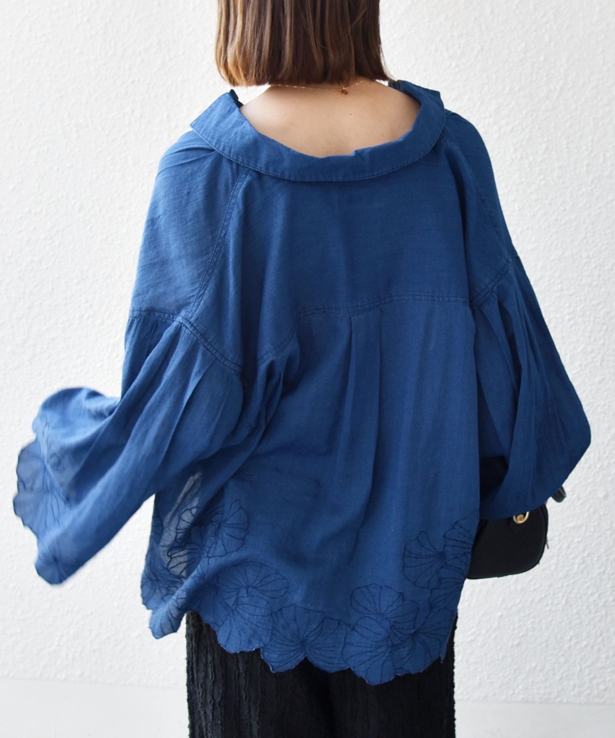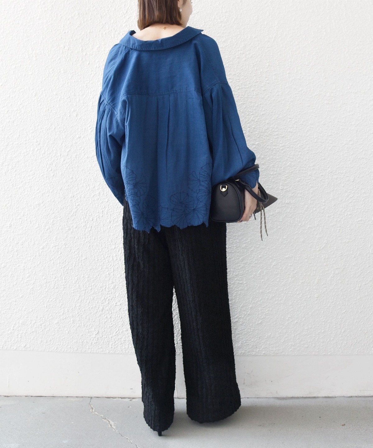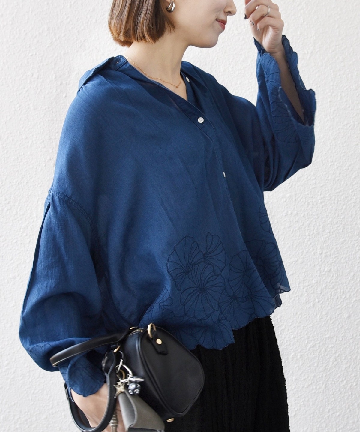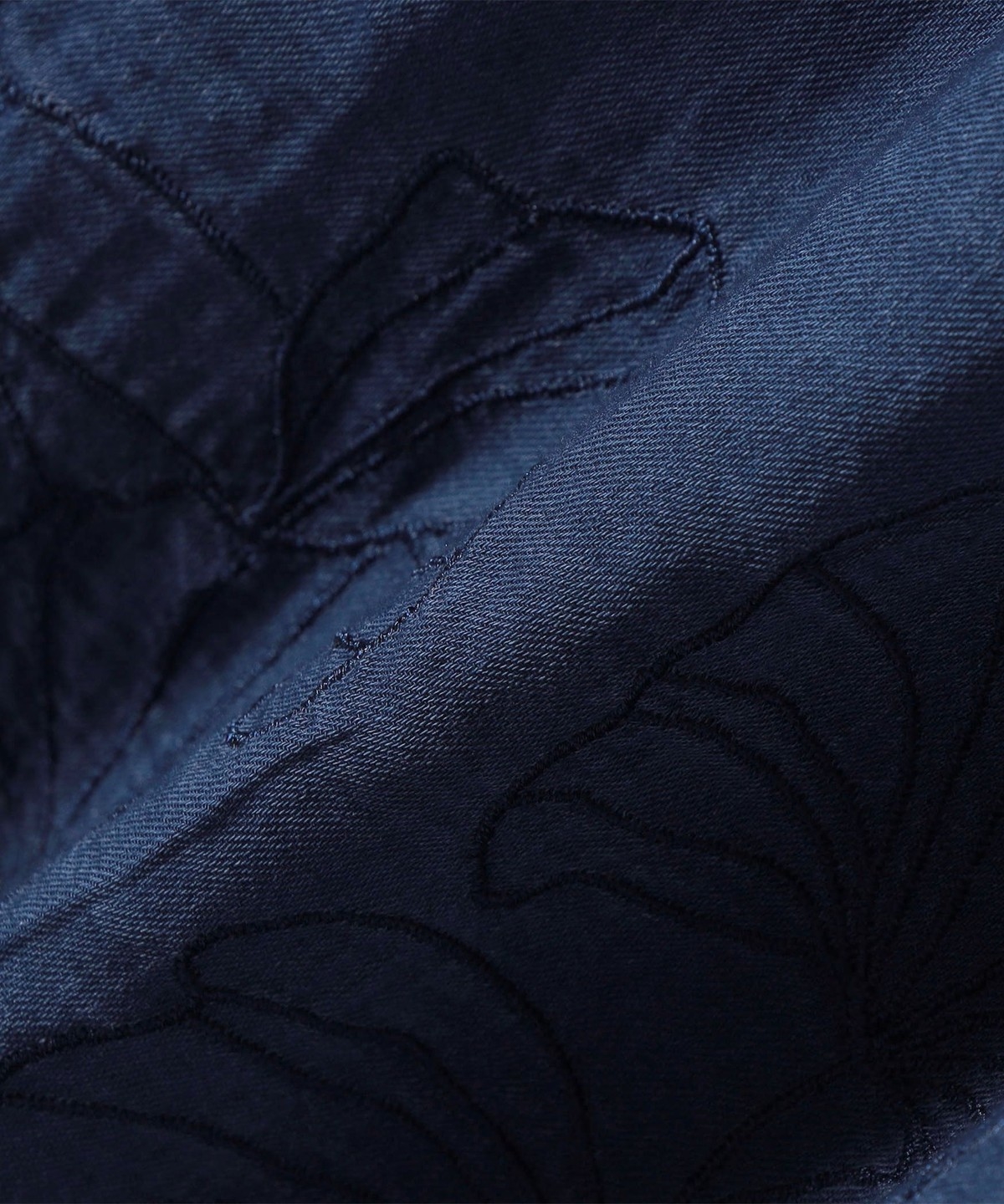 シアーデニム素材にフラワー刺繍を施したシャツブラウス。