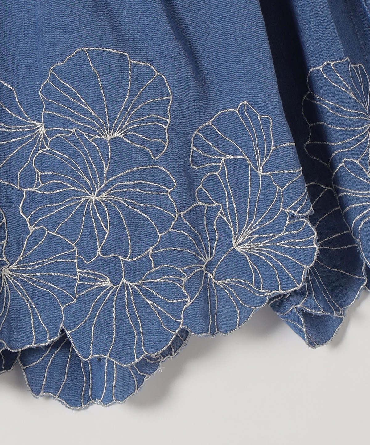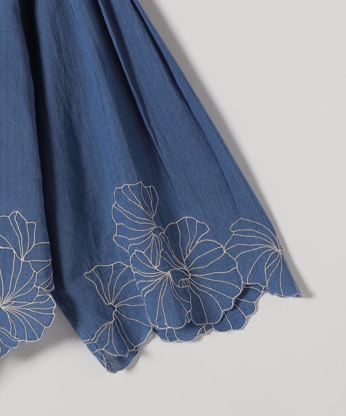 裾には大きなフラワーモチーフの刺繍を贅沢にあしらい、動くたびに刺繍が揺れるフェミニンなデザイン。