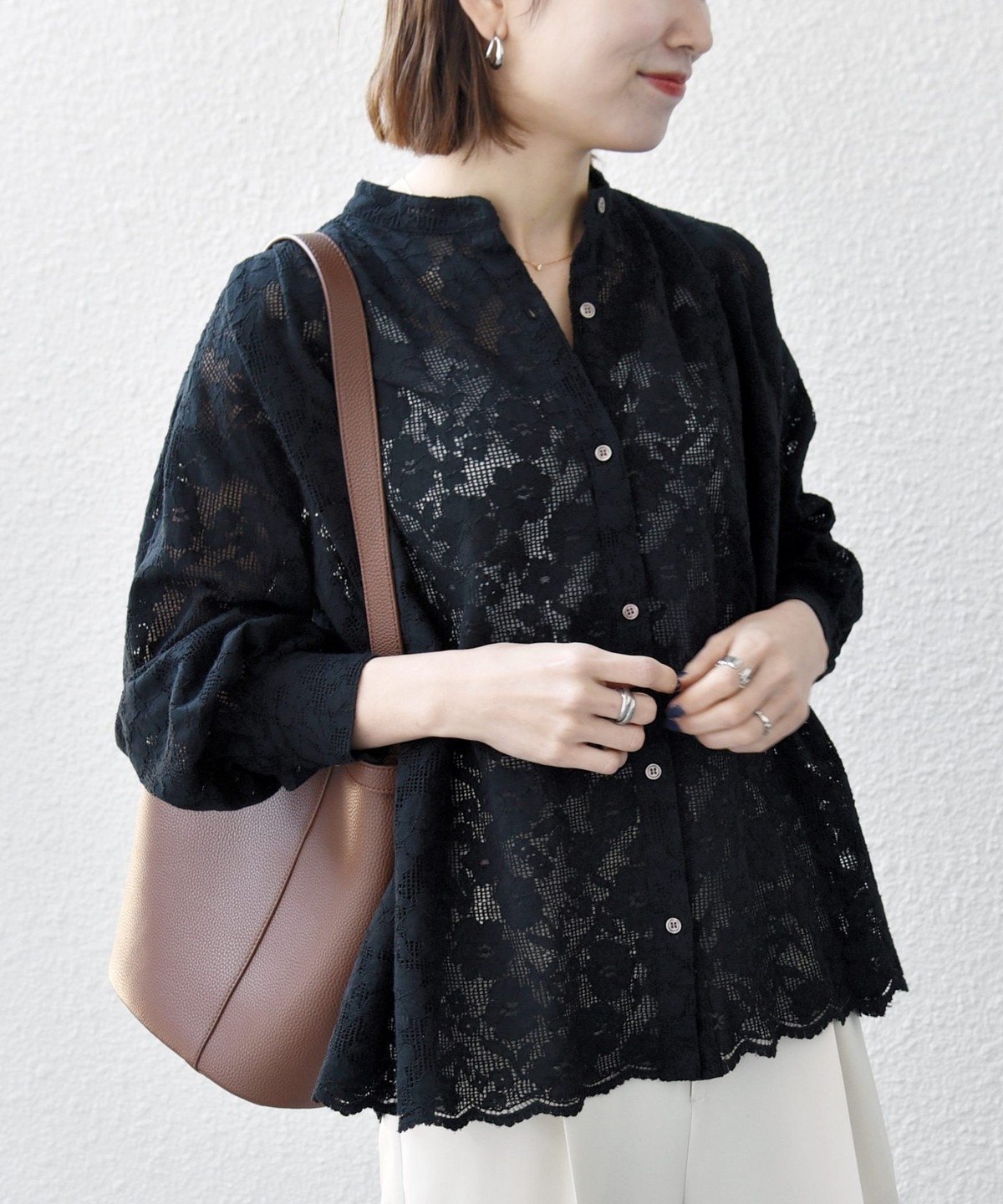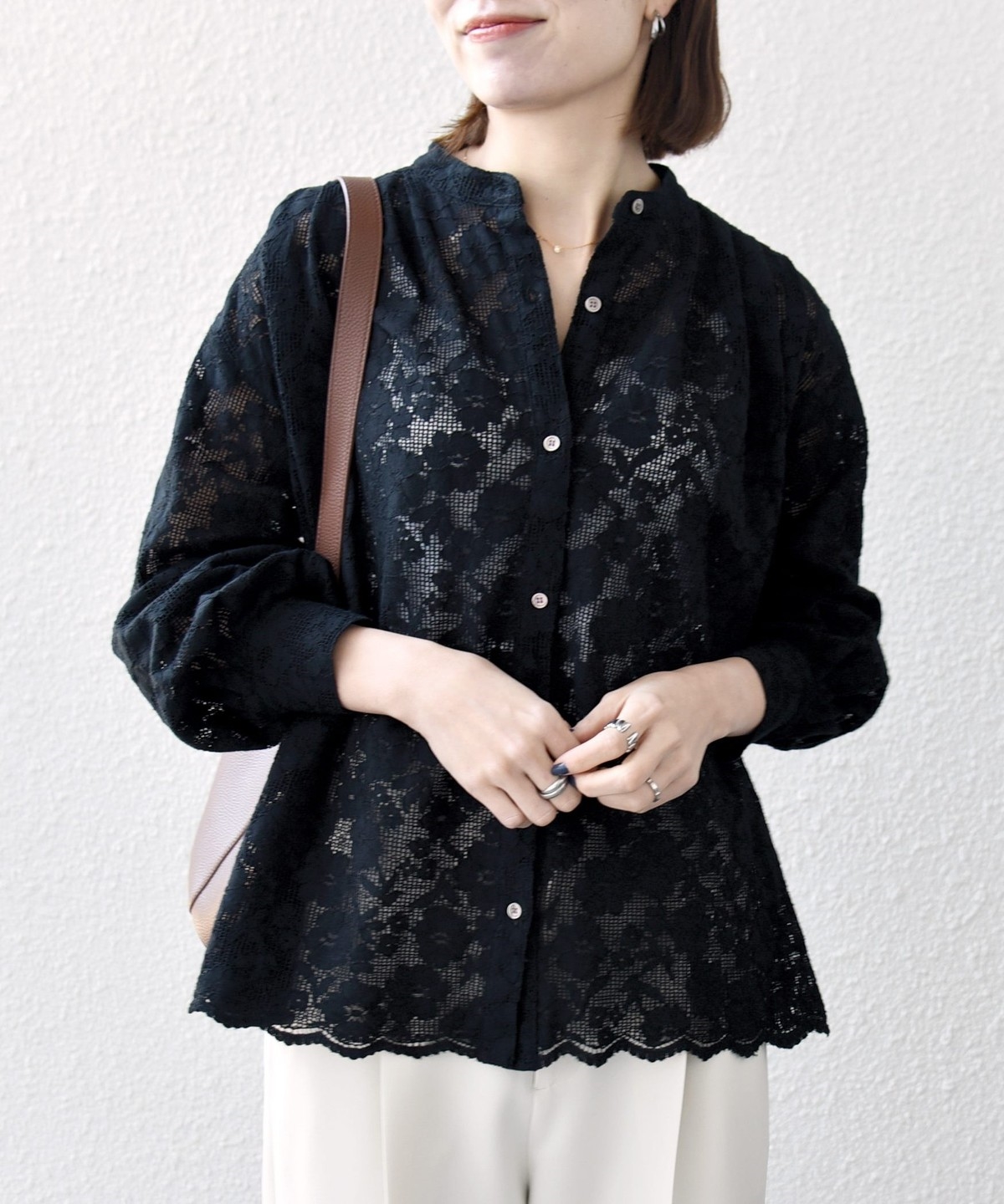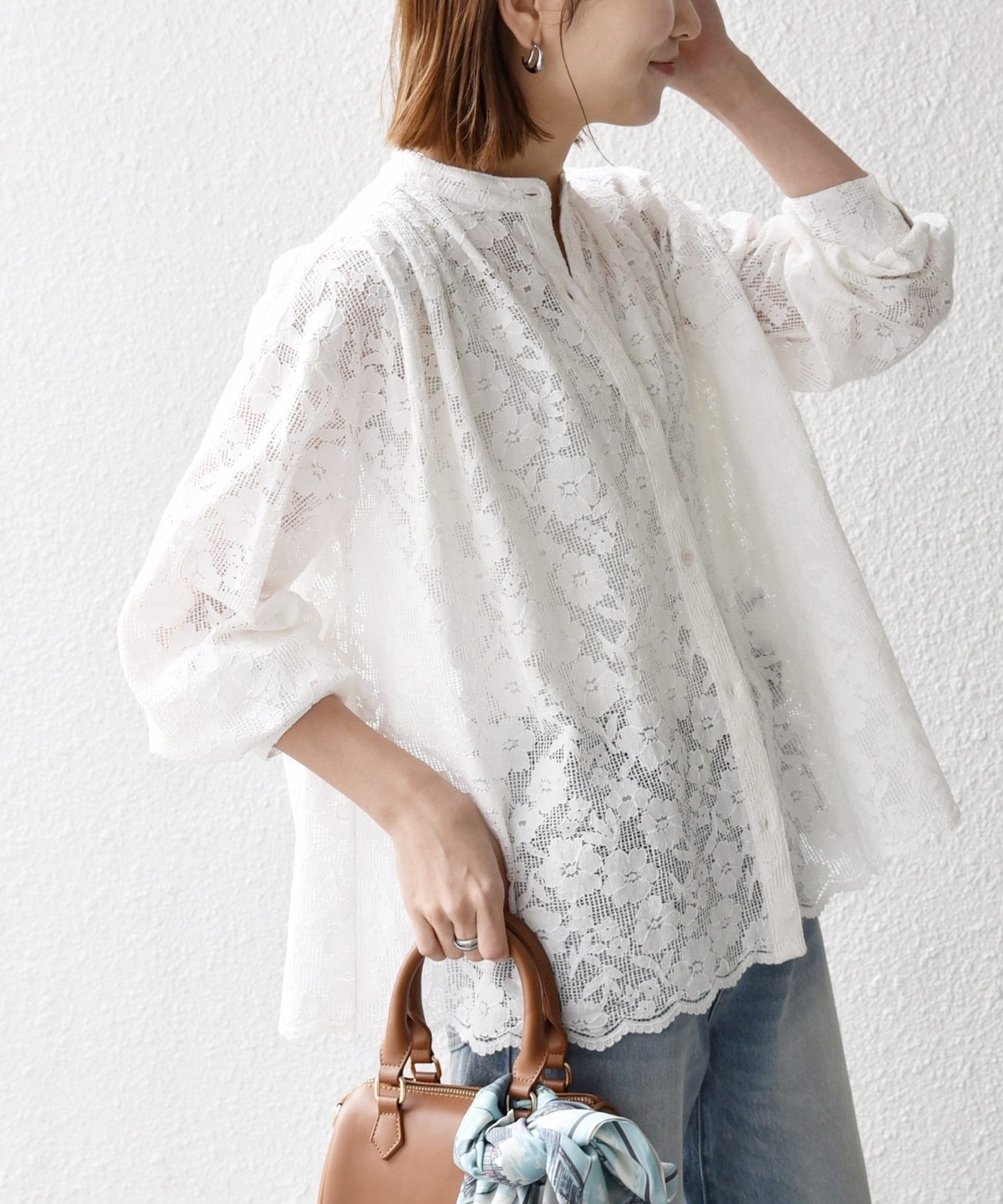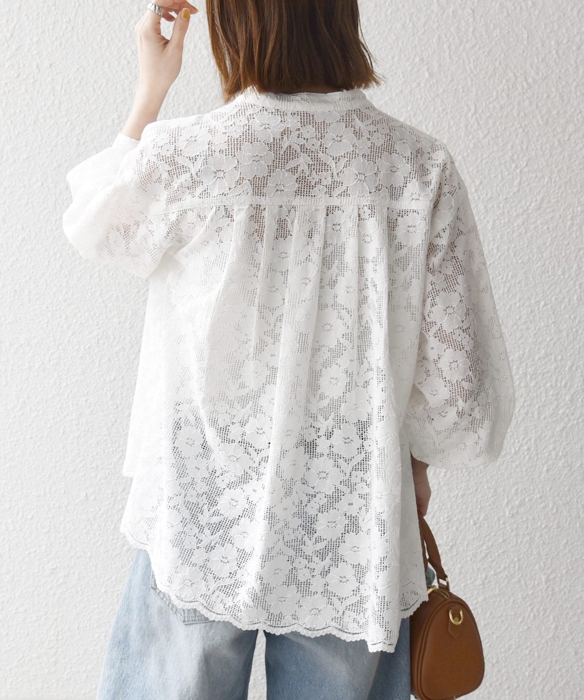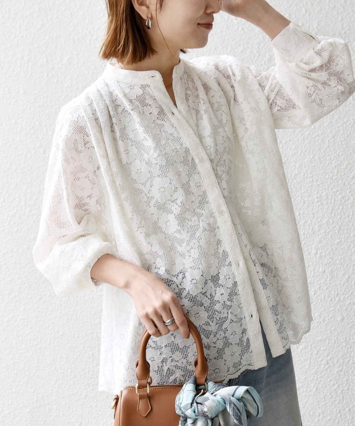 レースならではの透け感とフラワーモチーフの華やかさが魅力のシャツブラウス。