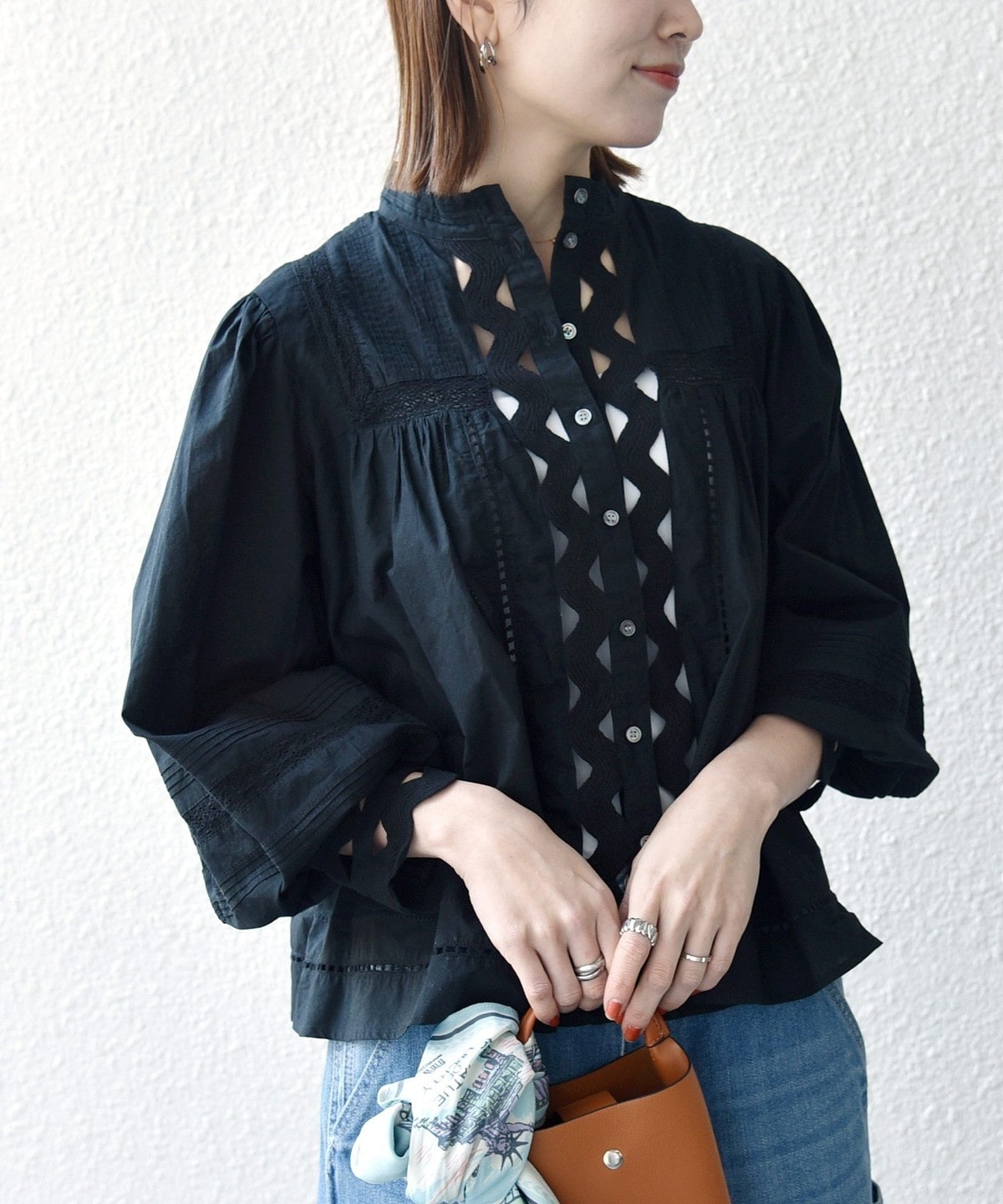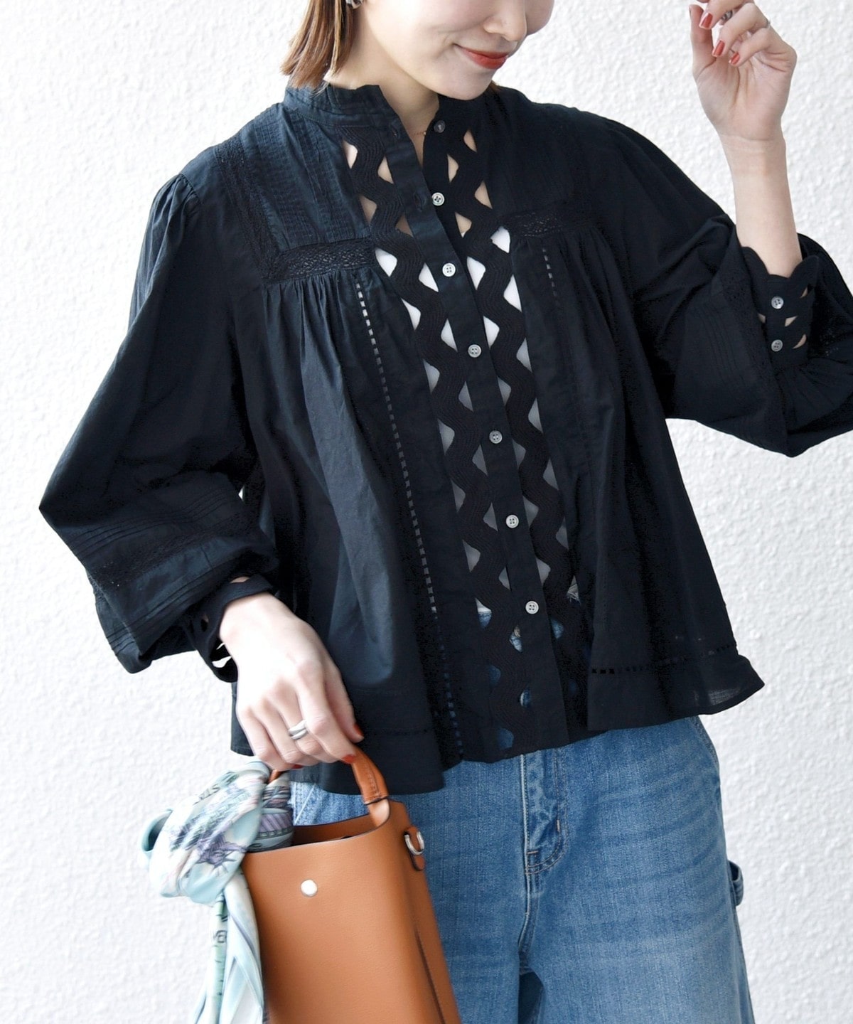 1. 《予約》SHIPS any:〈洗濯機可能〉キャンブリック スタンドカラー レース シャツ ブラウス ブラック