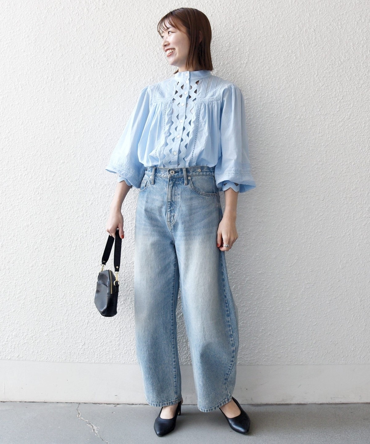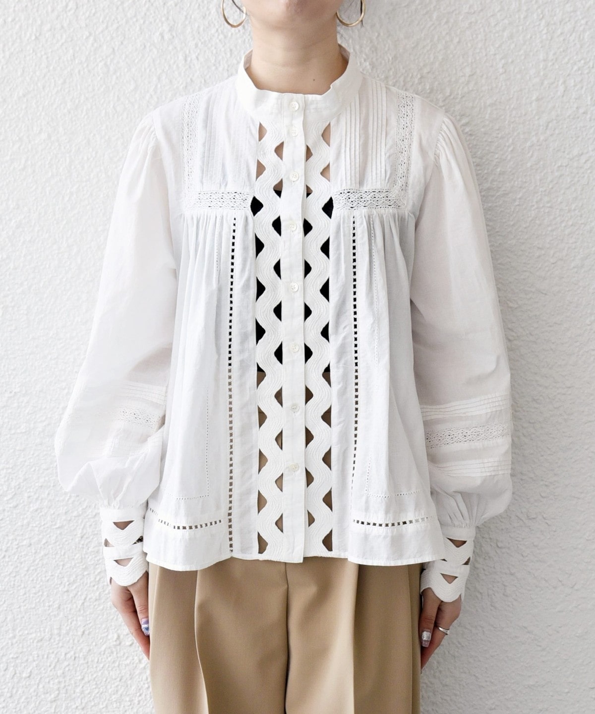 前身頃と袖口にあしらったウェーブ状のレースがポイントのブラウス。