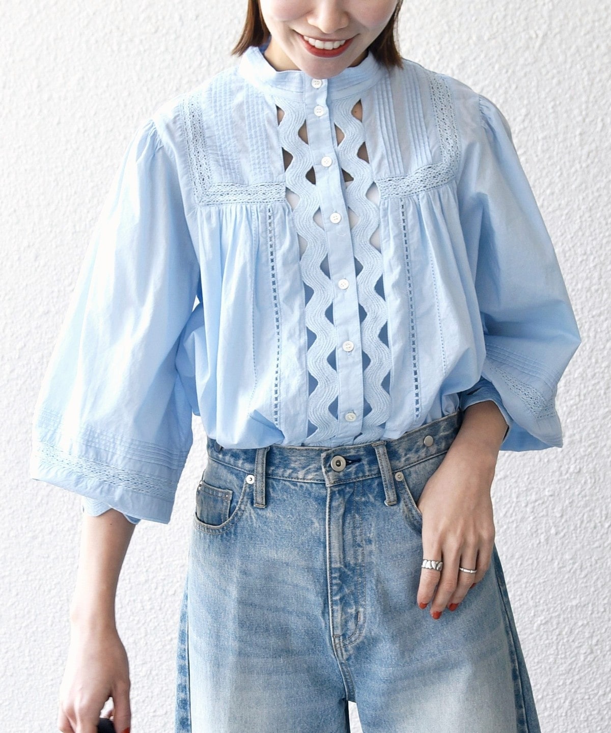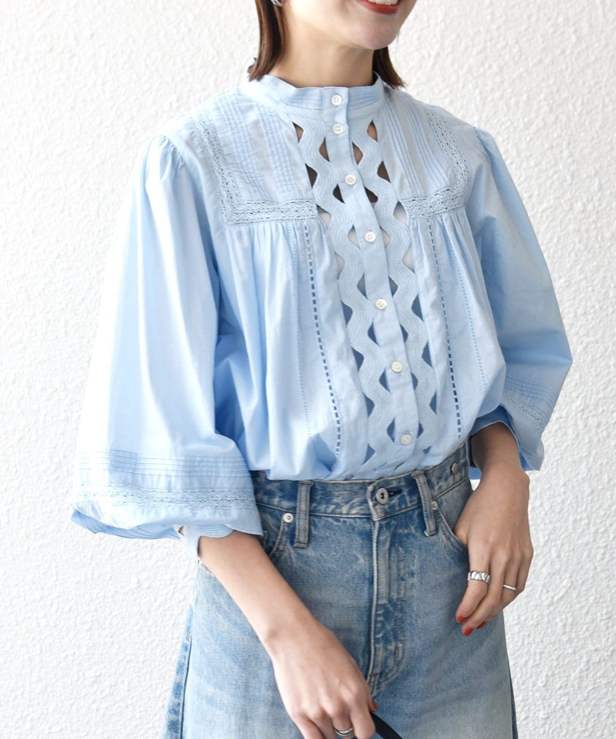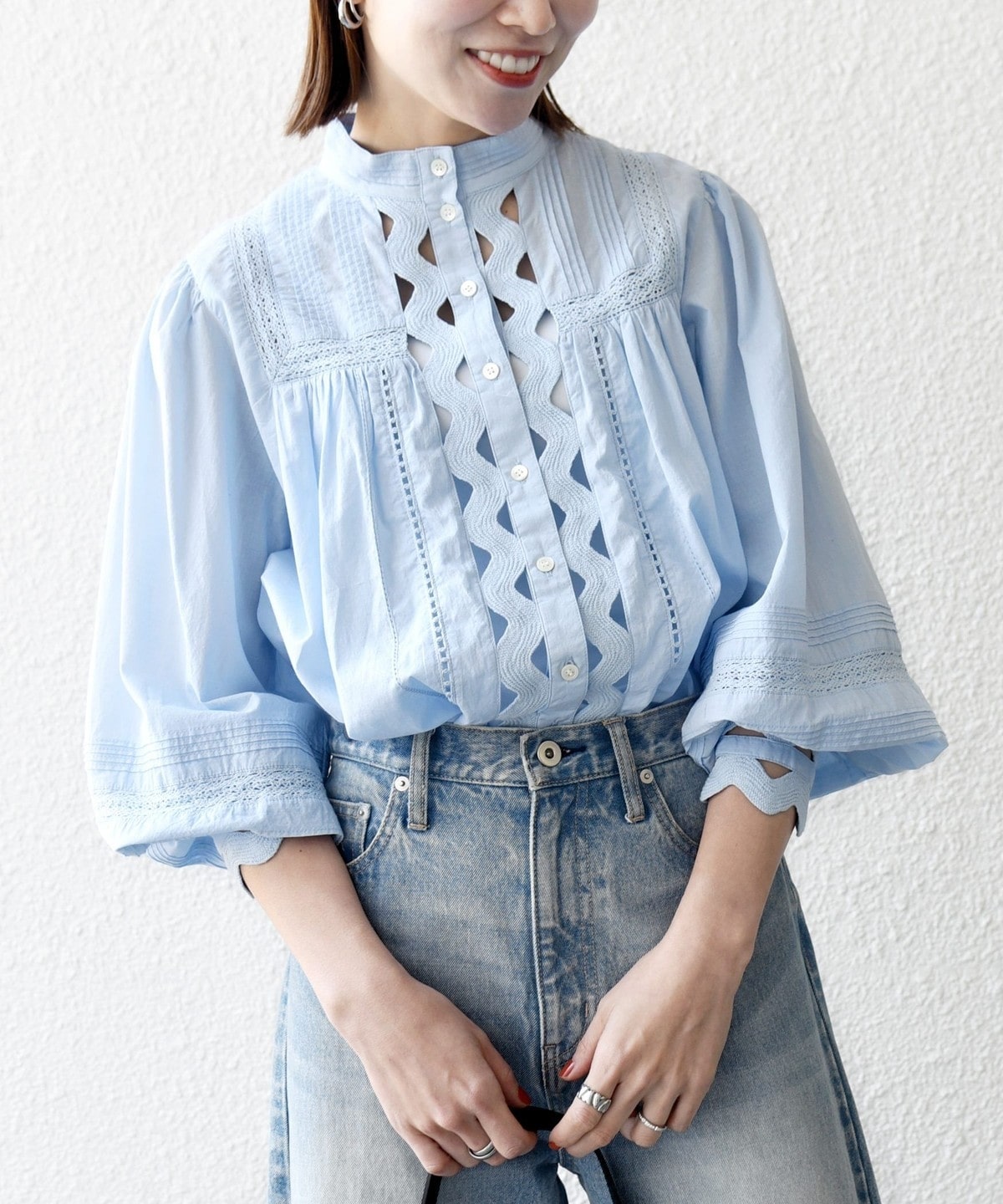 2. 《予約》SHIPS any:〈洗濯機可能〉キャンブリック スタンドカラー レース シャツ ブラウス ライトブルー