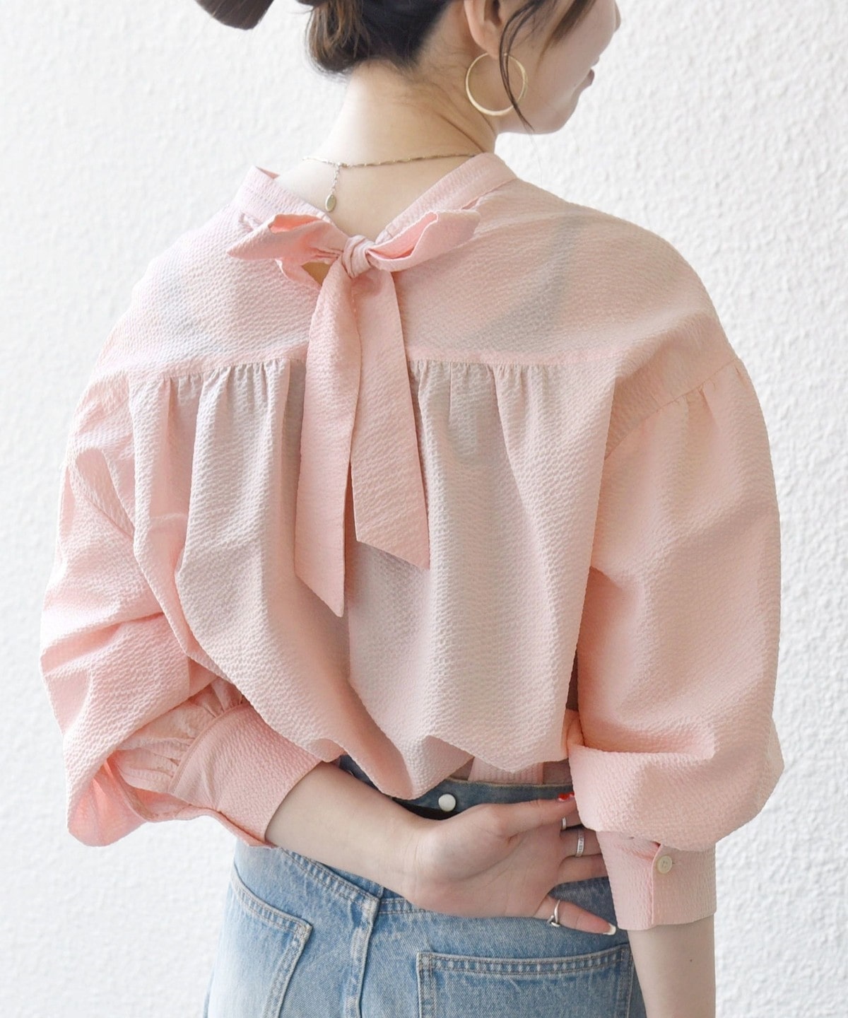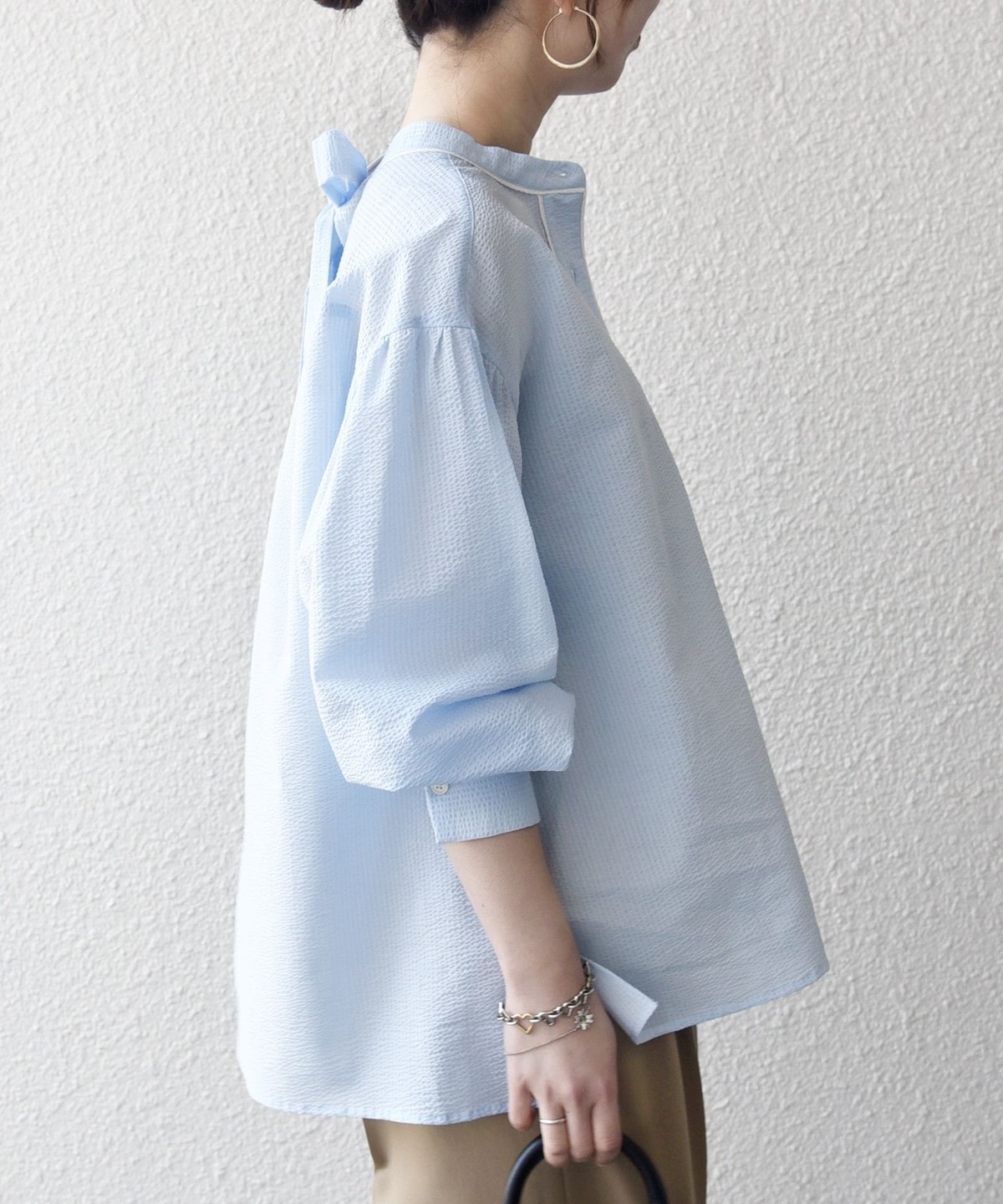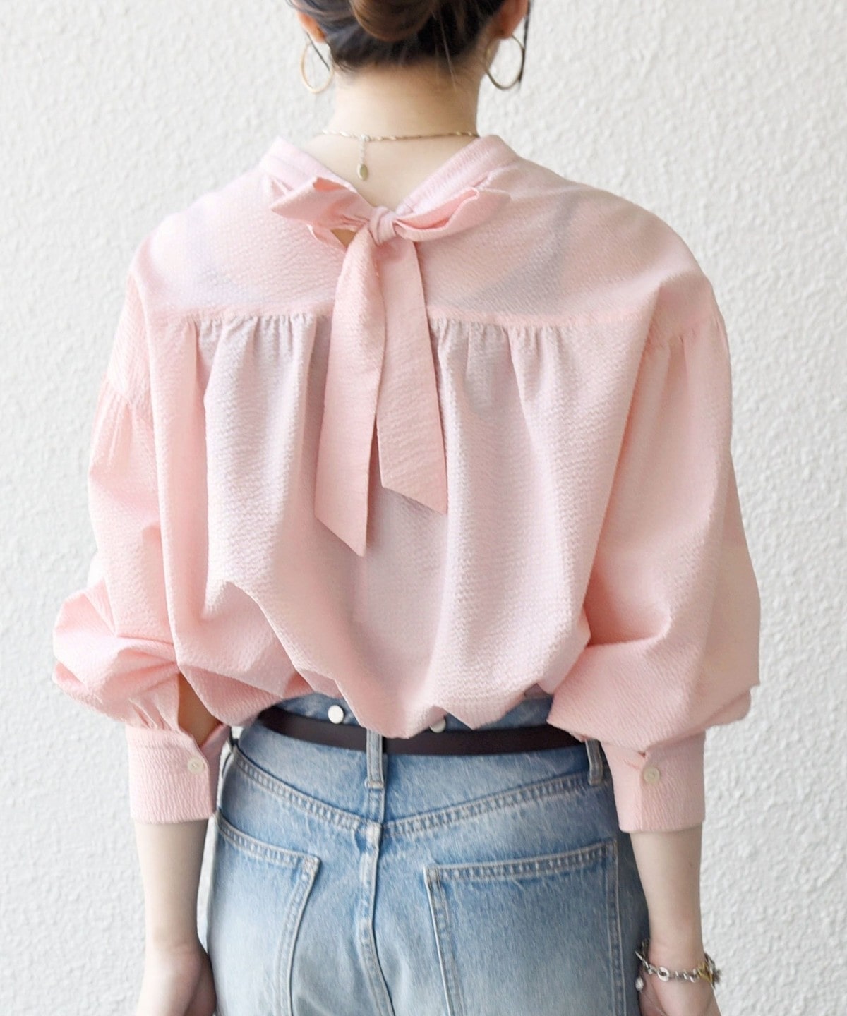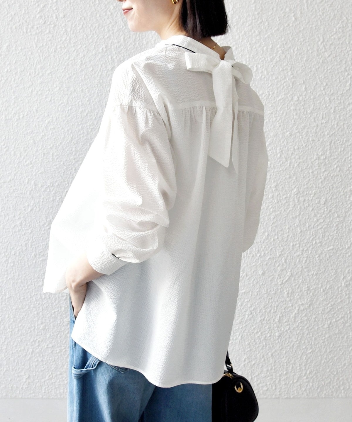 バンドカラーですっきりとした印象に、袖やヨーク下のギャザーとバックリボンで、フェミニン要素もたっぷりの一枚です。