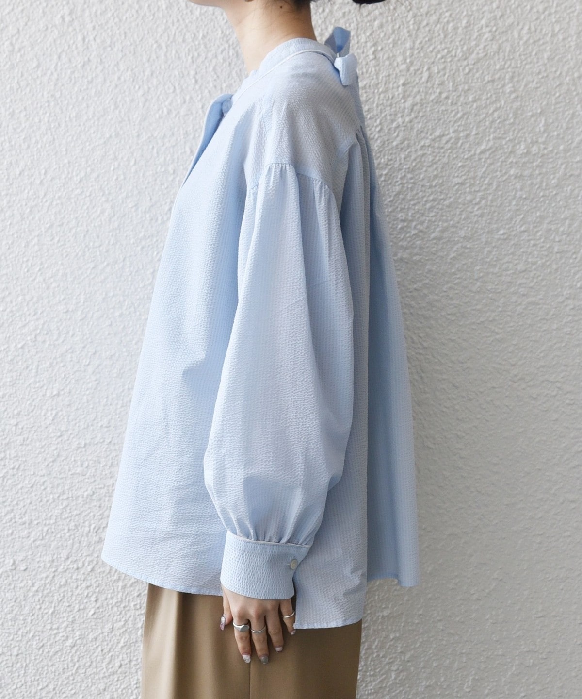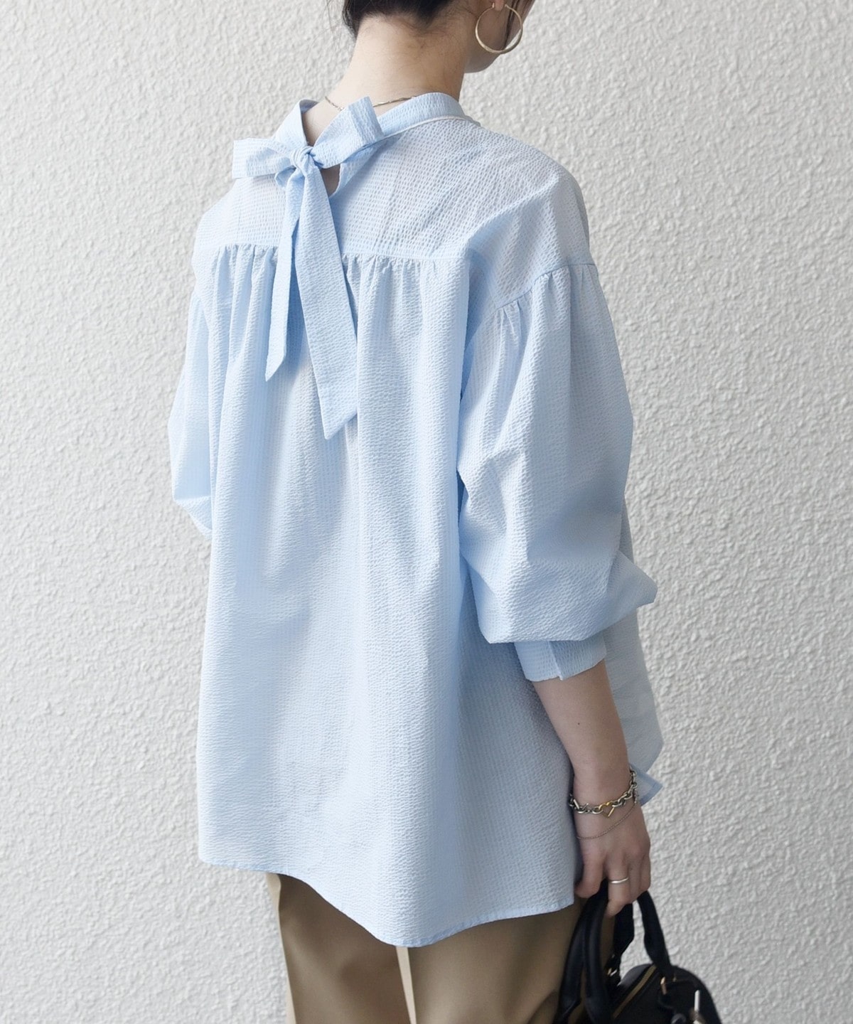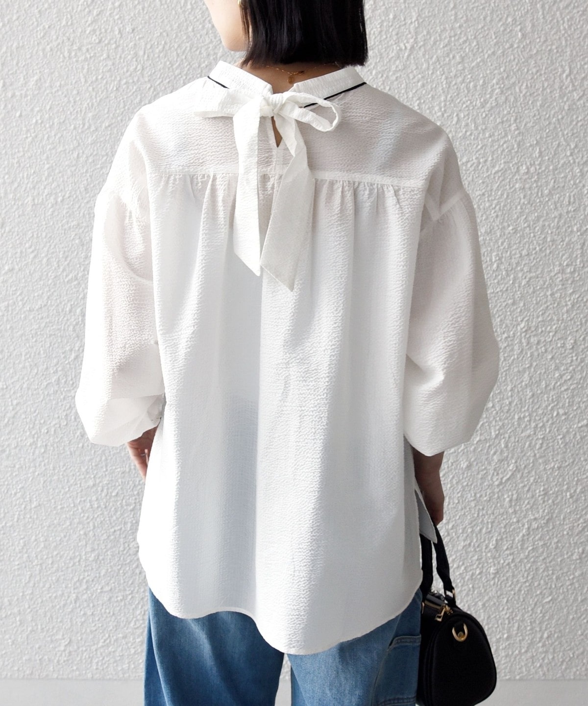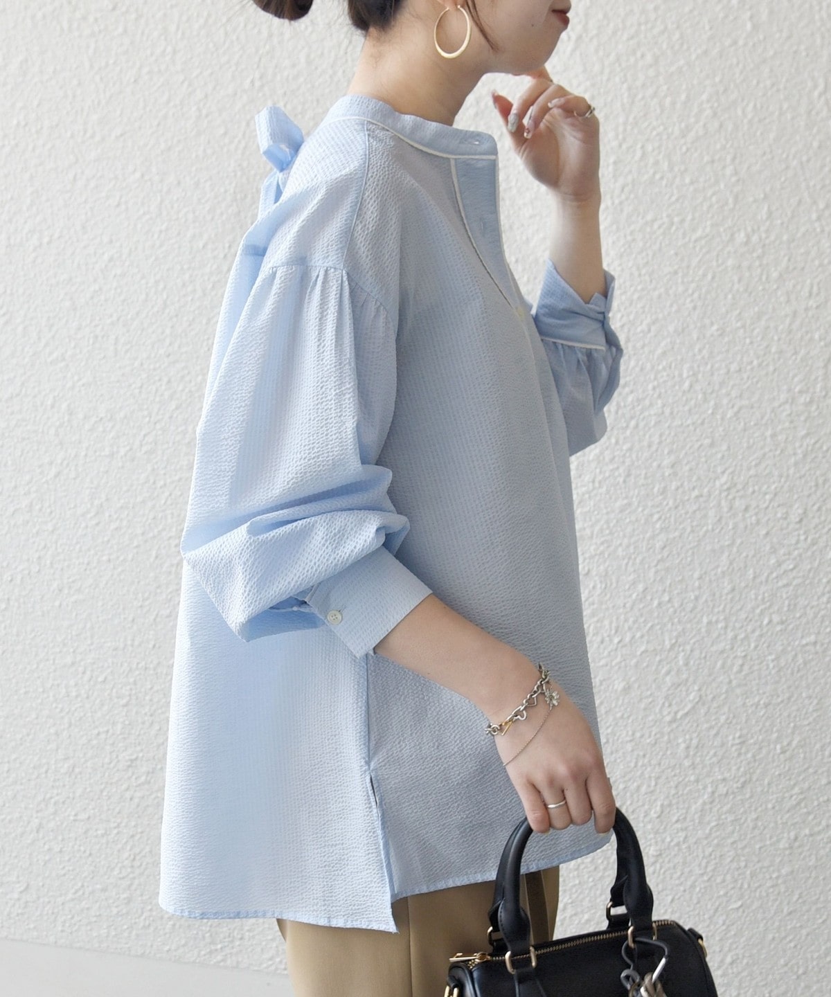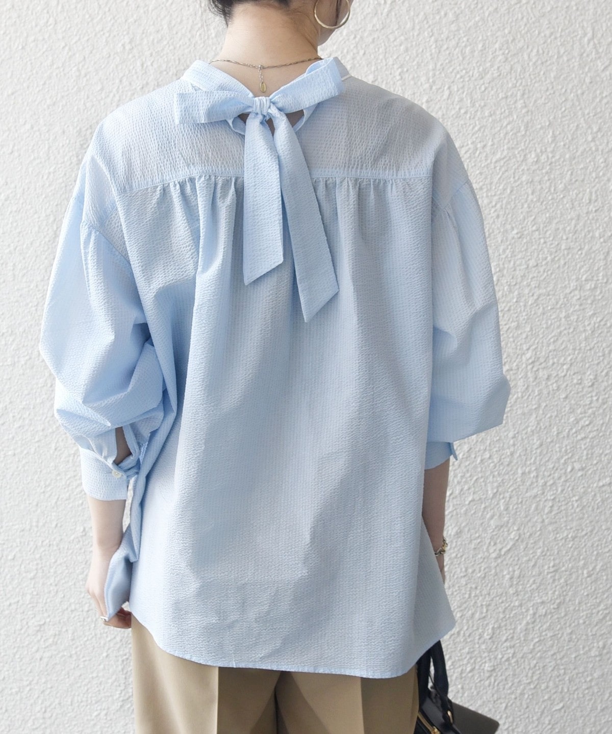 バンドカラーですっきりとした印象に、袖やヨーク下のギャザーとバックリボンで、フェミニン要素もたっぷりの一枚です。