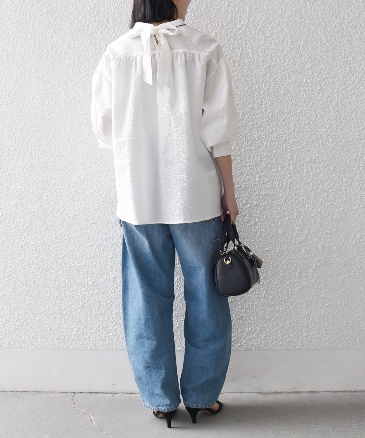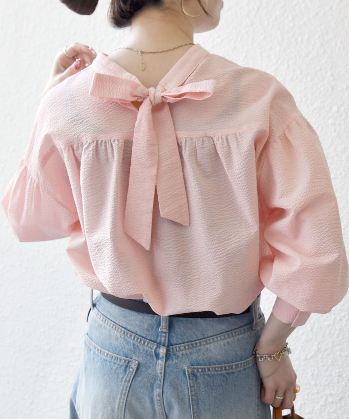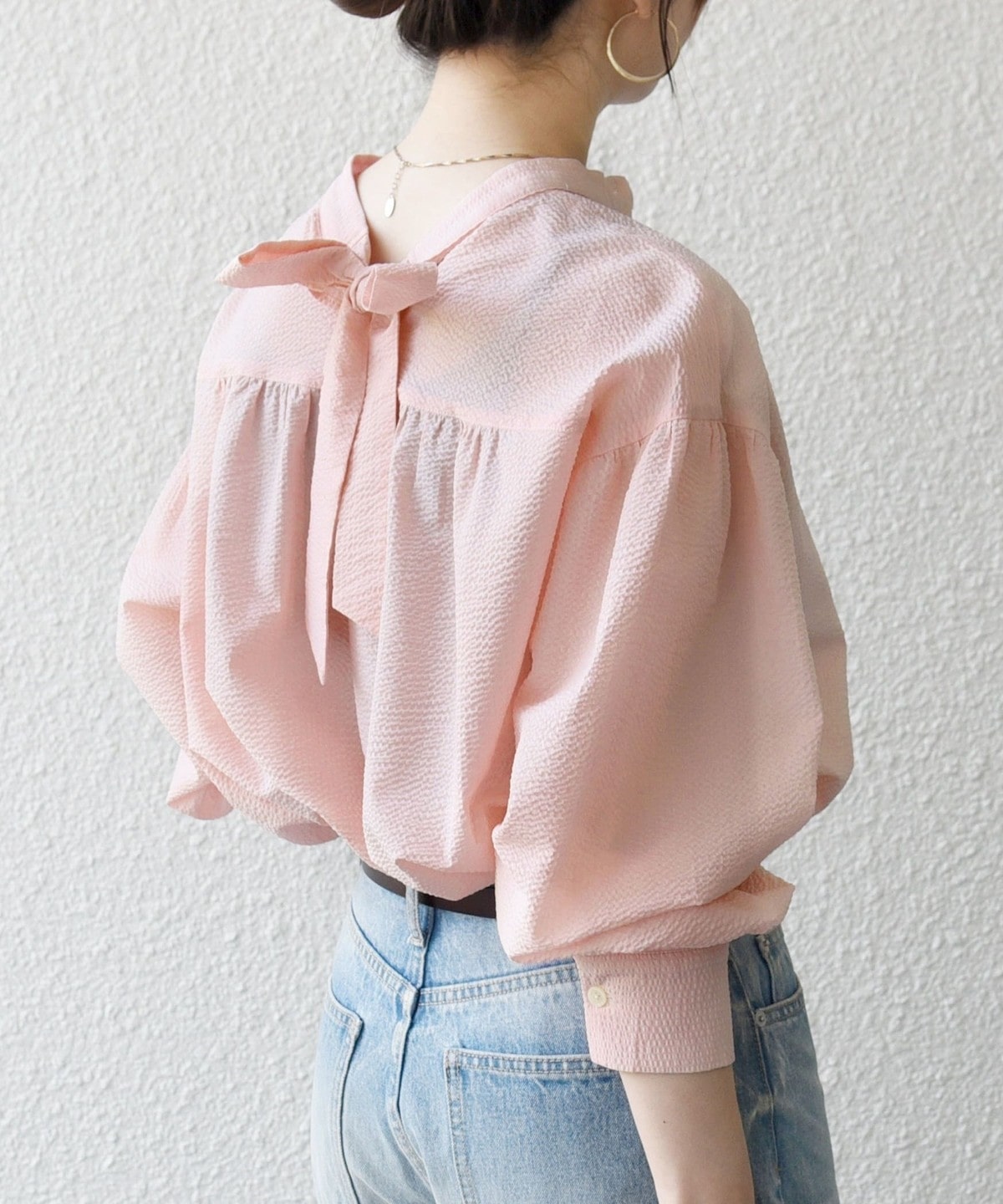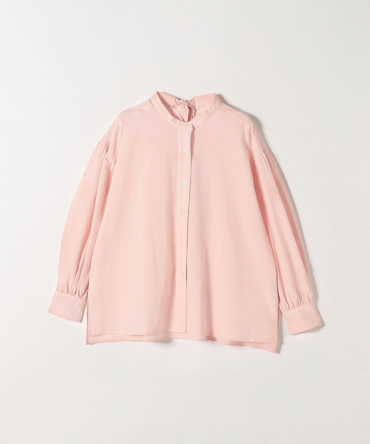 バンドカラーですっきりとした印象に、袖やヨーク下のギャザーとバックリボンで、フェミニン要素もたっぷりの一枚です。