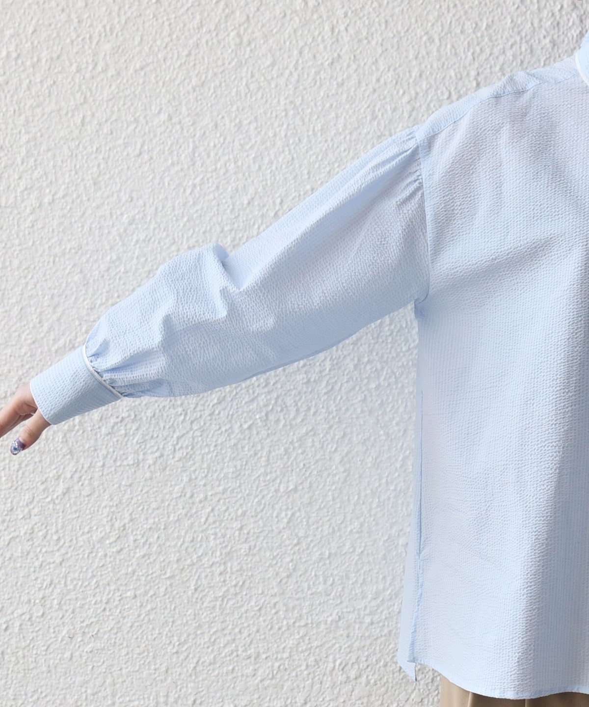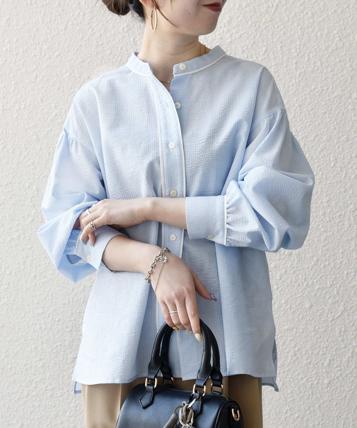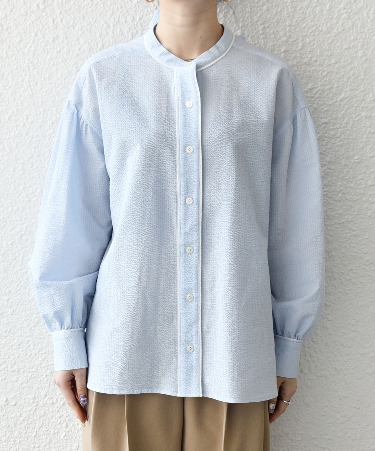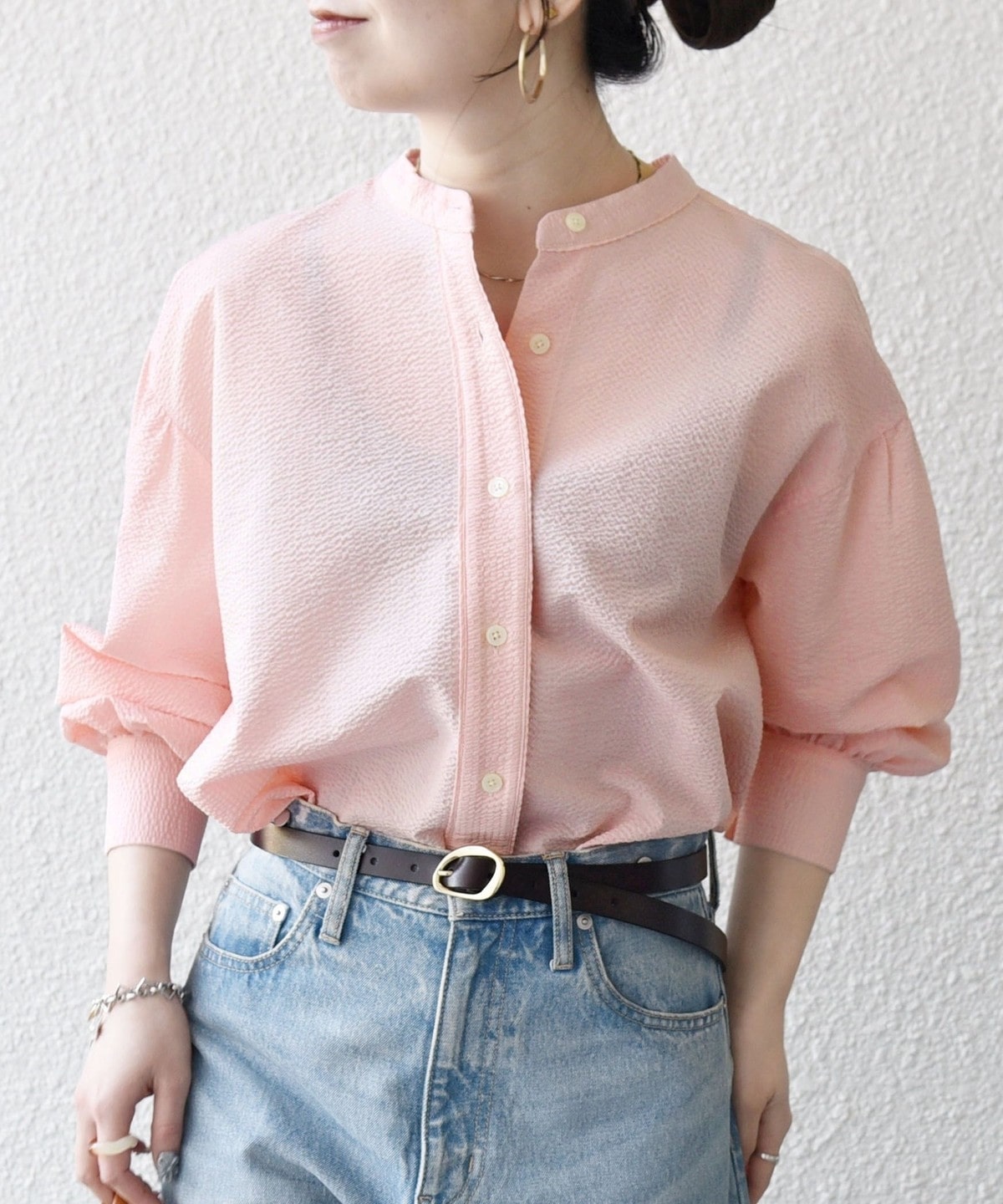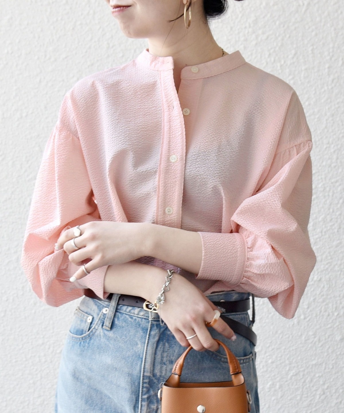 バンドカラーですっきりとした印象に、袖やヨーク下のギャザーとバックリボンで、フェミニン要素もたっぷりの一枚です。