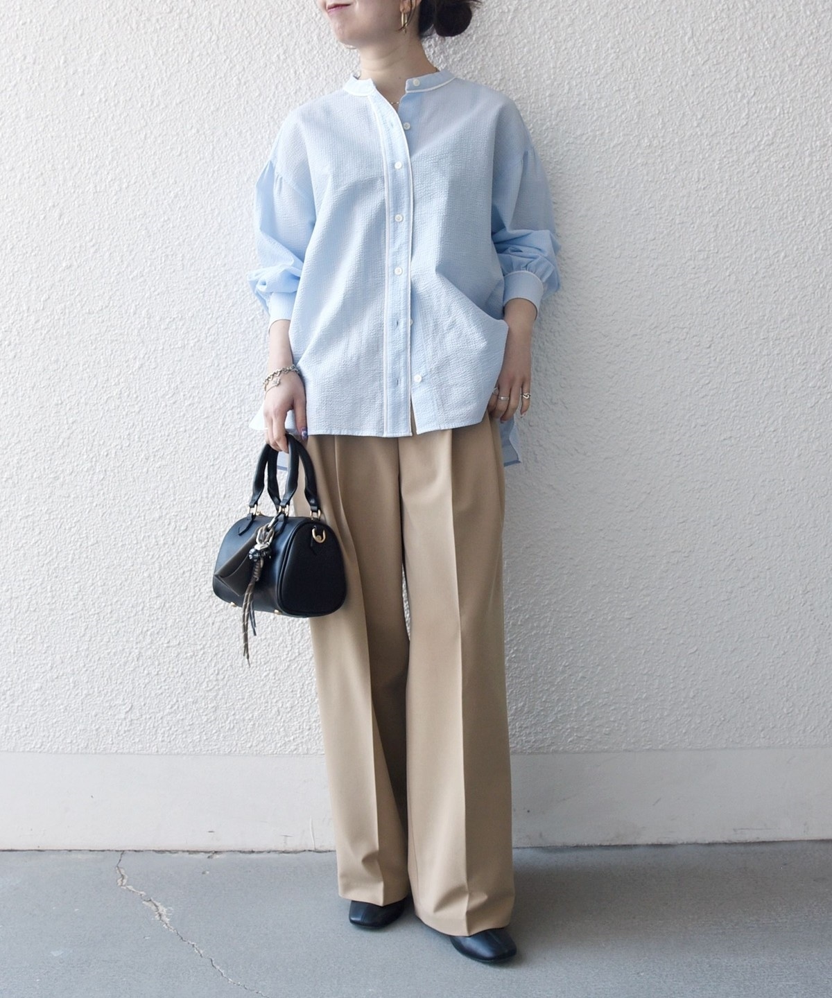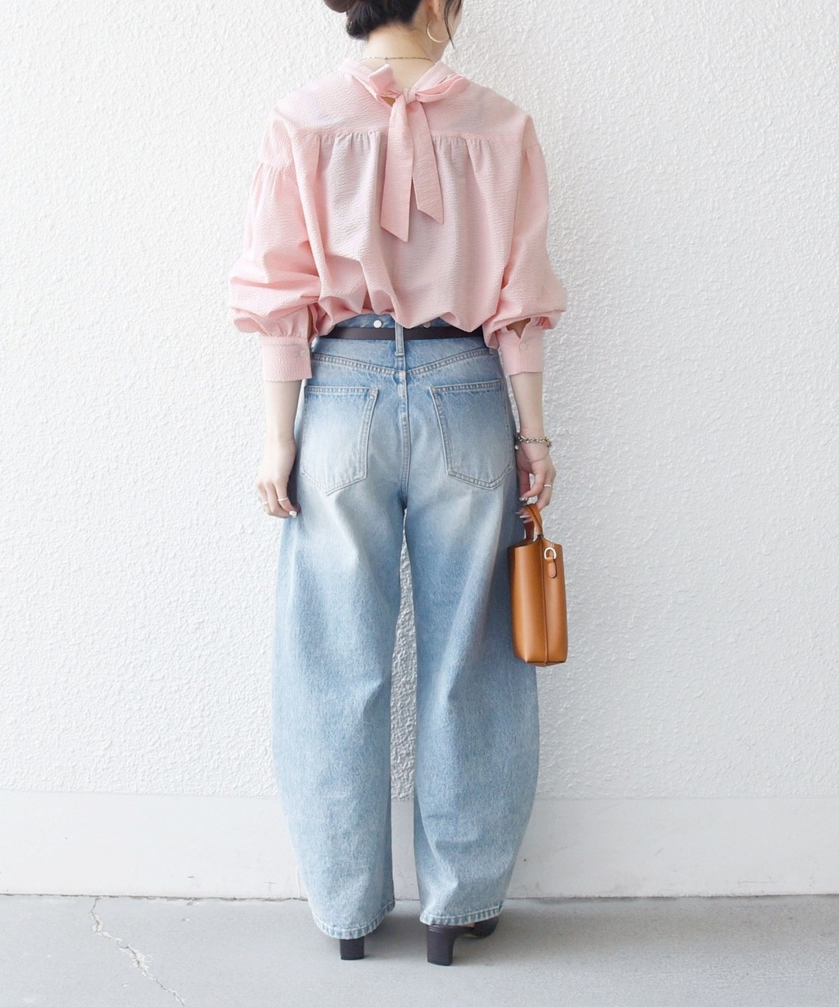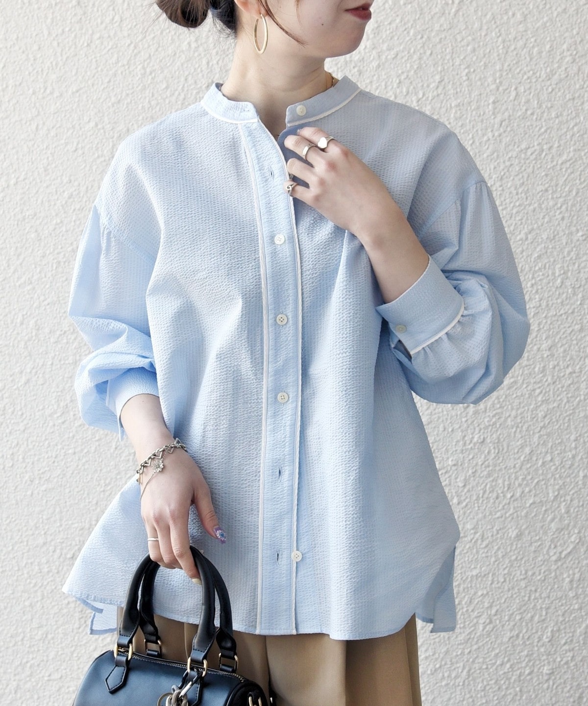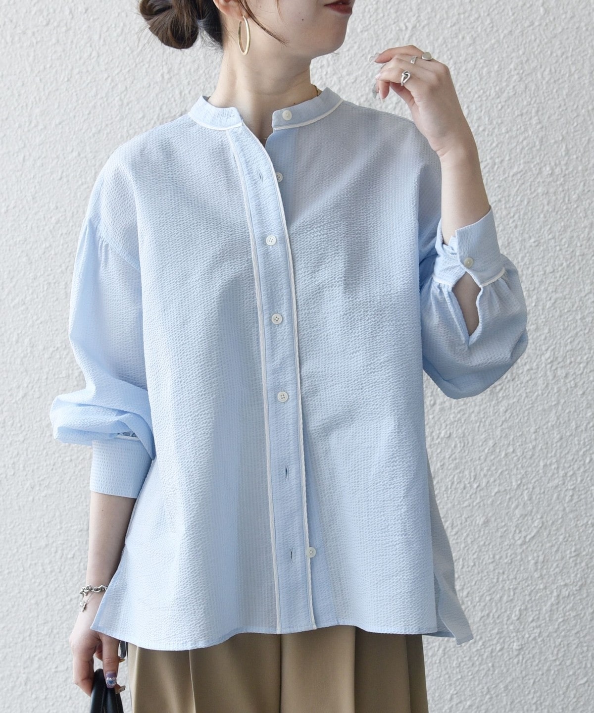 バンドカラーですっきりとした印象に、袖やヨーク下のギャザーとバックリボンで、フェミニン要素もたっぷりの一枚です。