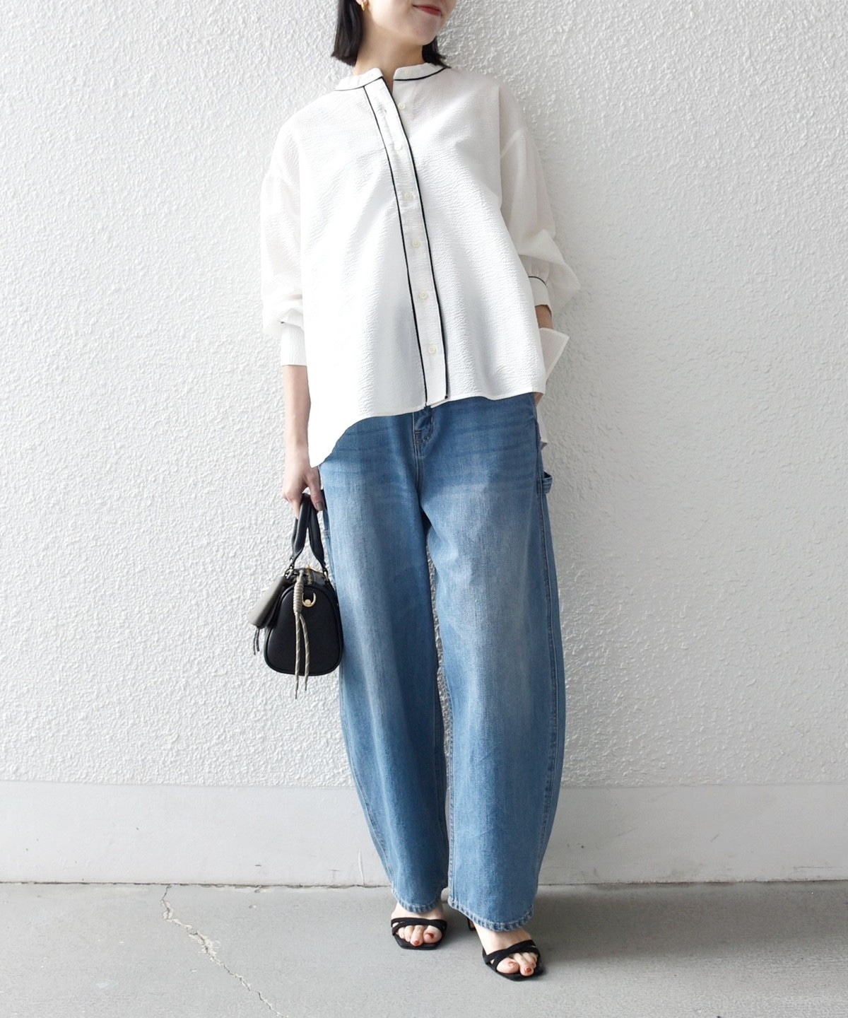 オフホワイトとライトブルーは、襟元・前立て・袖口にバイカラーを施し、さりげなくメリハリをプラス。