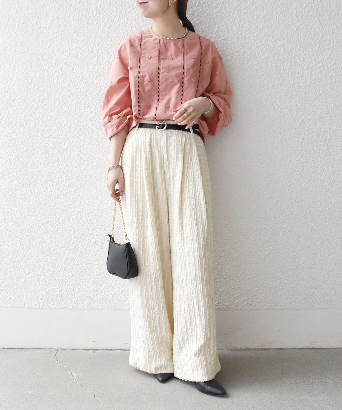 大人フェミニンな印象のアイテムなので、デニムやチノパンなどカジュアルなパンツと好相性。