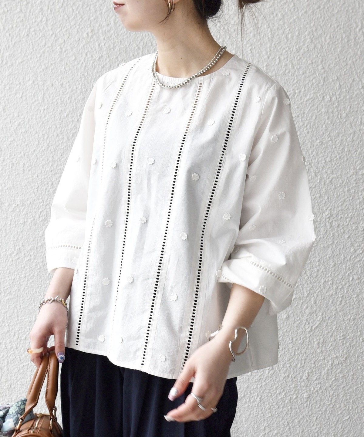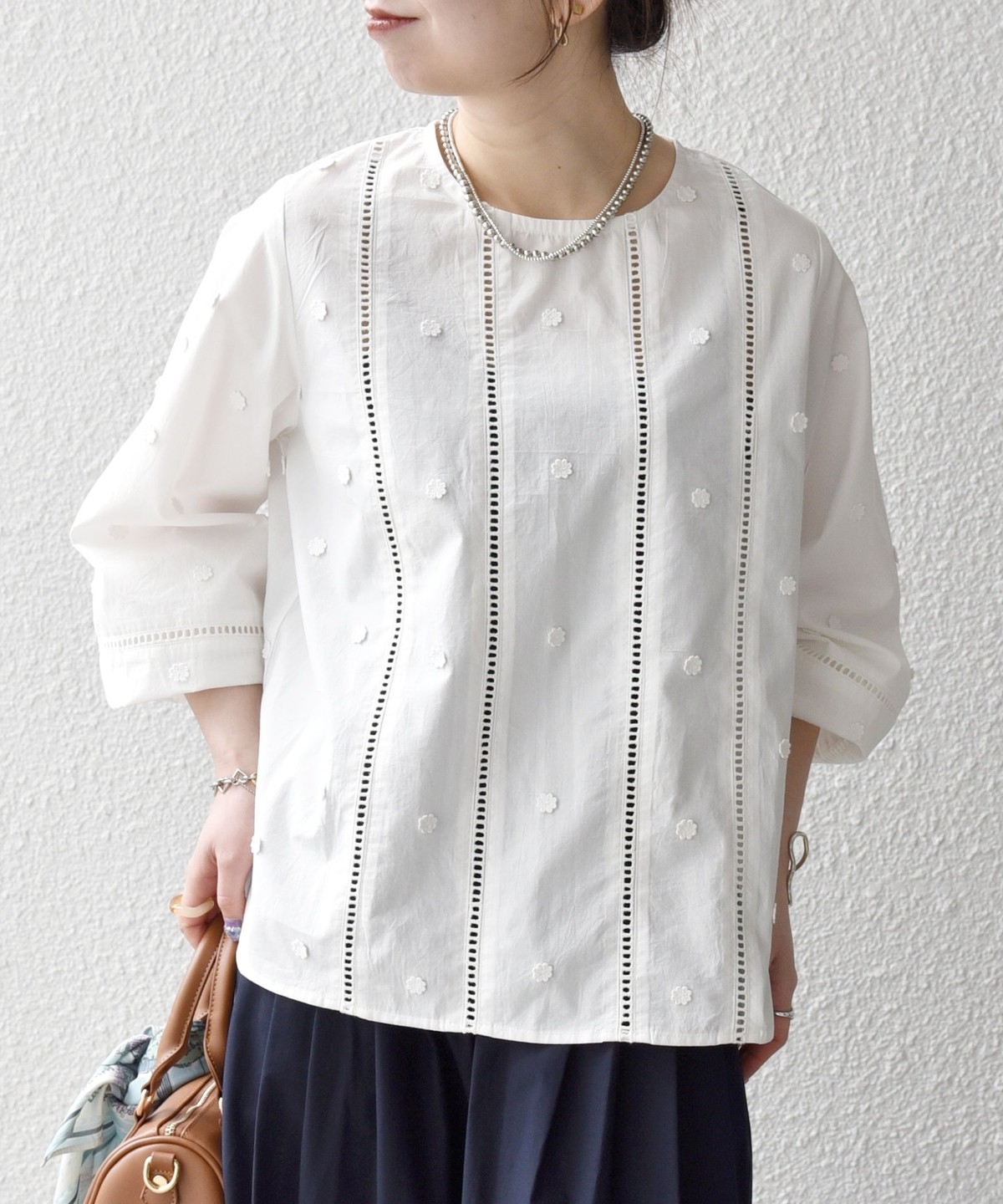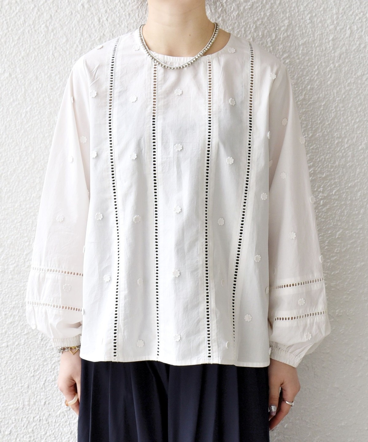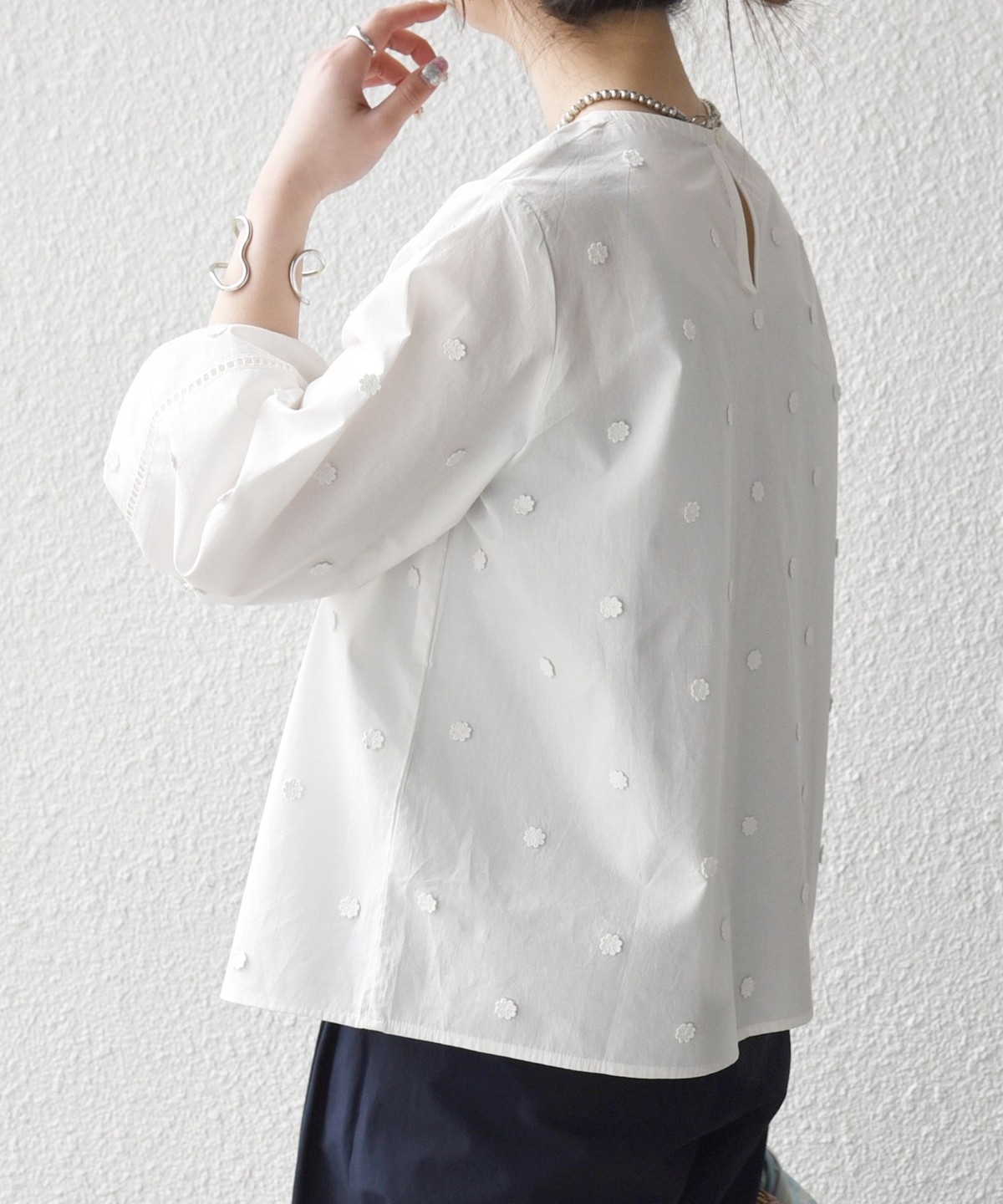 小さなお花のモチーフが散りばめられたノーカラーブラウス。