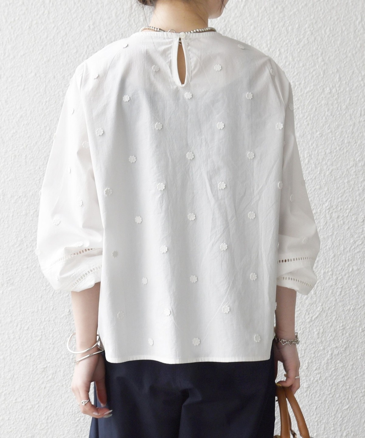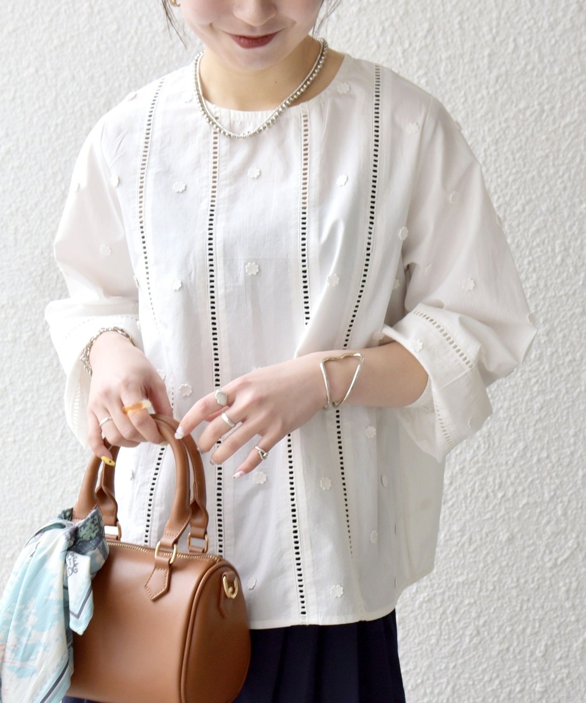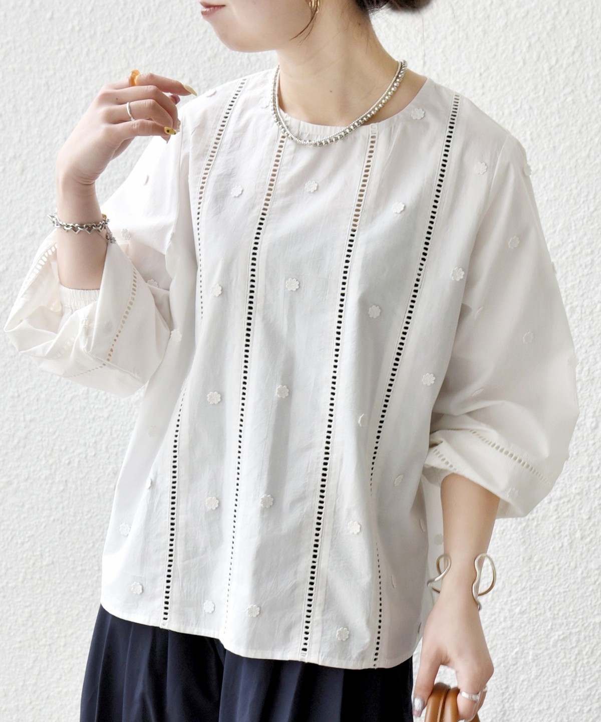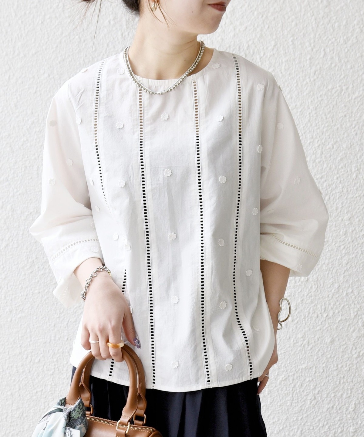 小さなお花のモチーフが散りばめられたノーカラーブラウス。