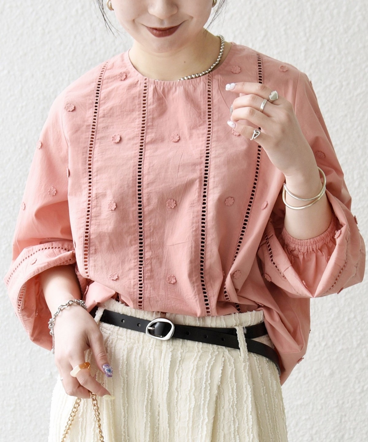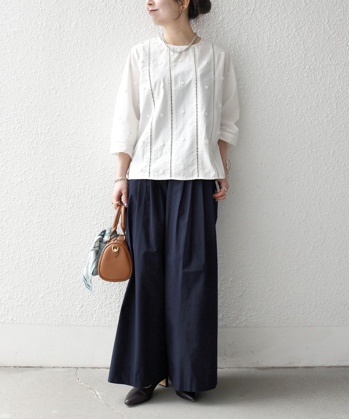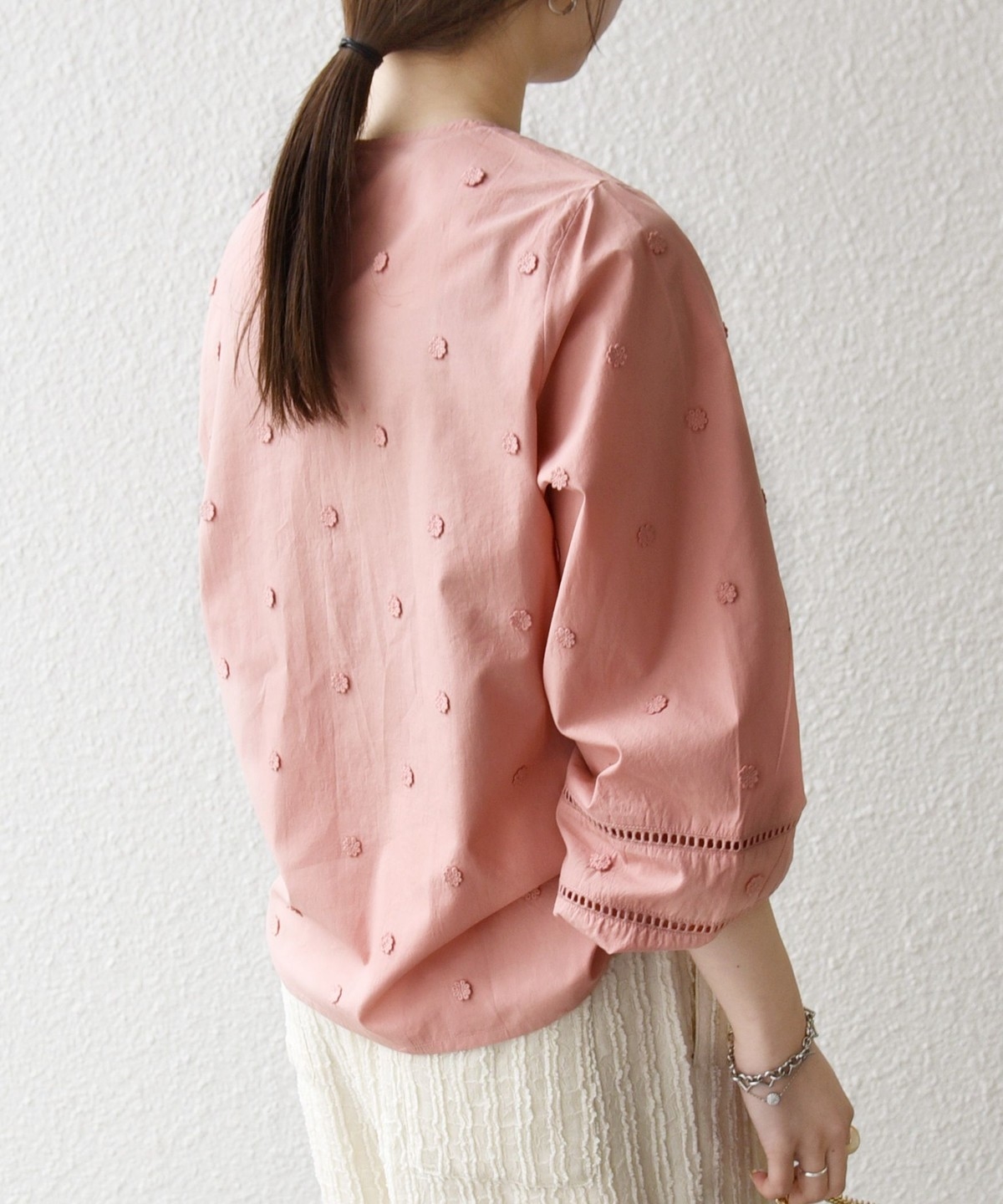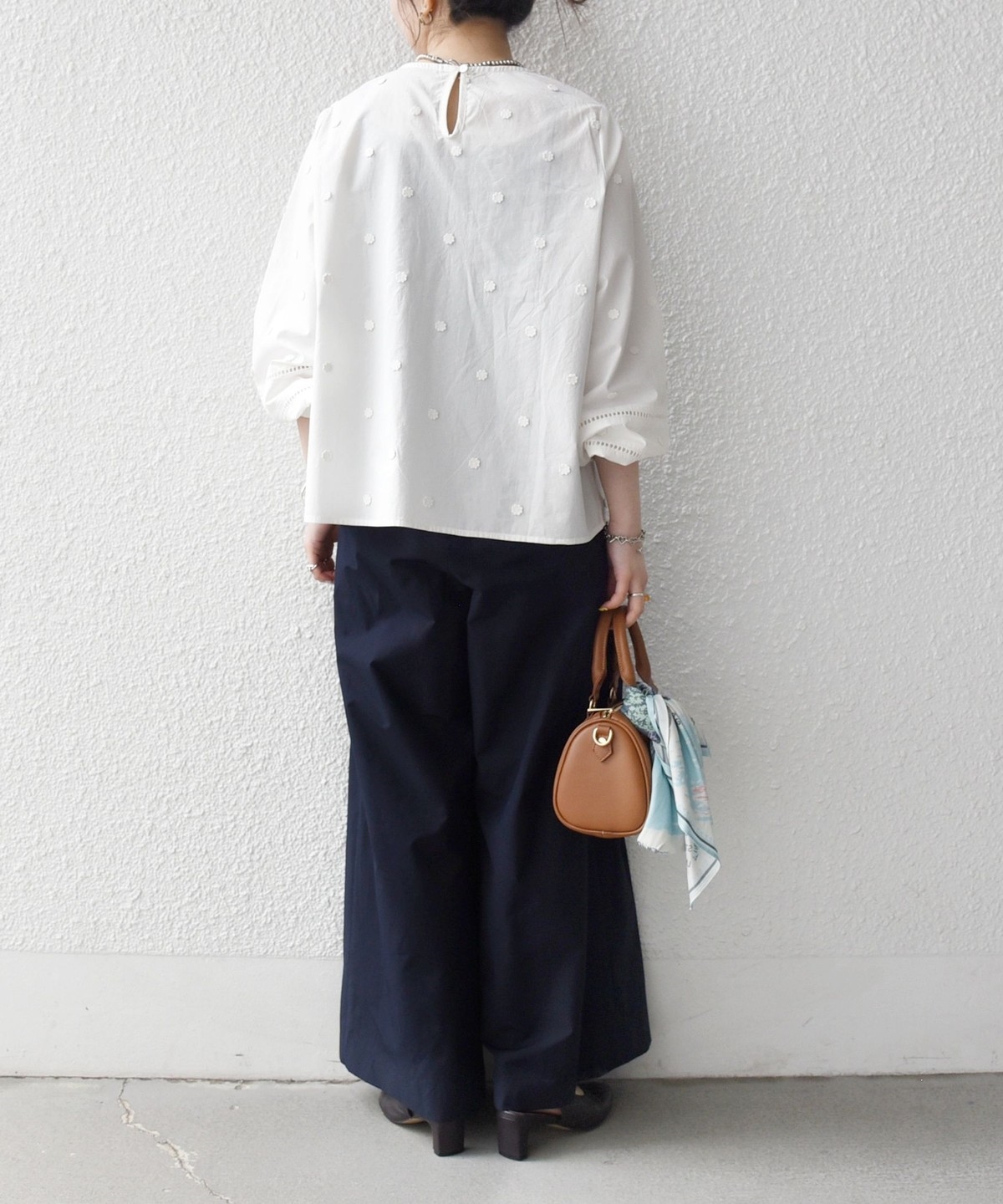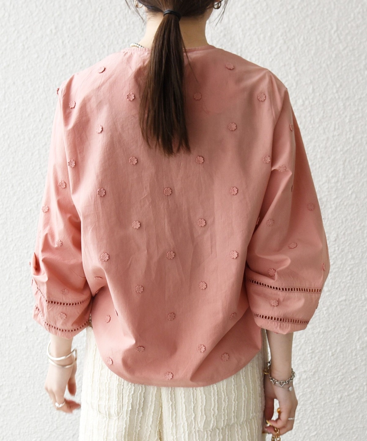 小さなお花のモチーフが散りばめられたノーカラーブラウス。