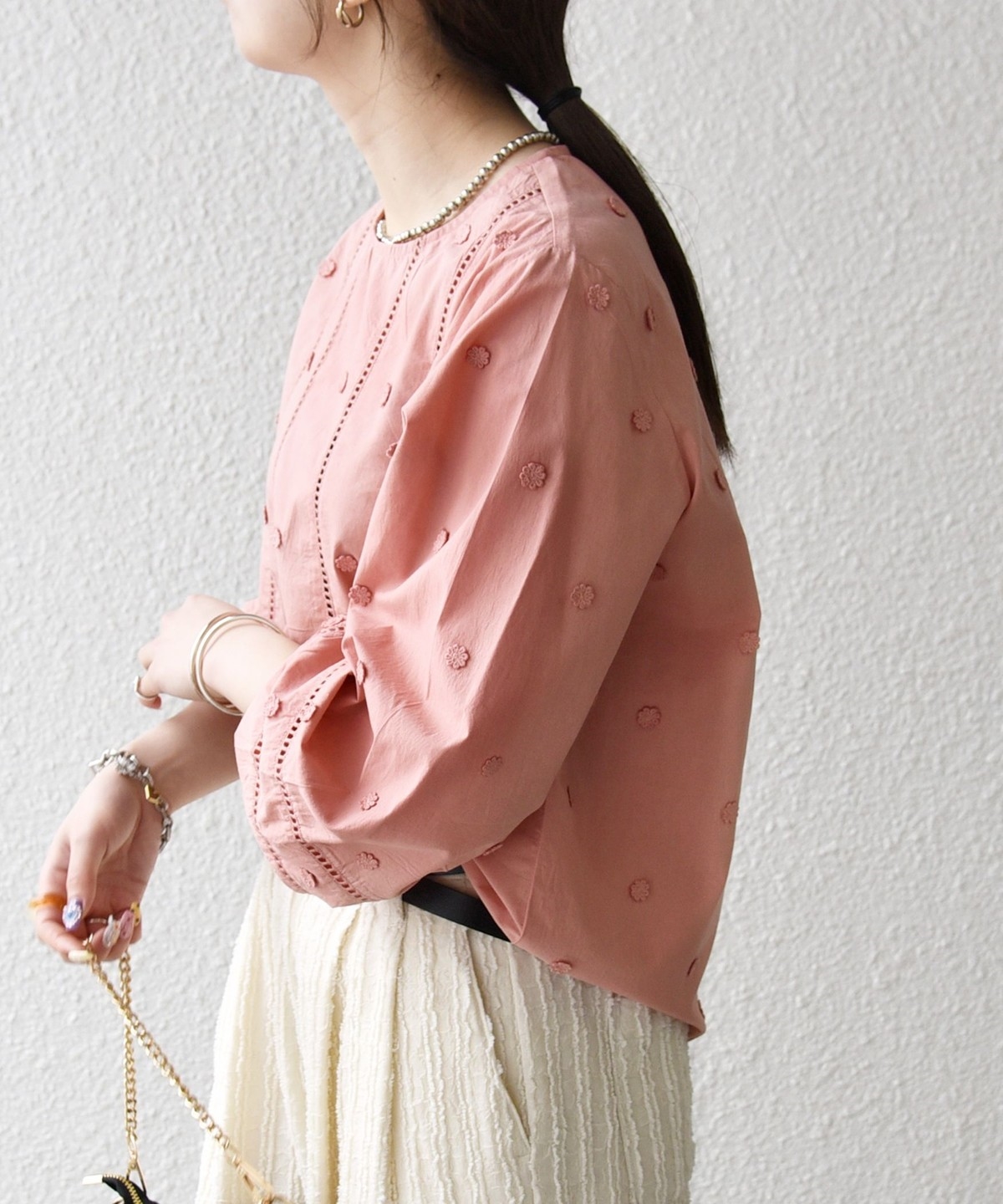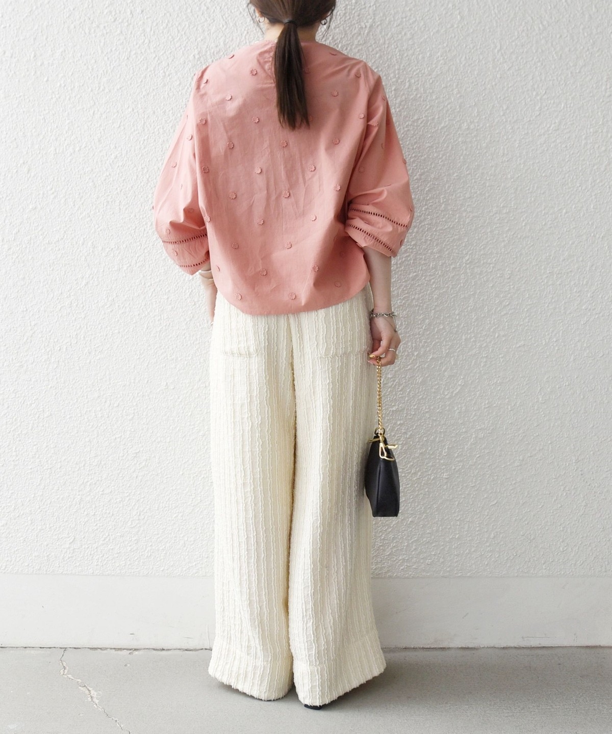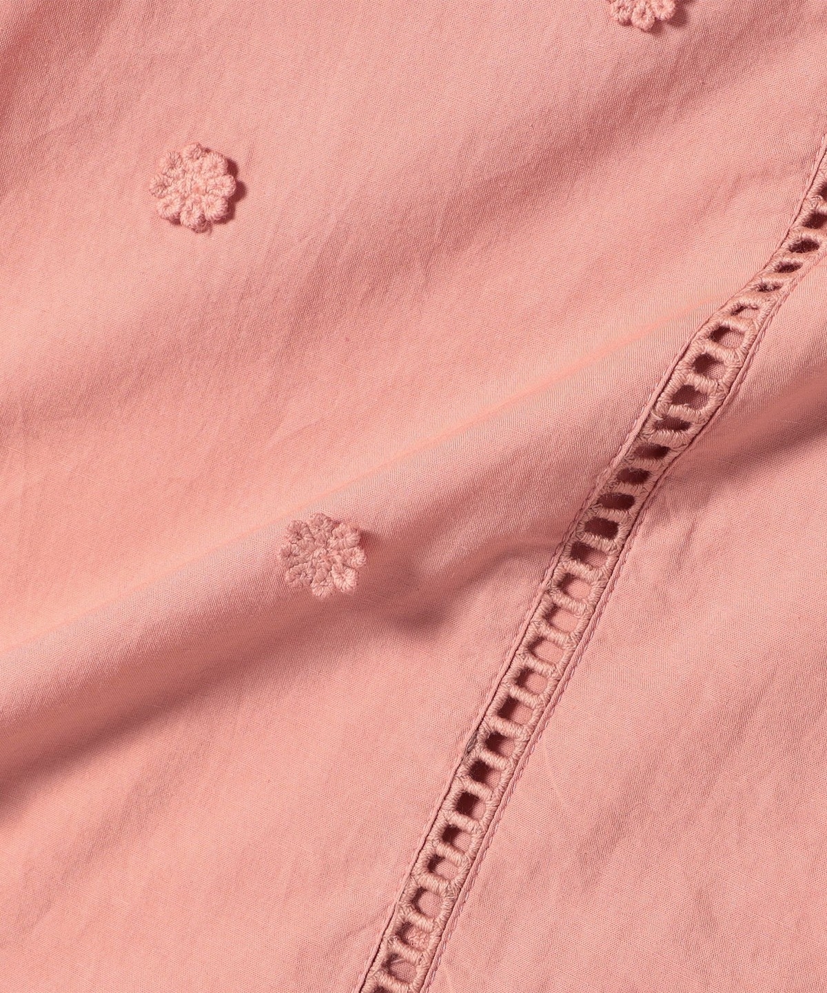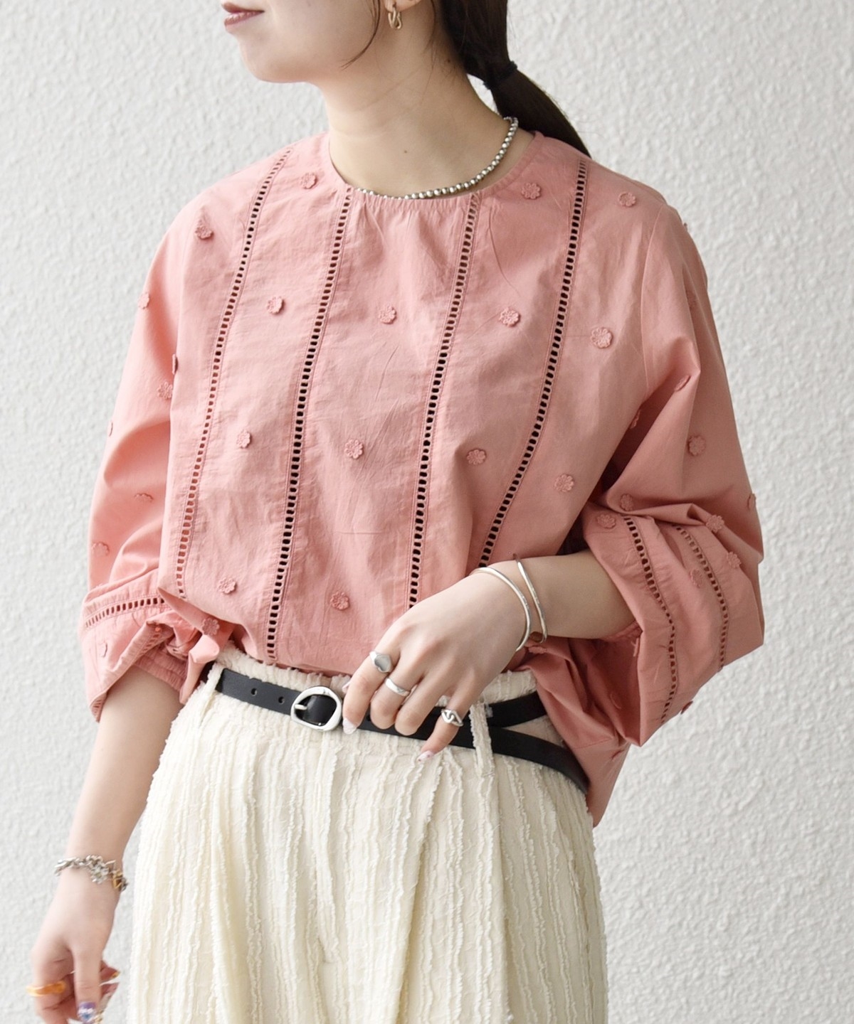 小さなお花のモチーフが散りばめられたノーカラーブラウス。