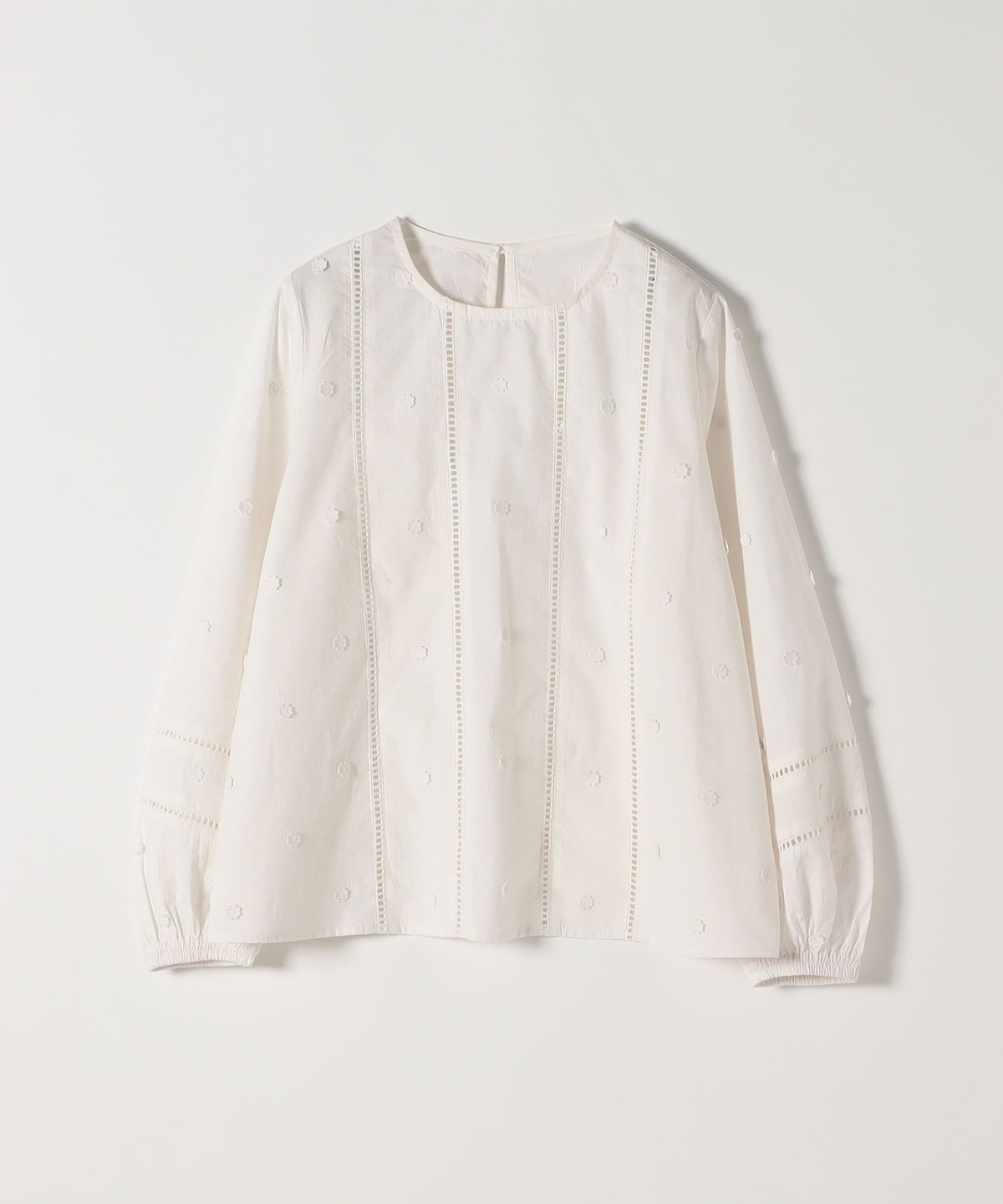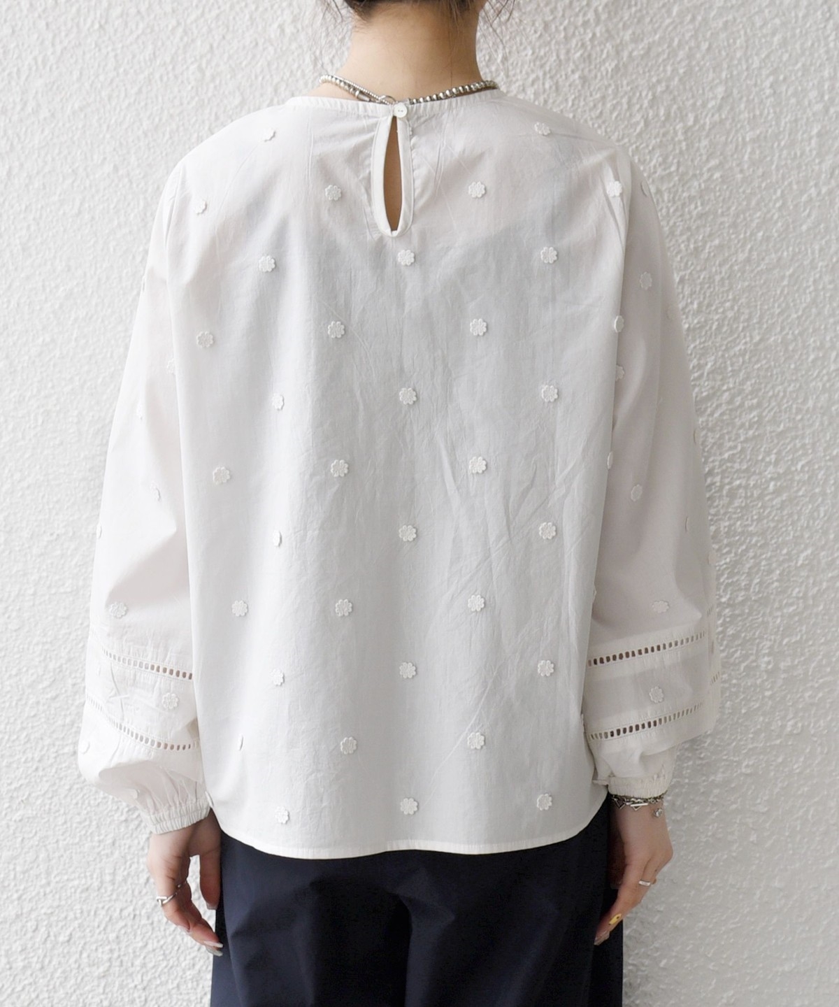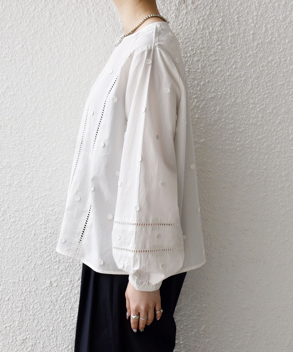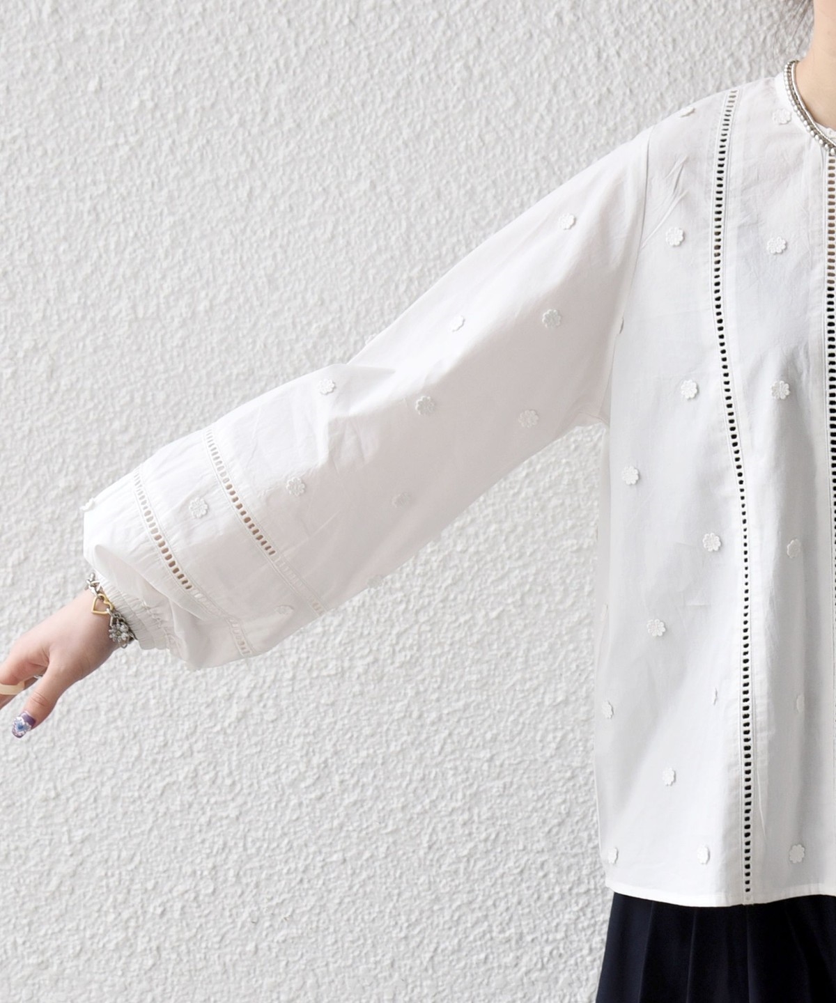 小さなお花のモチーフが散りばめられたノーカラーブラウス。