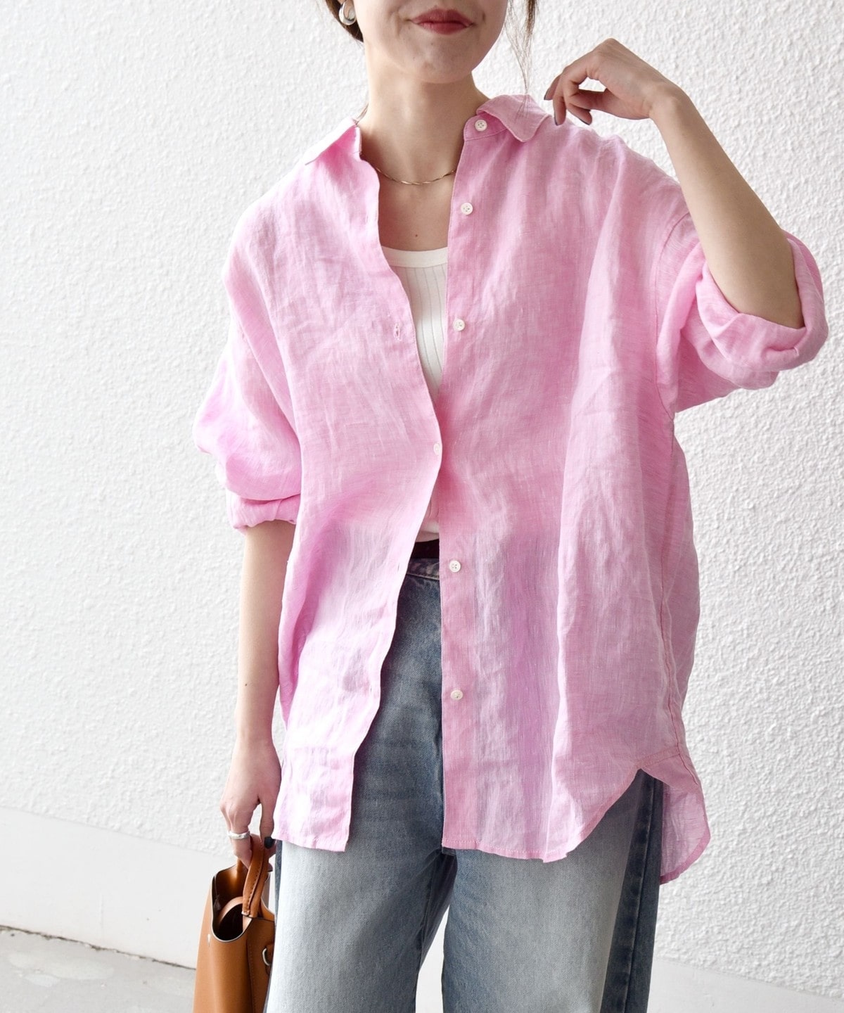 程良いリネンのシアー感があるので、キャミやタンクにさらっと重ねてヘルシーな着こなしがおすすめ。