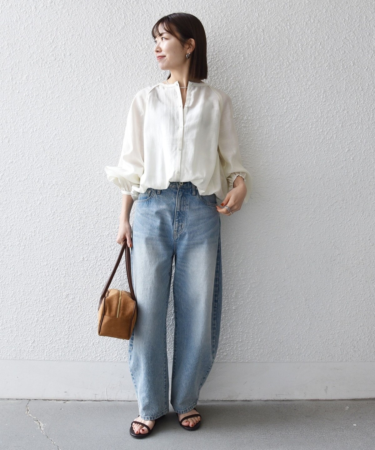 ショート丈を活かして、ボリュームのあるボトムスとの相性が◎