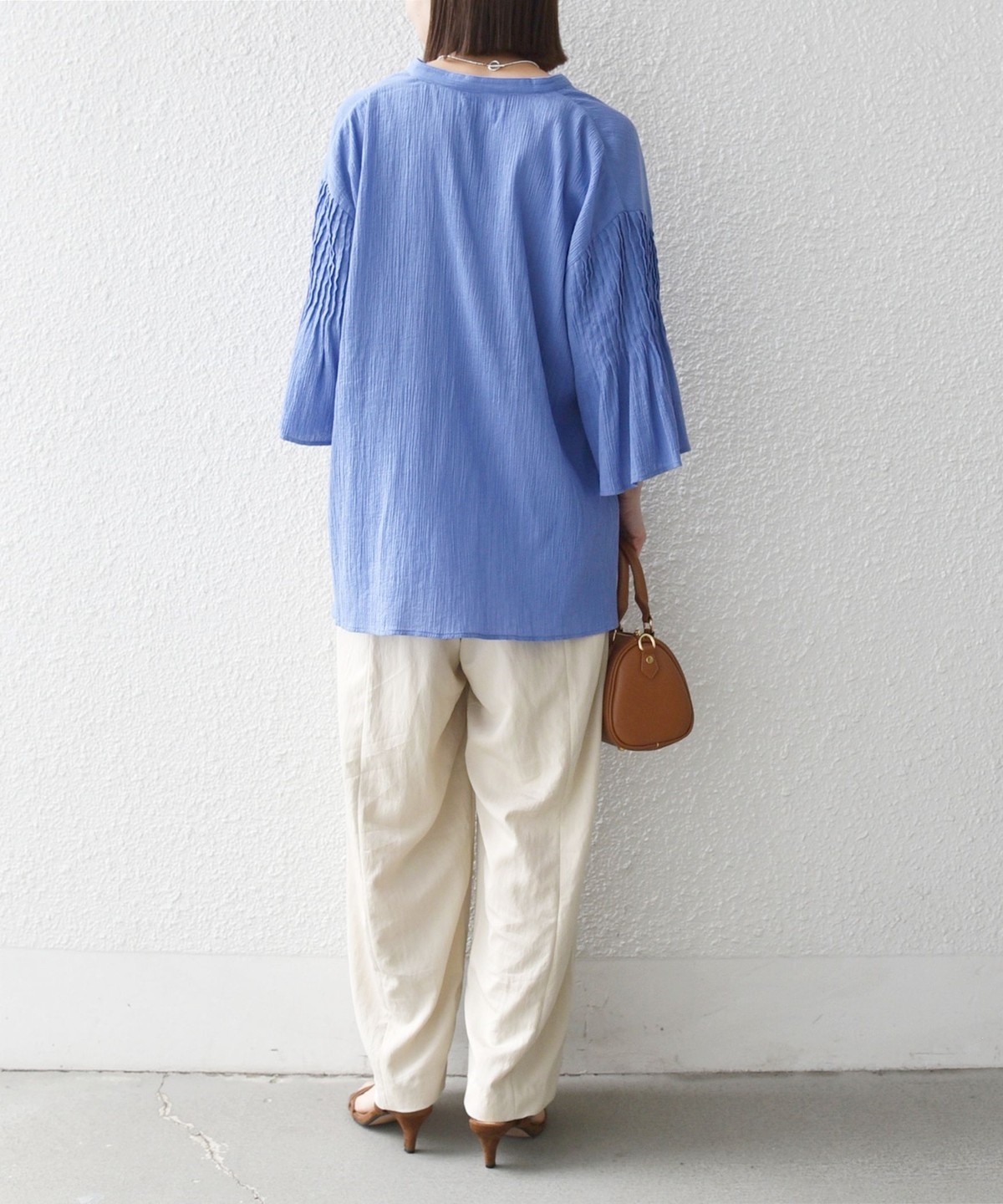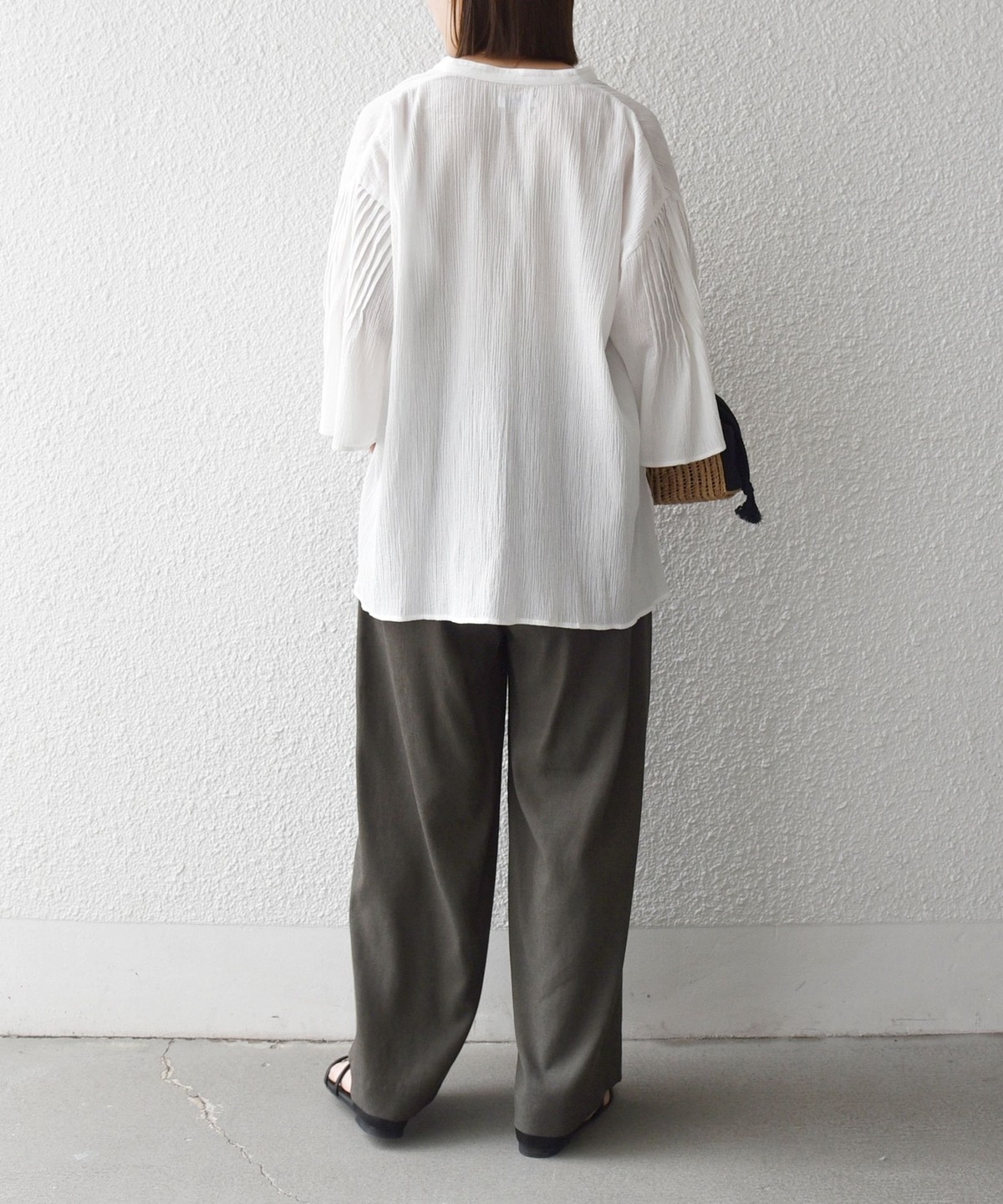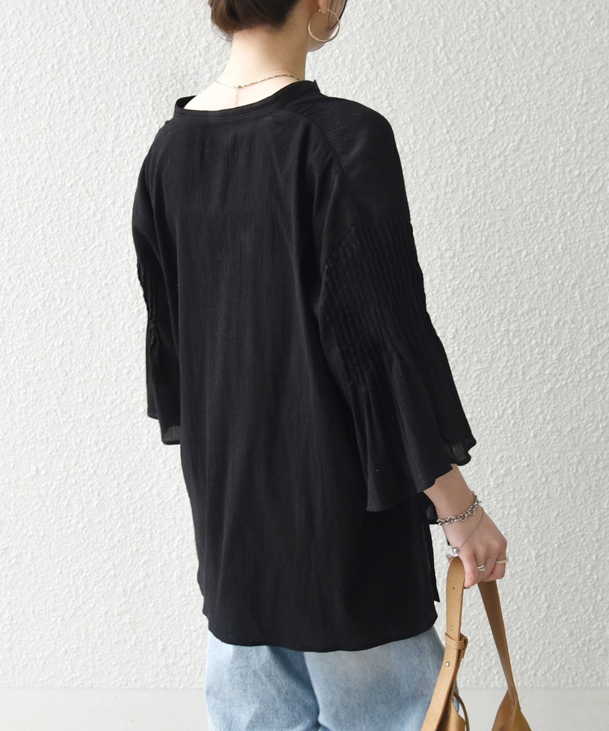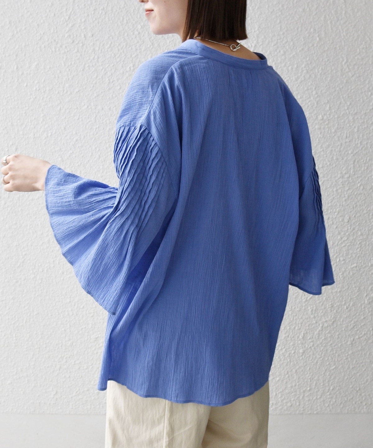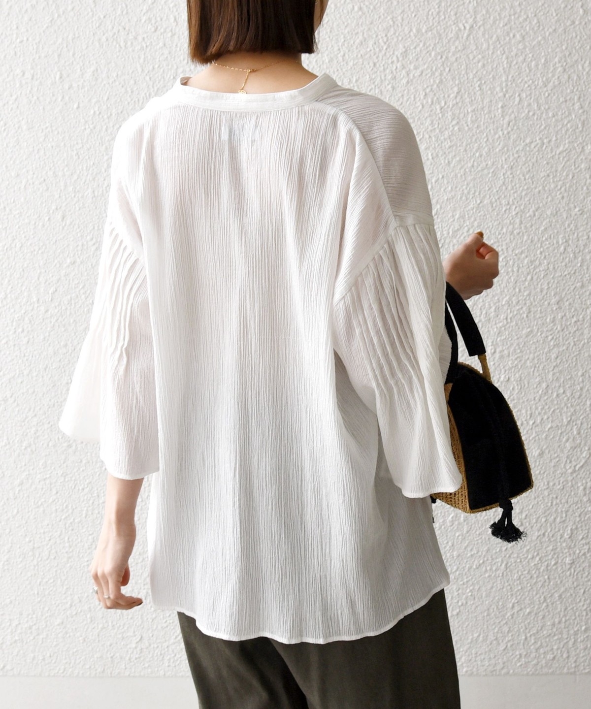 袖にはピンタックを施し、やわらかに広がるフレアスリーブを演出。