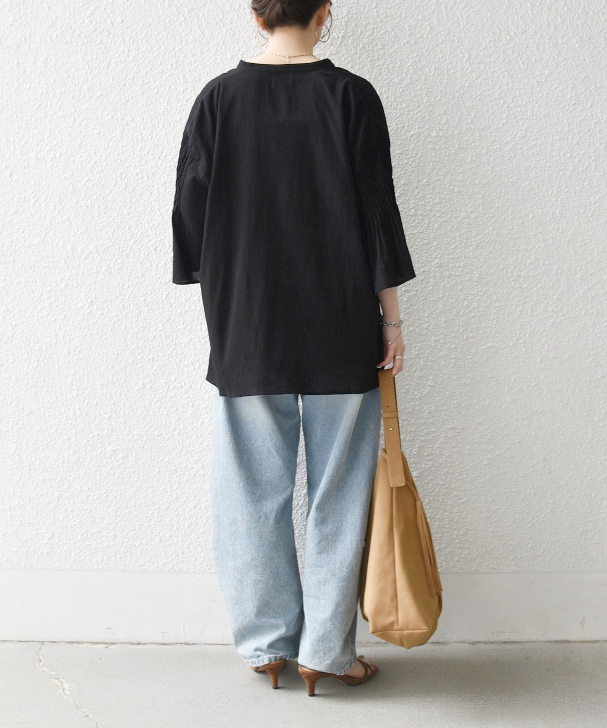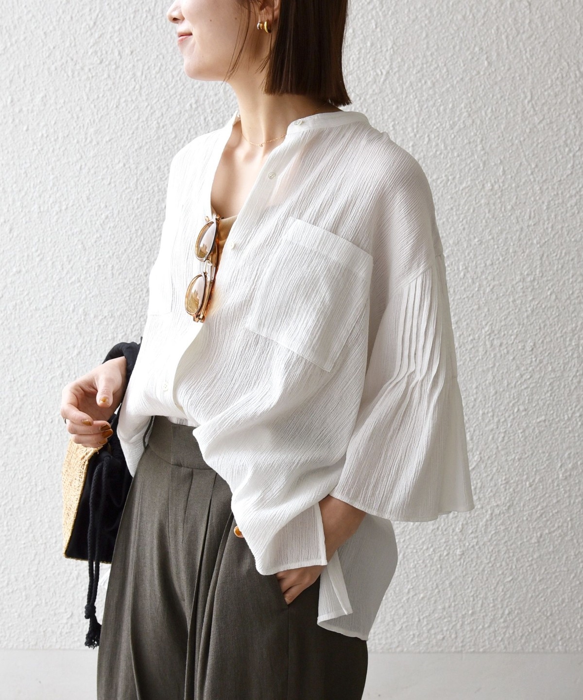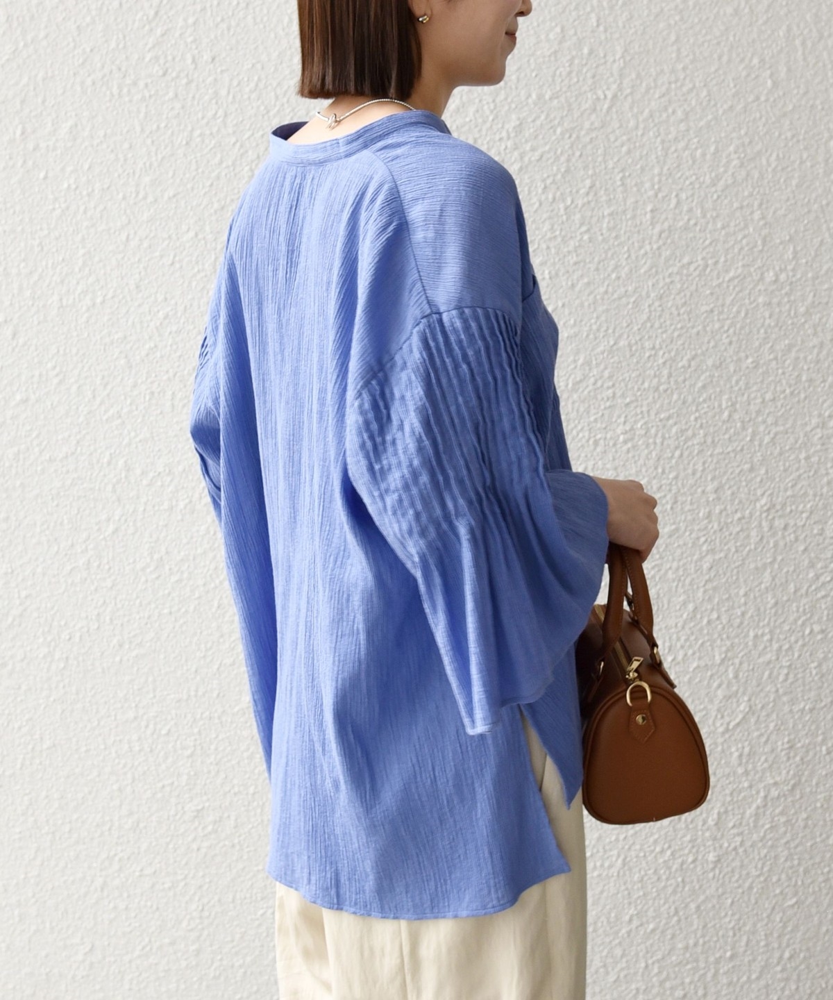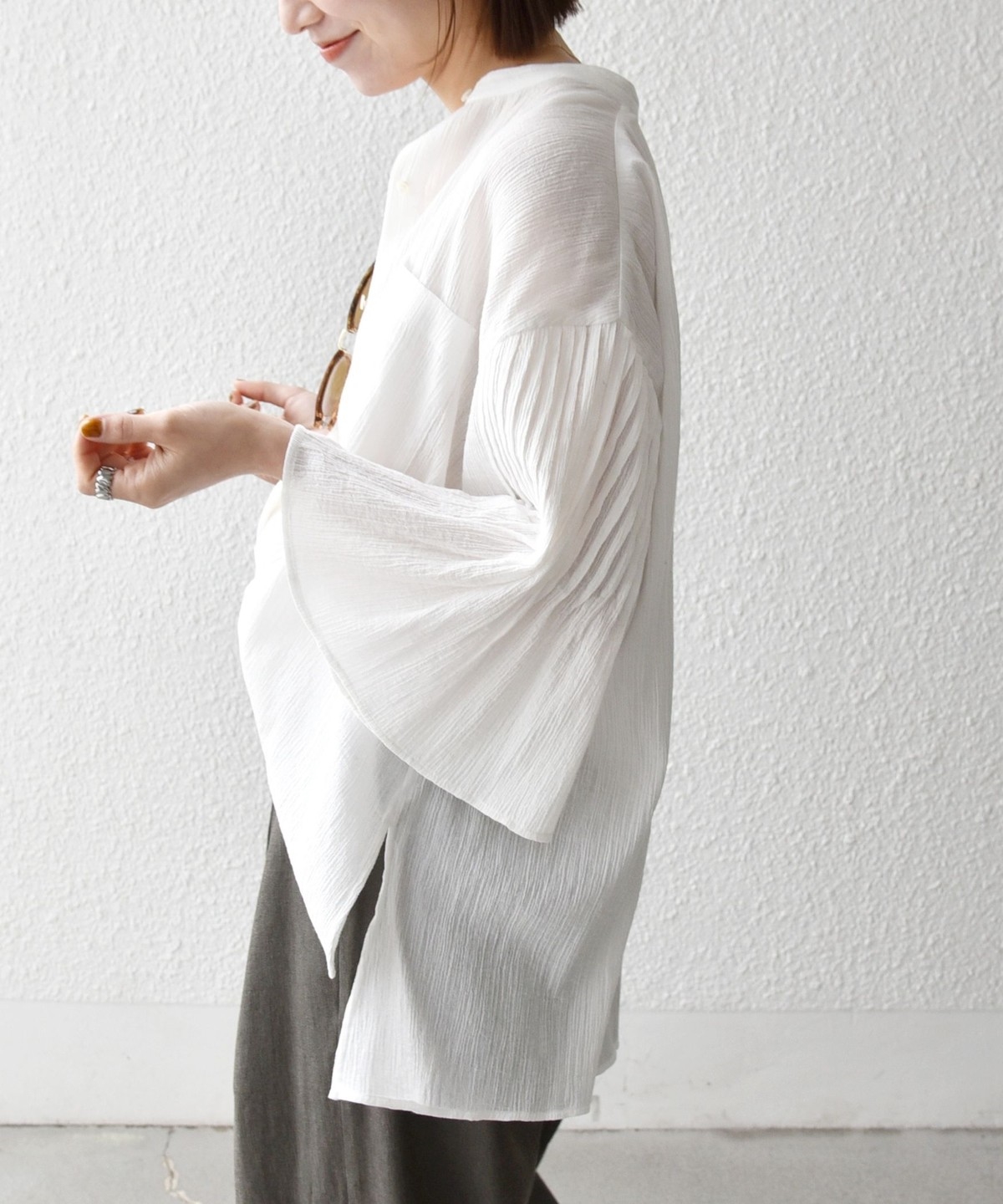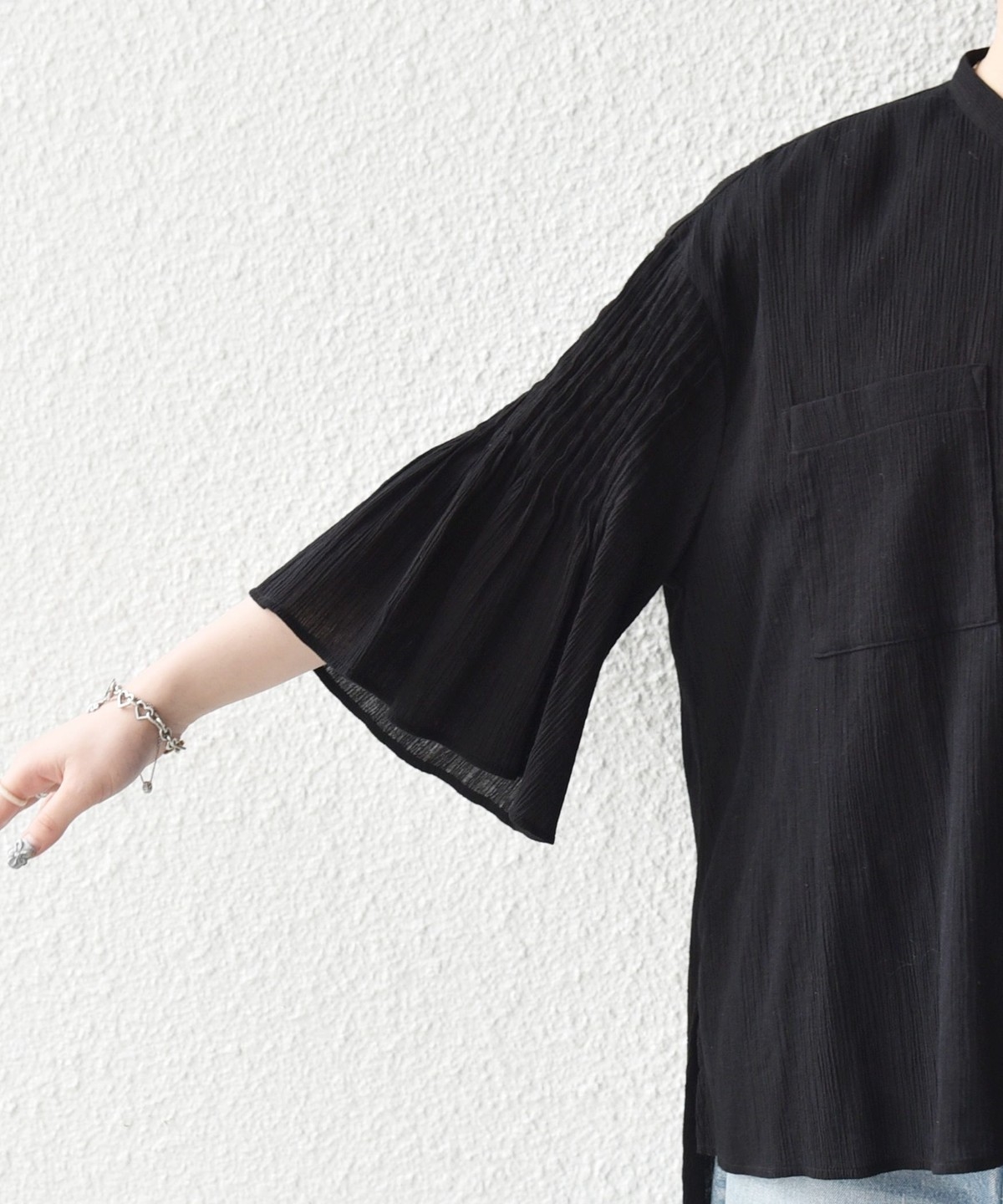 袖にはピンタックを施し、やわらかに広がるフレアスリーブを演出。