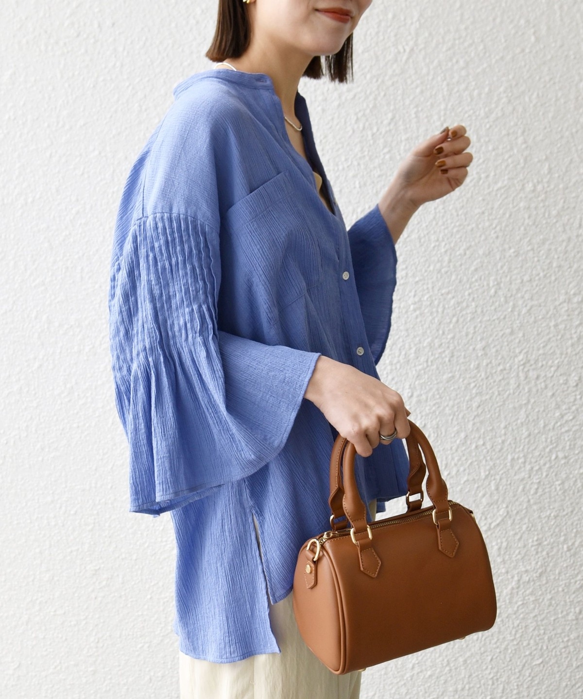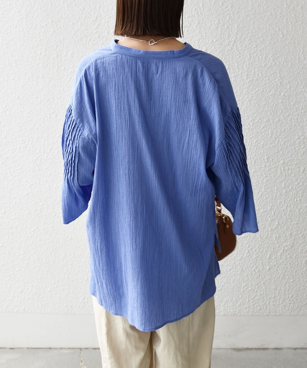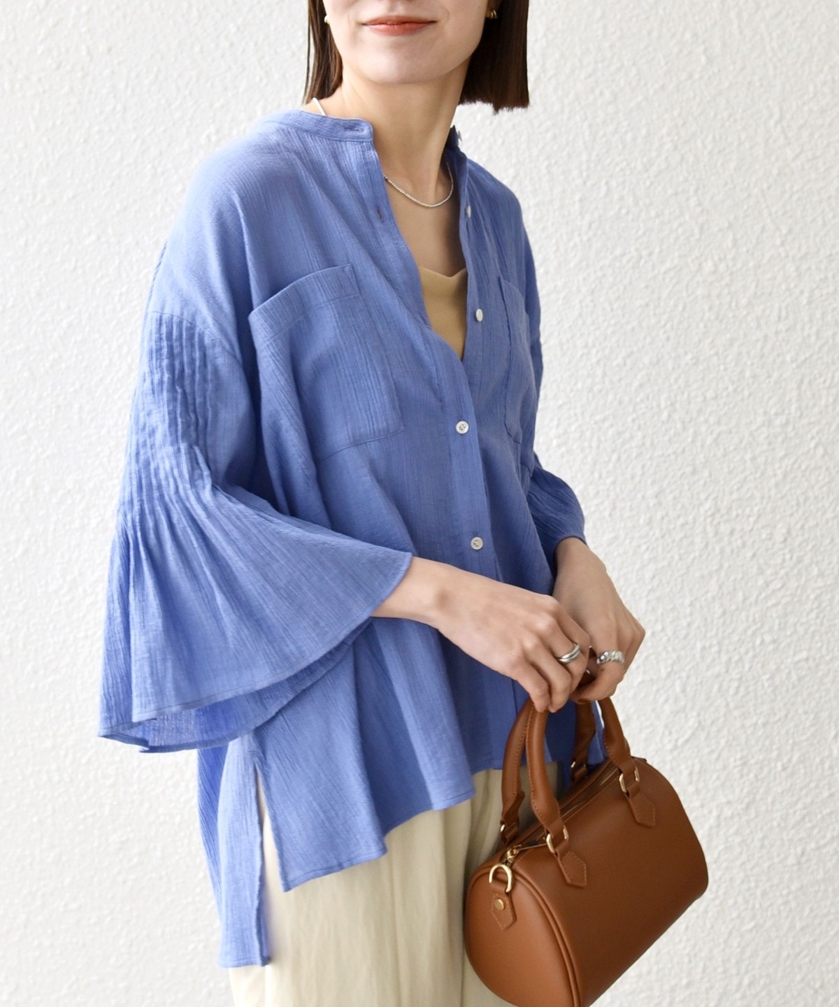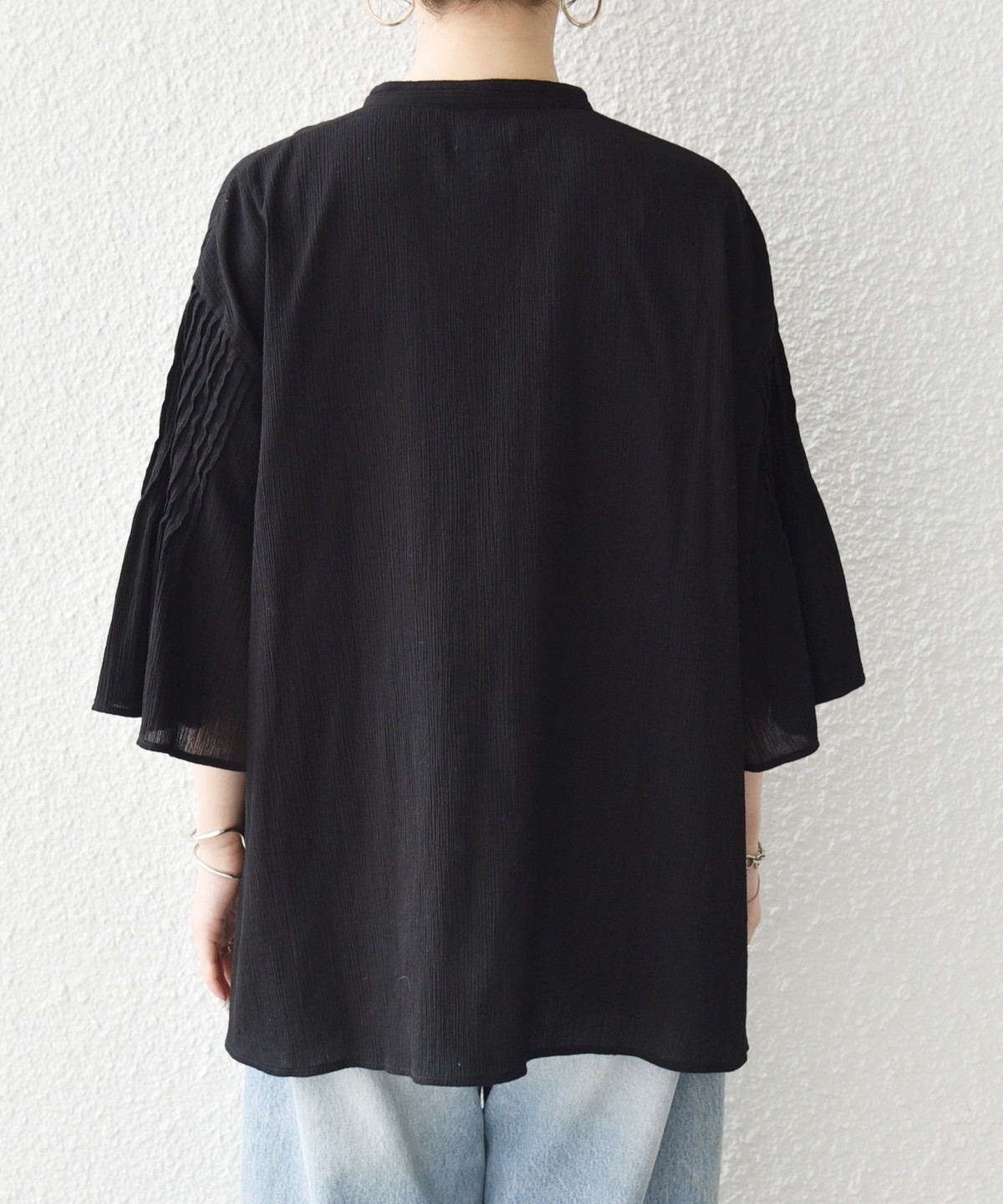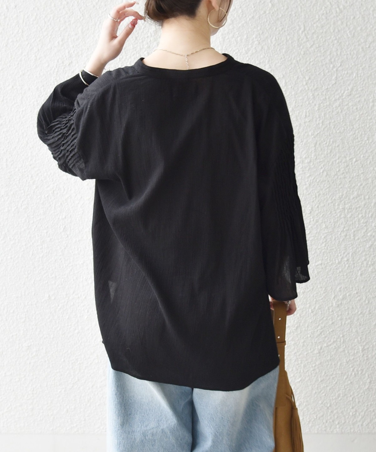 袖にはピンタックを施し、やわらかに広がるフレアスリーブを演出。
