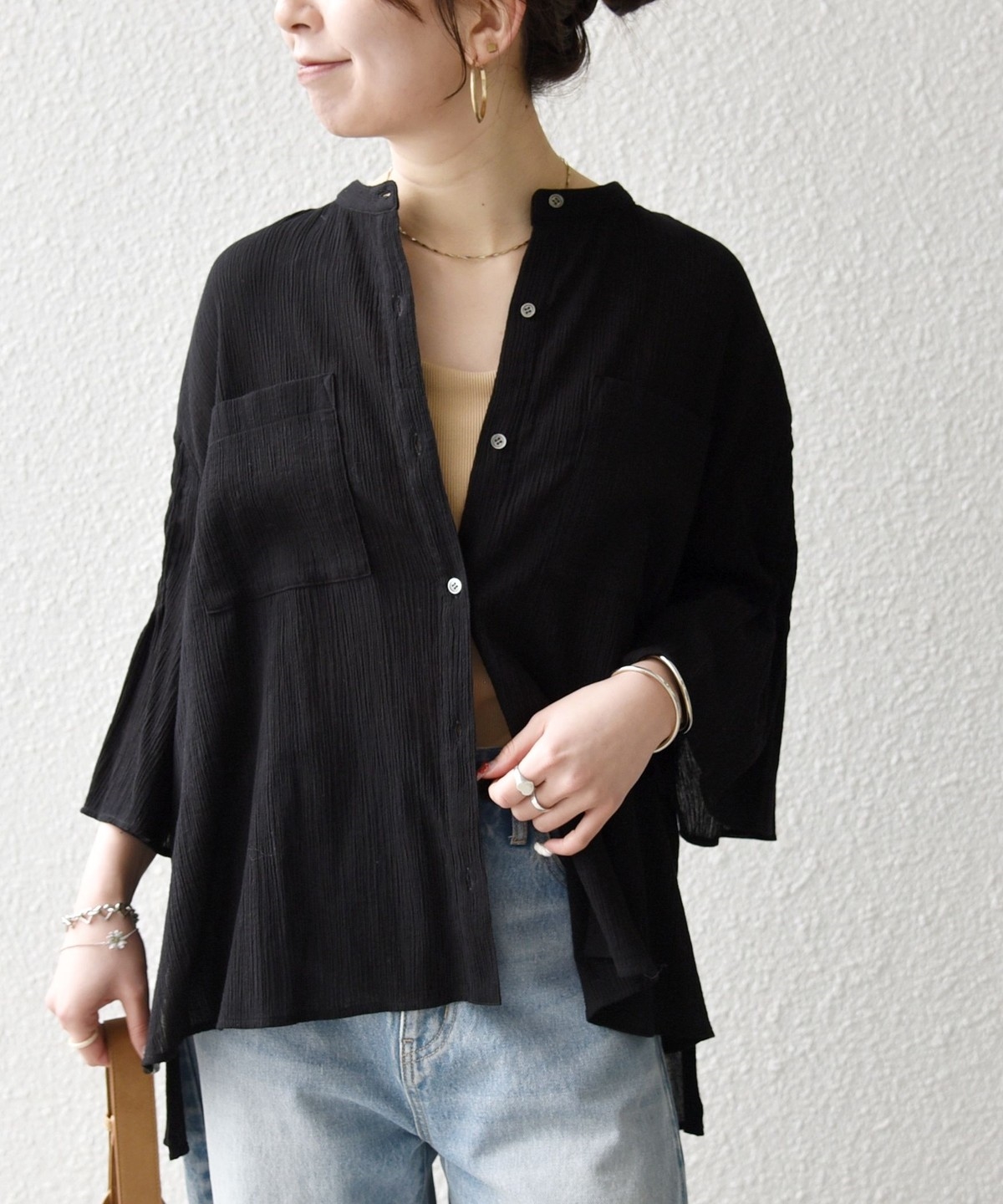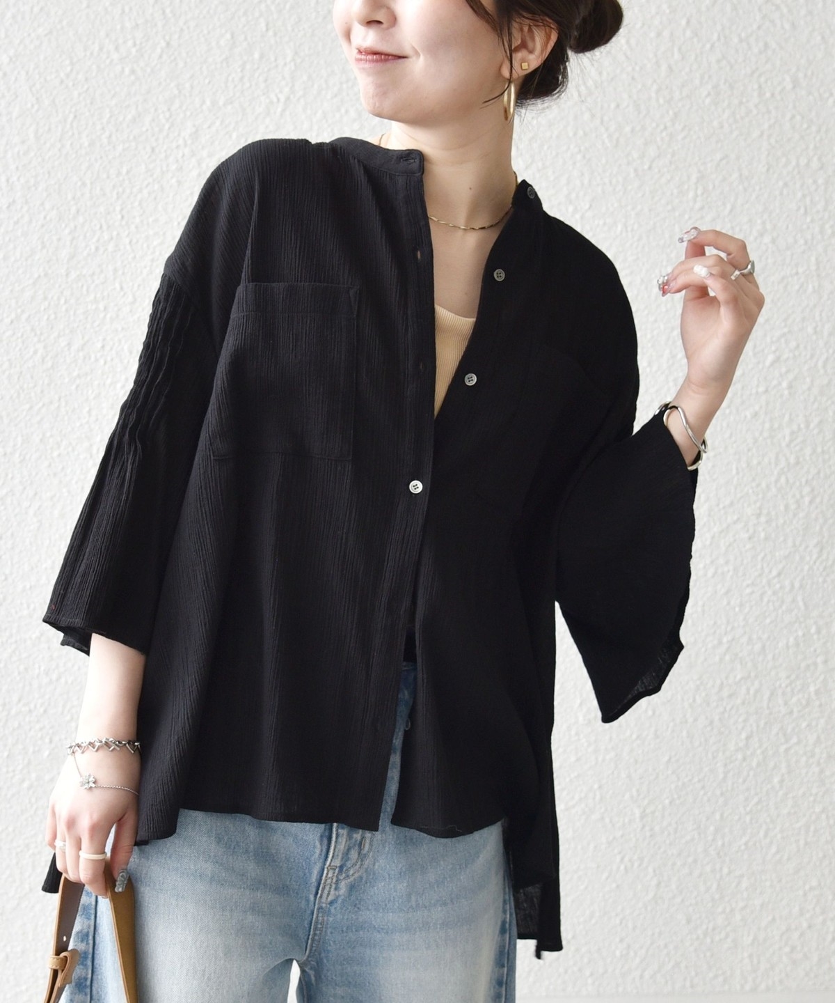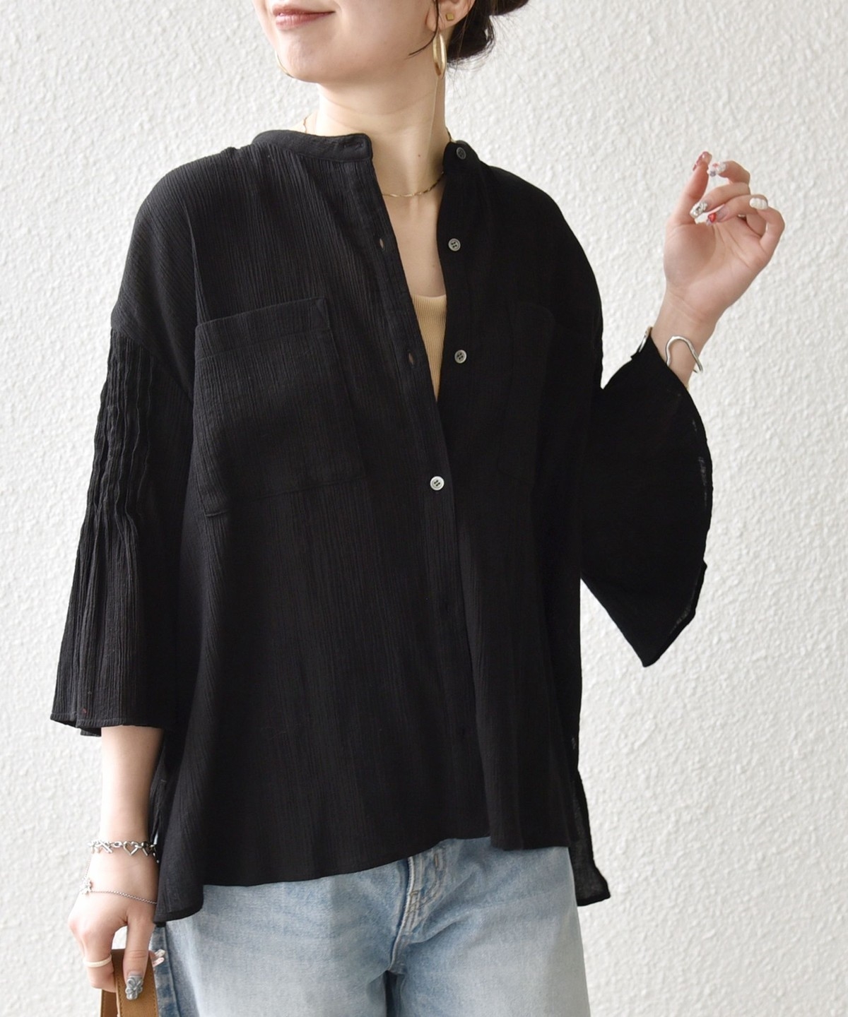 3. 《予約》SHIPS any:〈洗濯機可能〉楊柳 シアー バンド カラー フレア シャツ ブラック