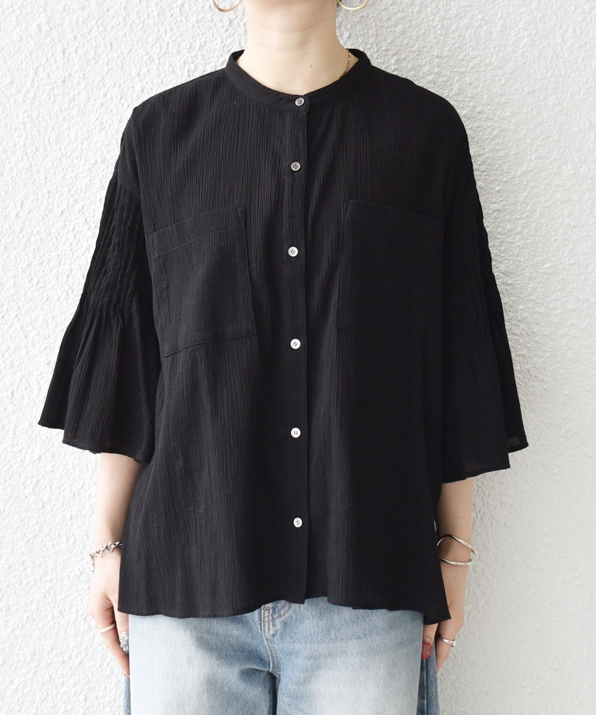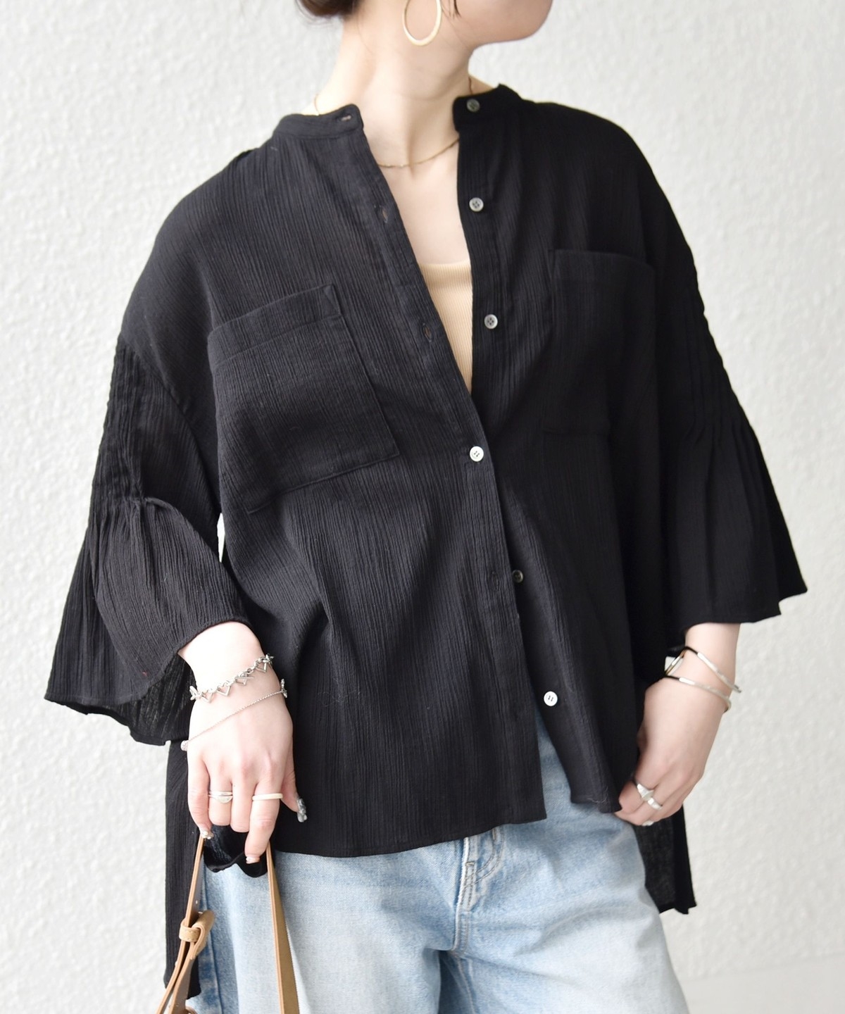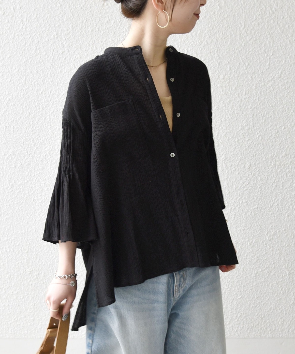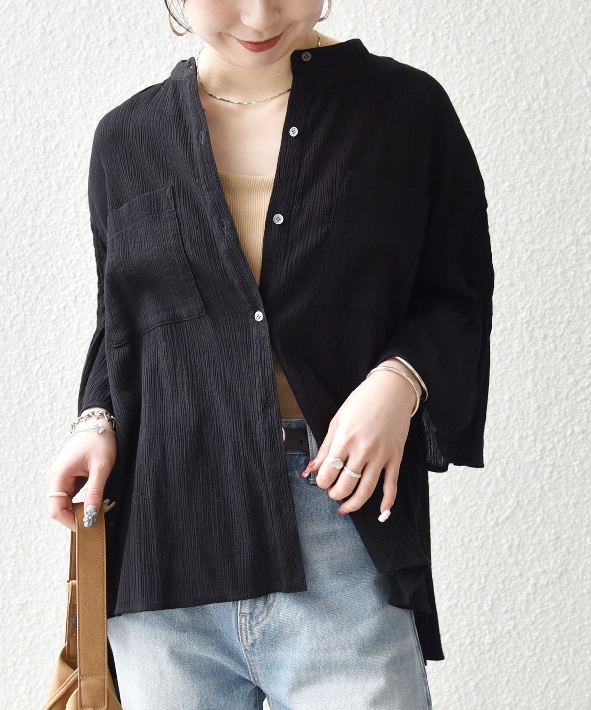 3. 《予約》SHIPS any:〈洗濯機可能〉楊柳 シアー バンド カラー フレア シャツ ブラック