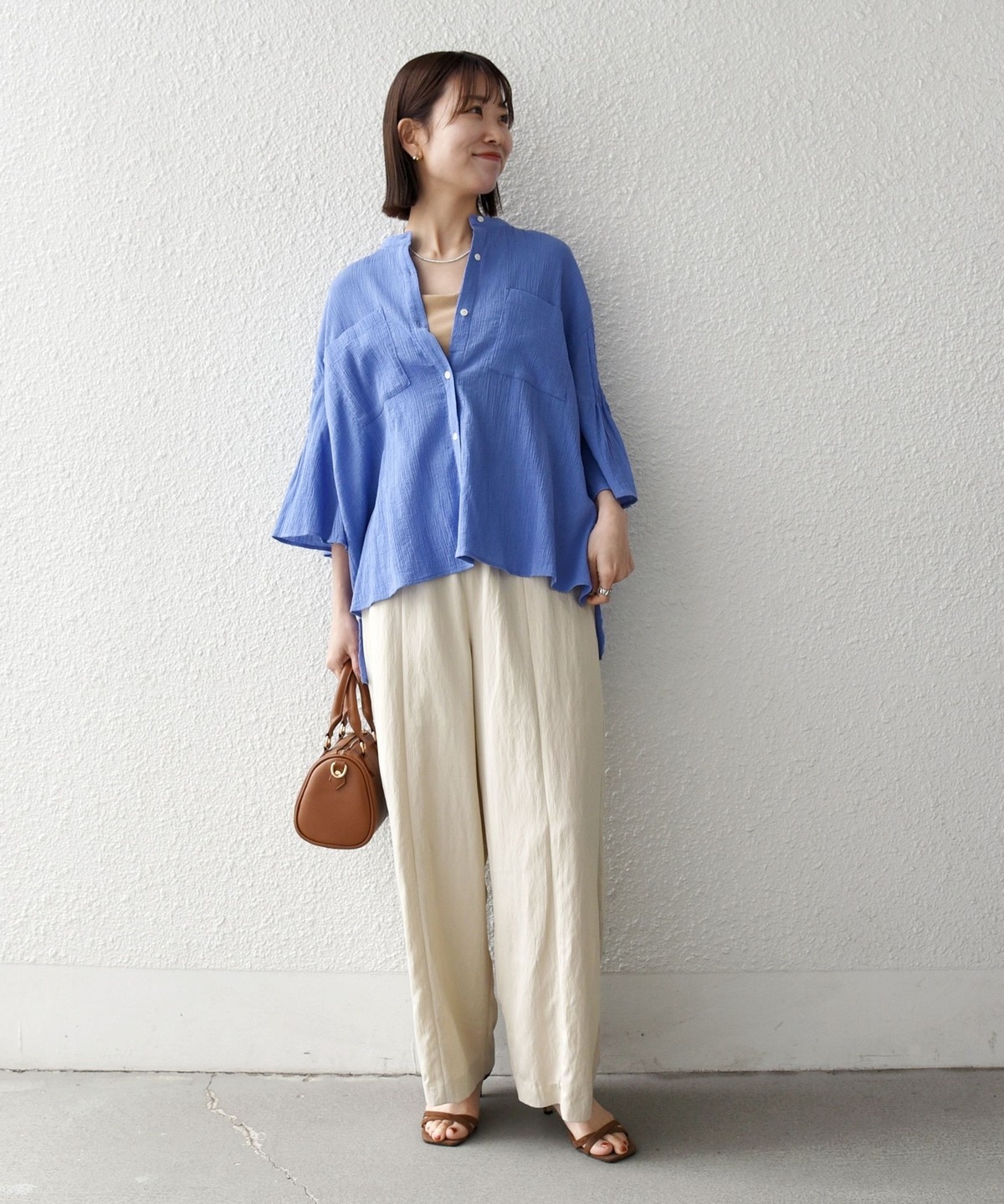 バンドカラーですっきりとした印象のシャツブラウスです。