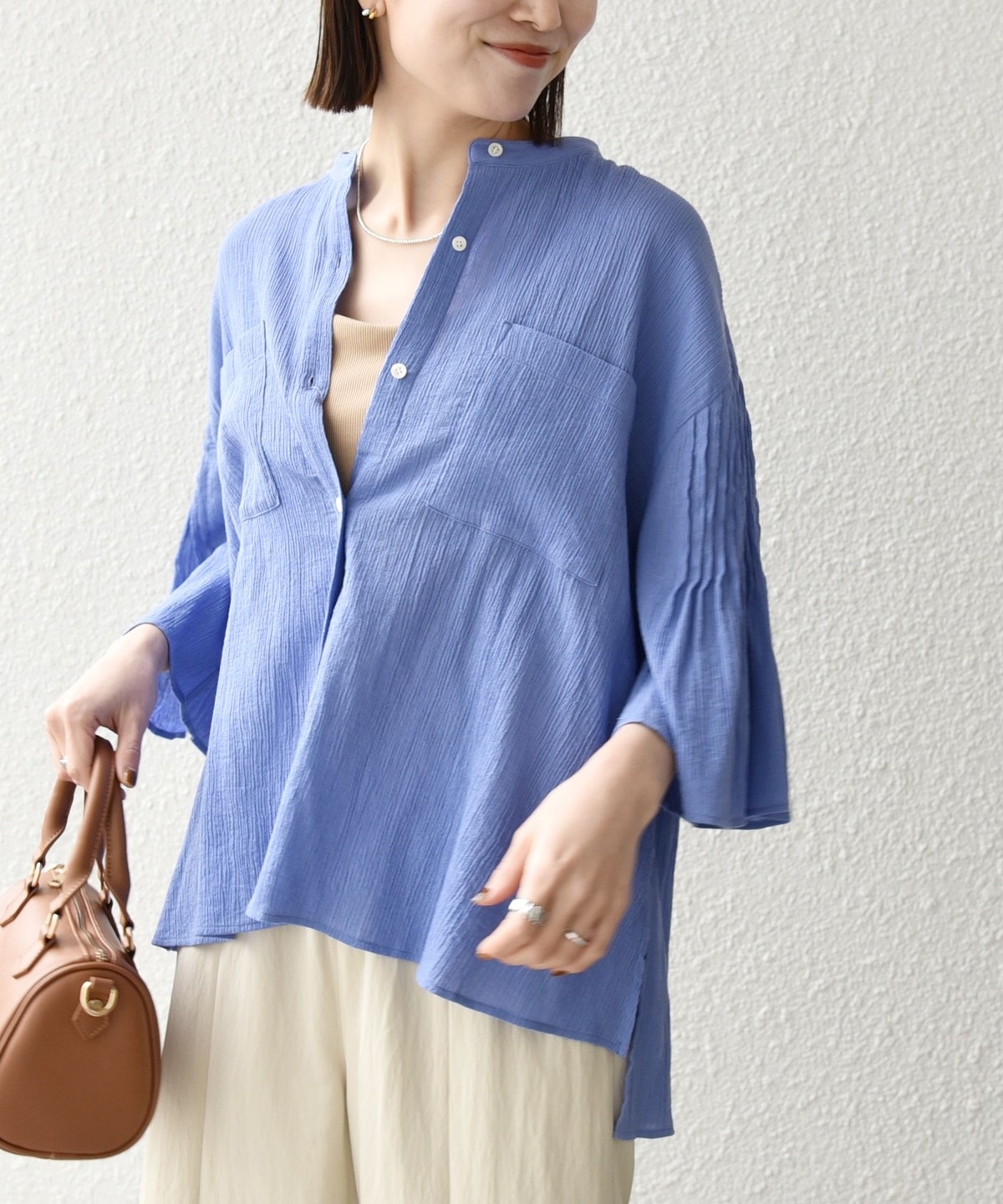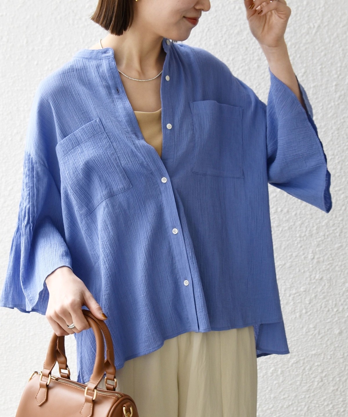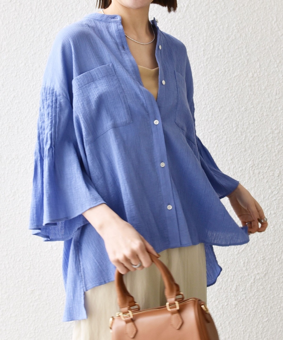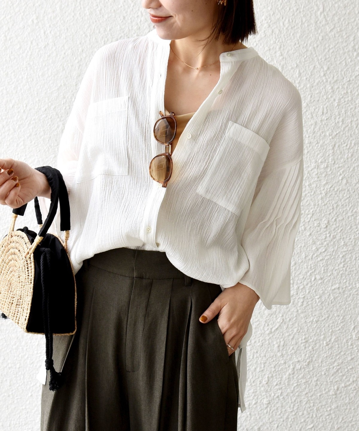 43. 《予約》SHIPS any:〈洗濯機可能〉楊柳 シアー バンド カラー フレア シャツ