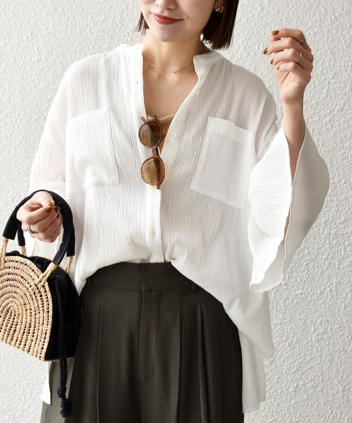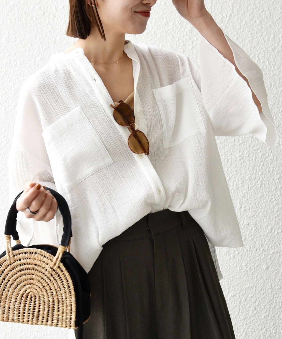 46. 《予約》SHIPS any:〈洗濯機可能〉楊柳 シアー バンド カラー フレア シャツ