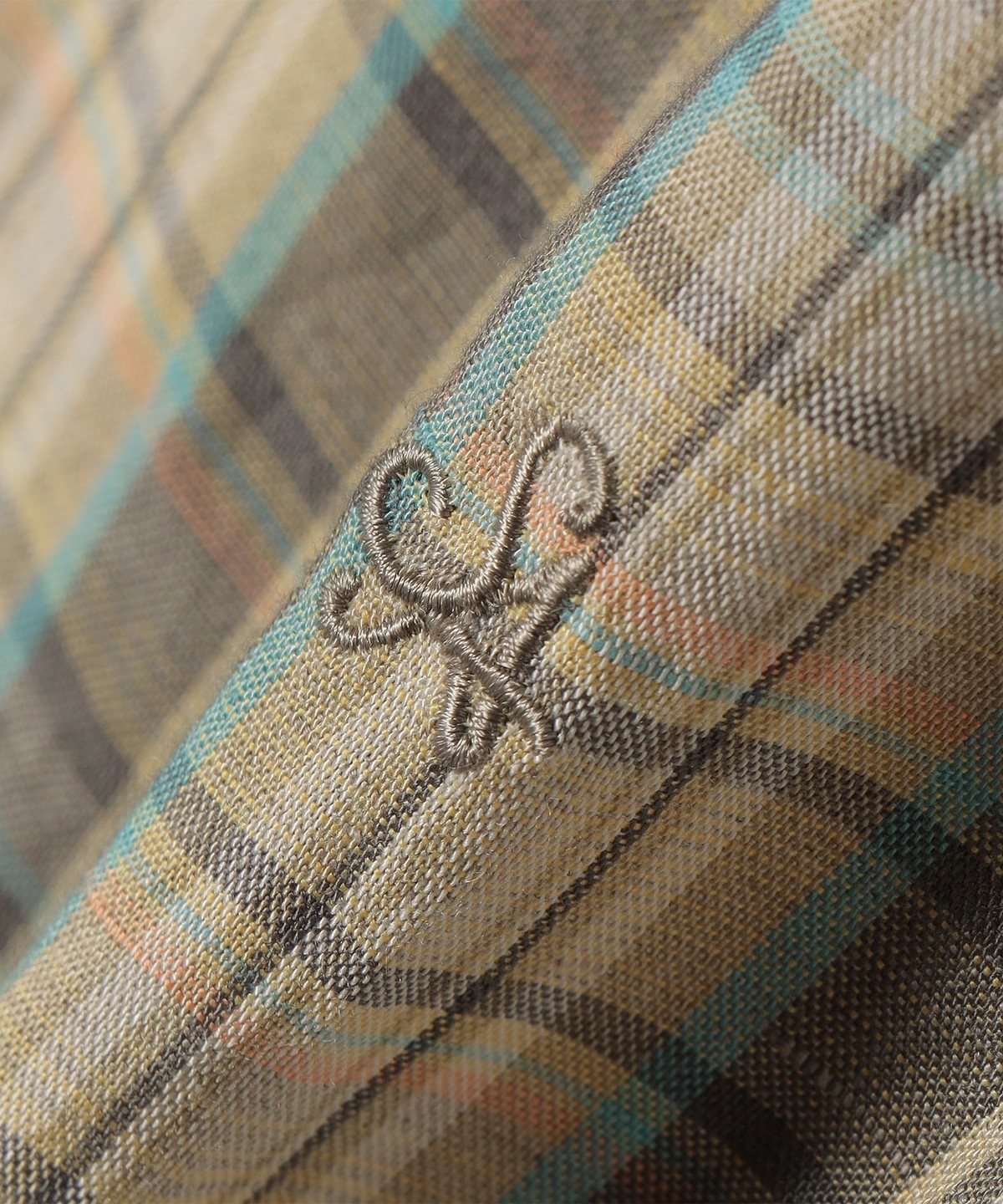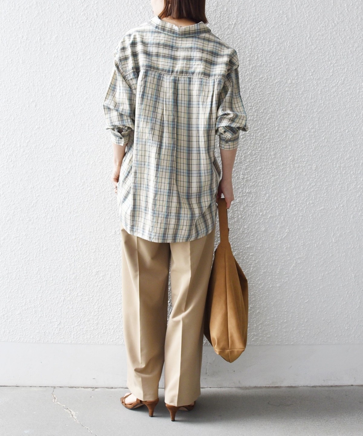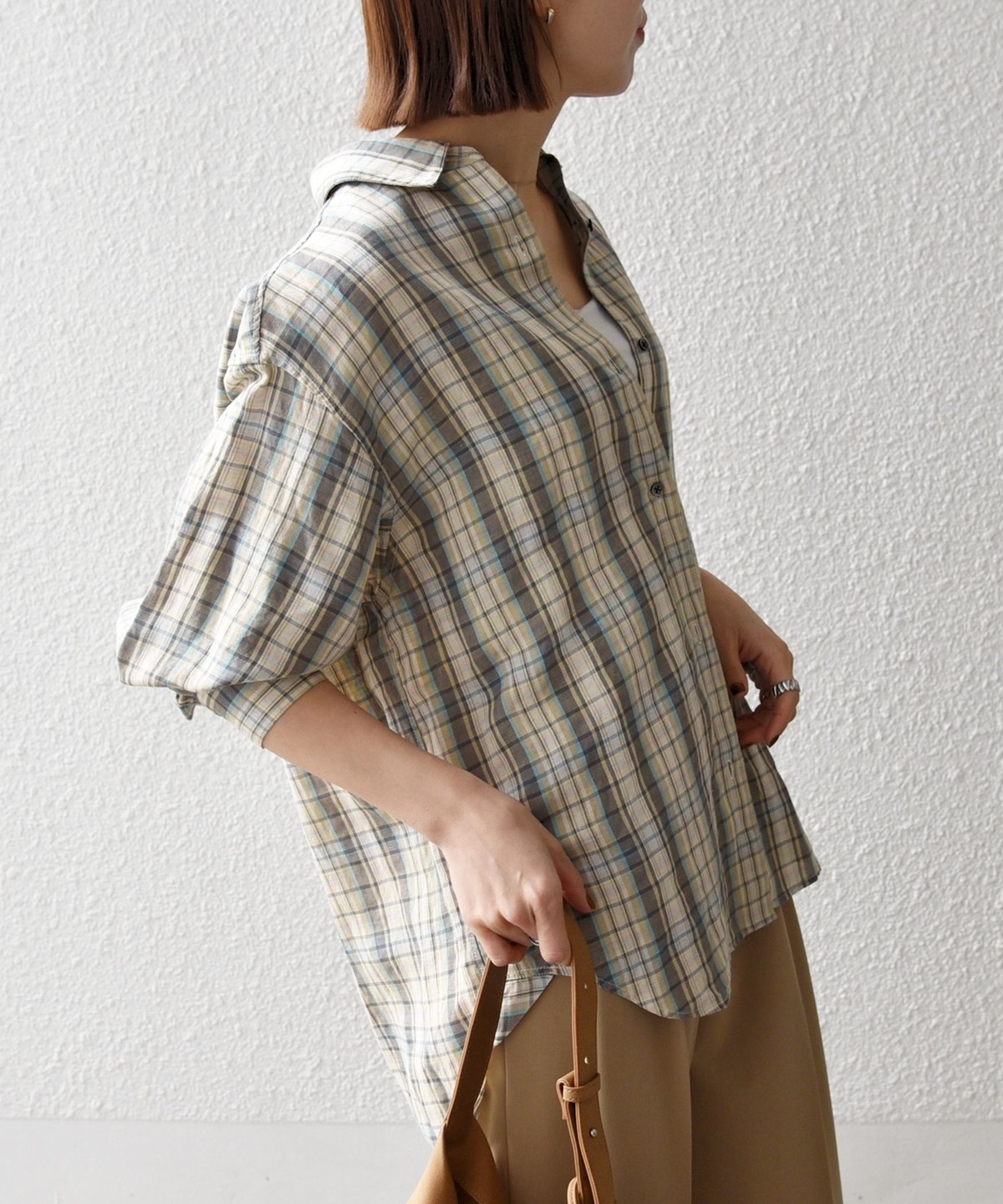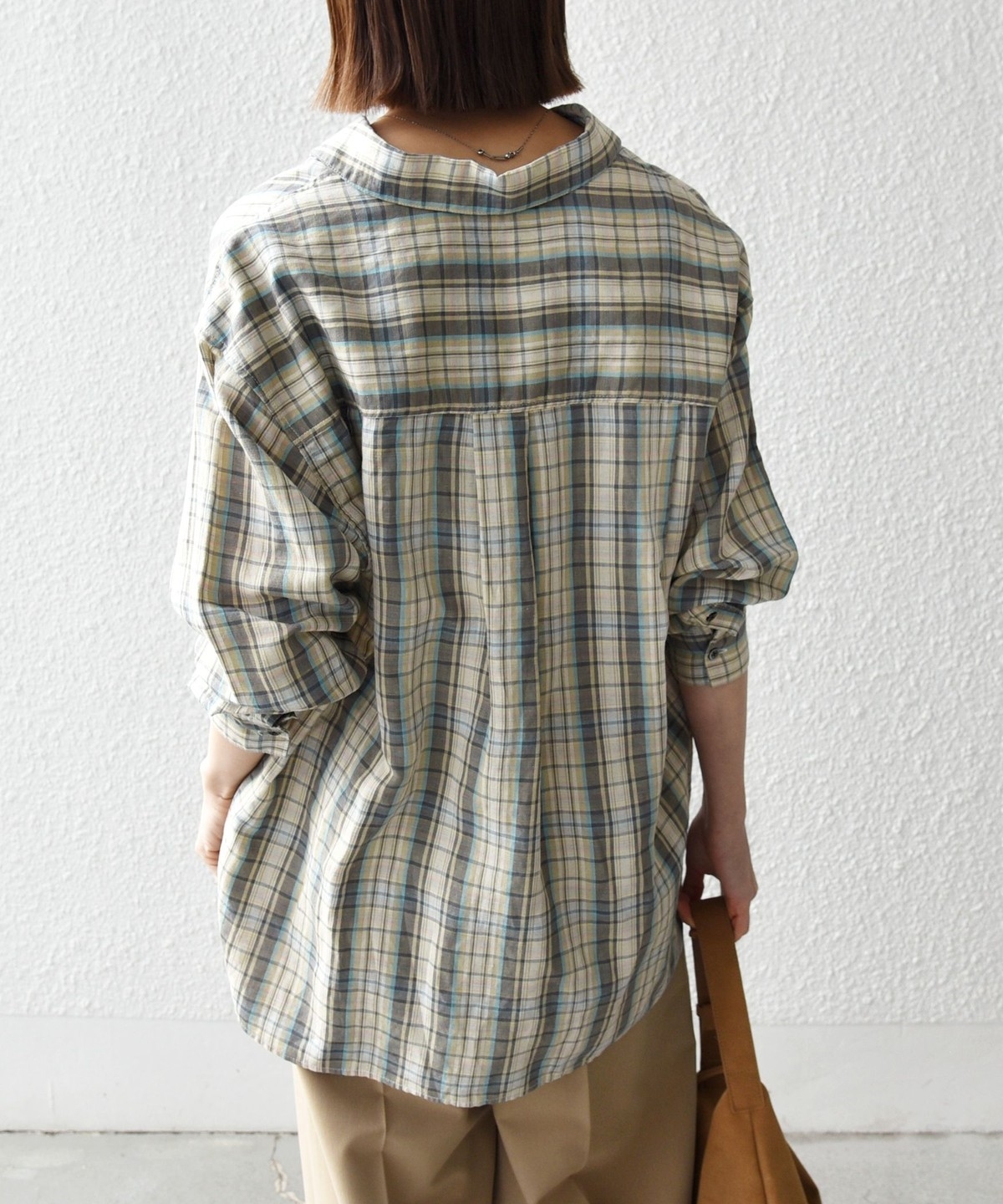 フレンチリネンにヴィスコースをブレンドした先染めチェックを使用。