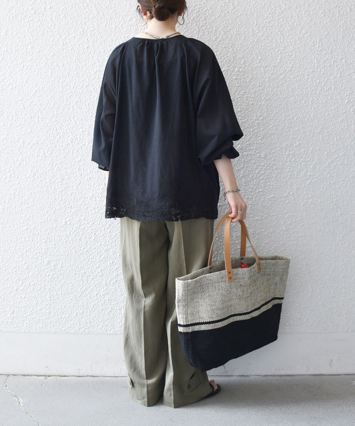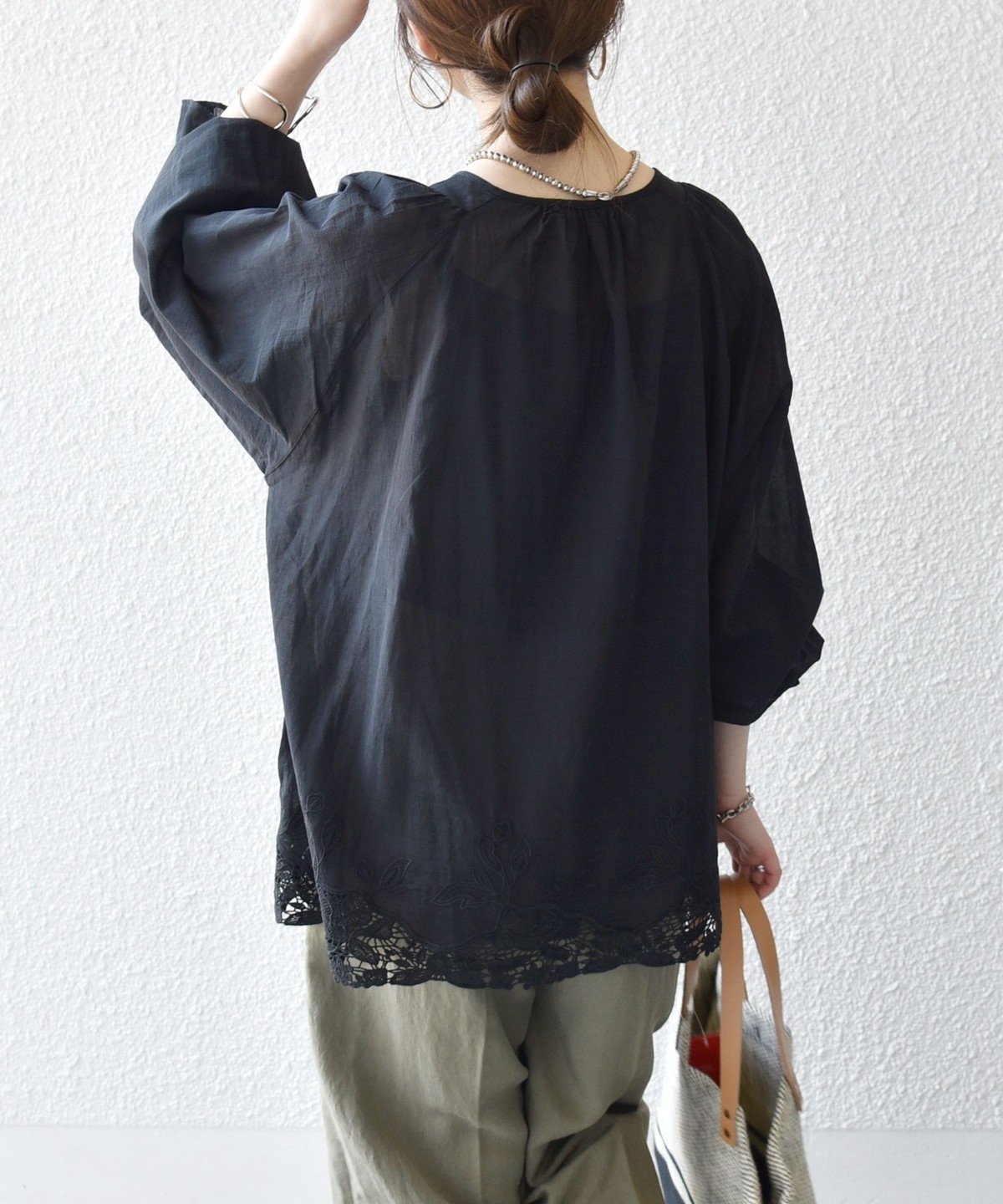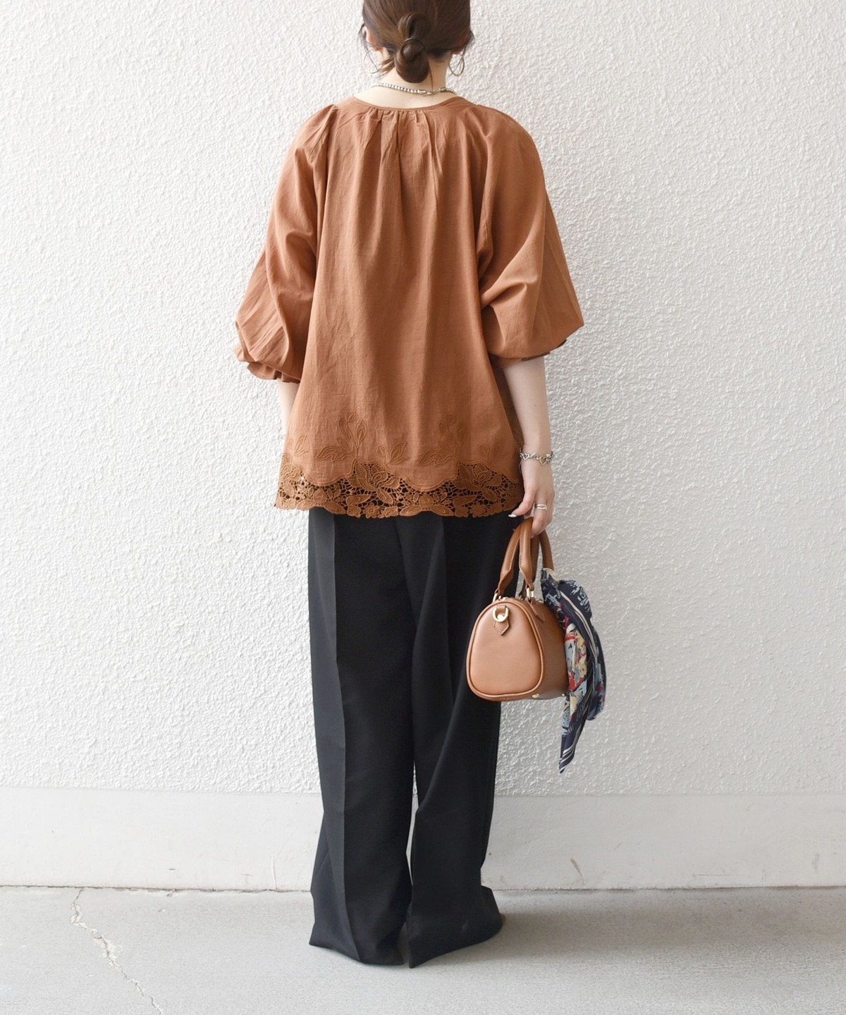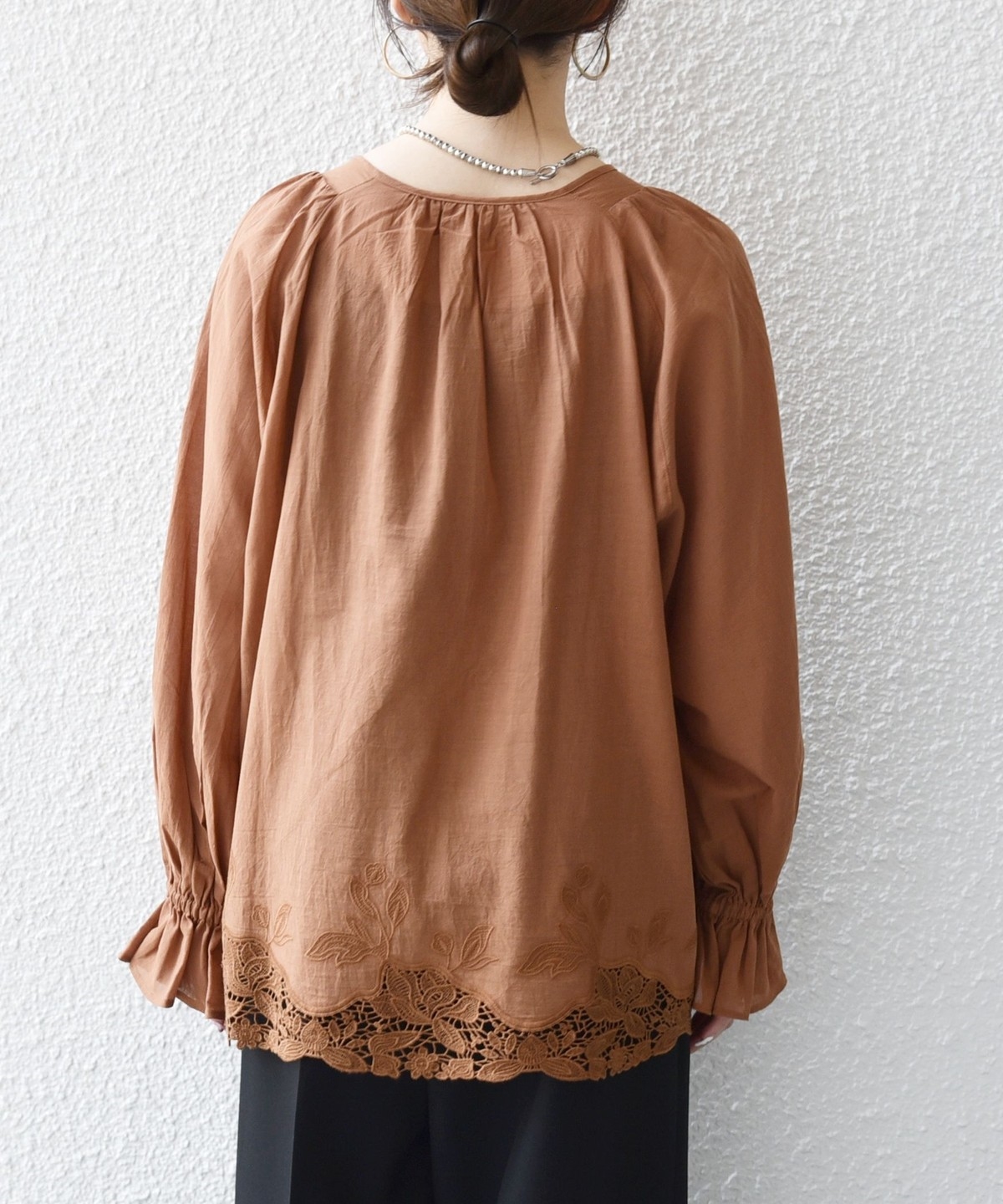 ゴム仕様のボリューム袖を活かし、袖をたくし上げてふんわりとした立体感を出すアレンジも楽しめます。