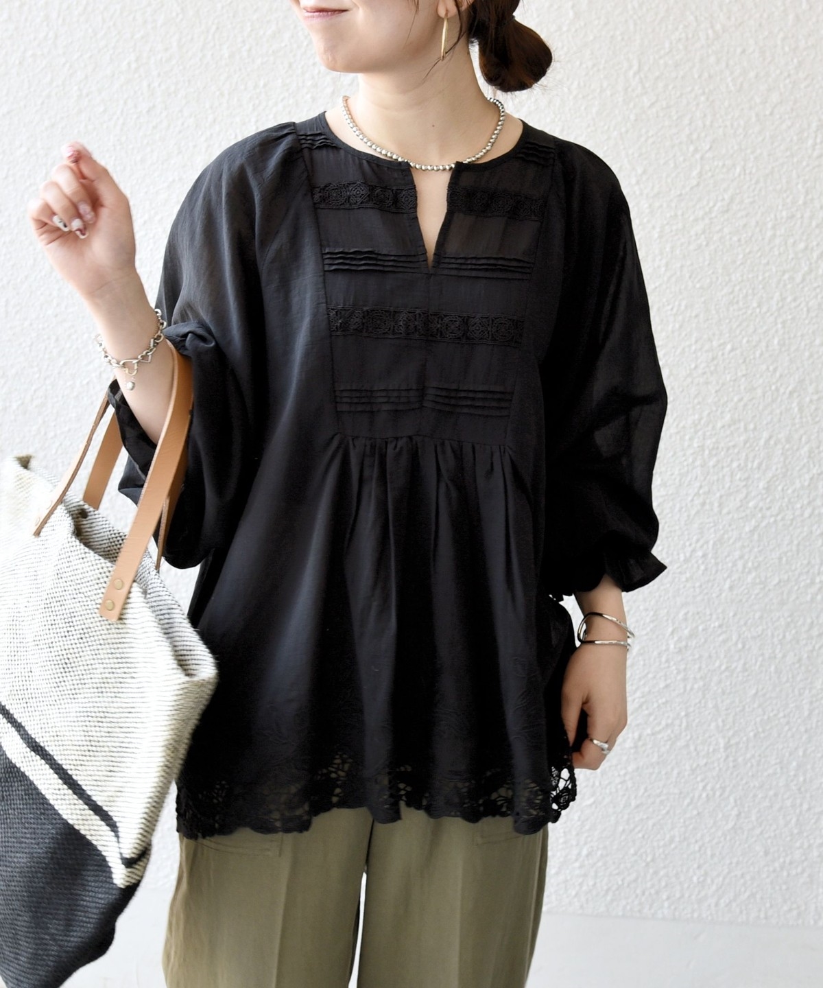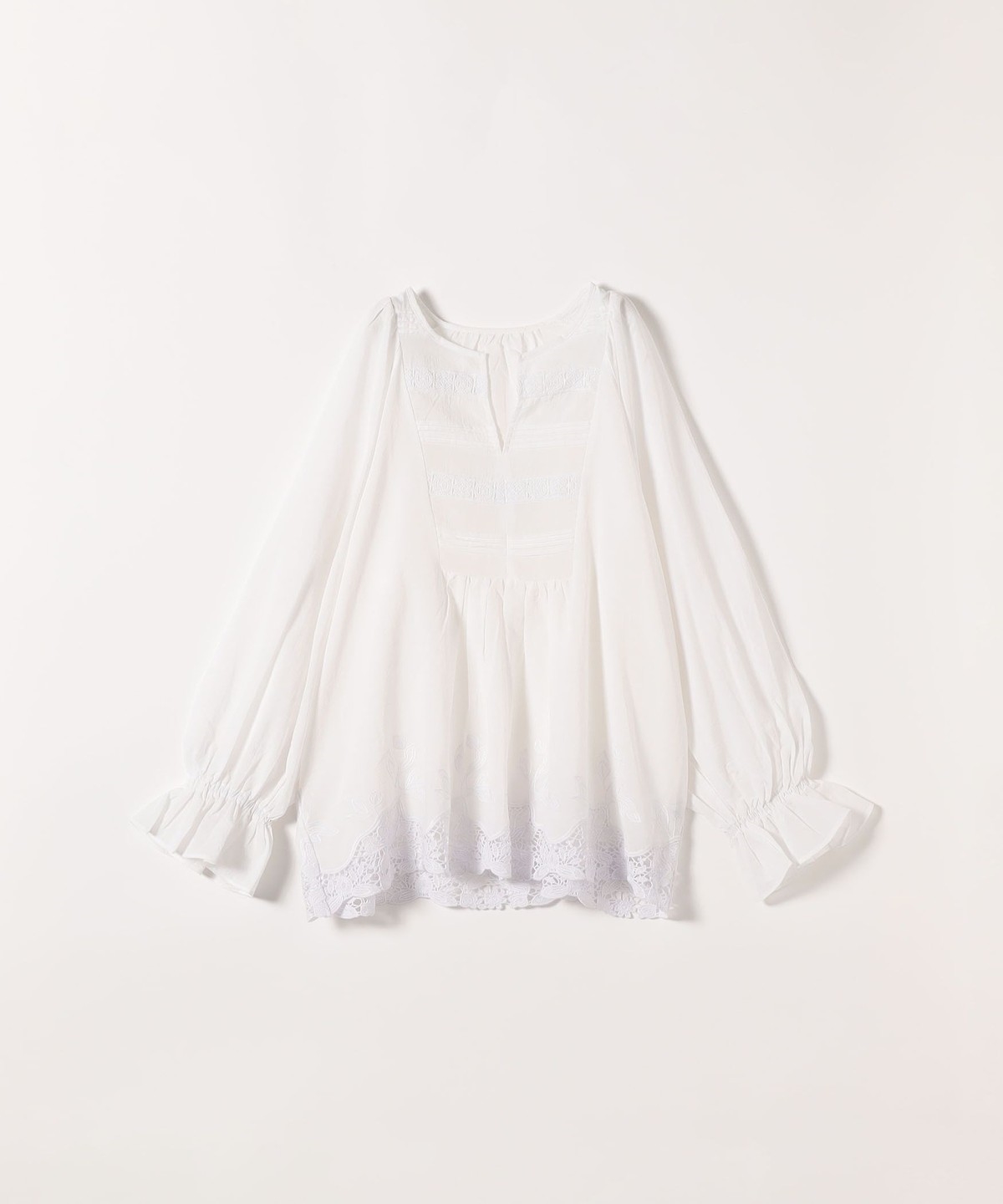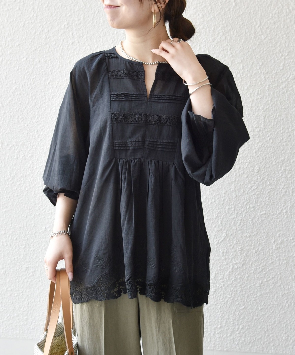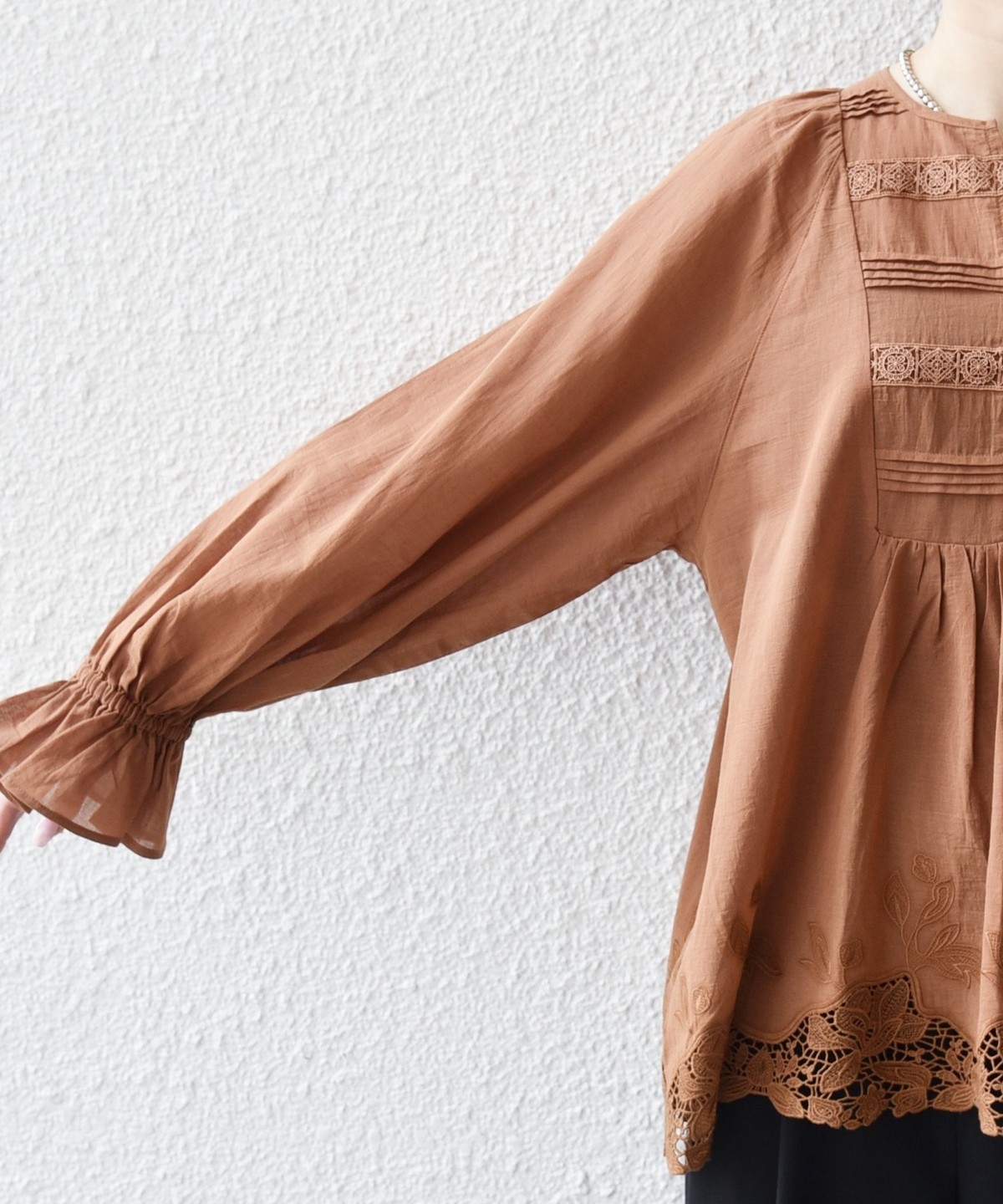 透け感とフロントのタックやレースの華やかさが目を惹くブラウス。