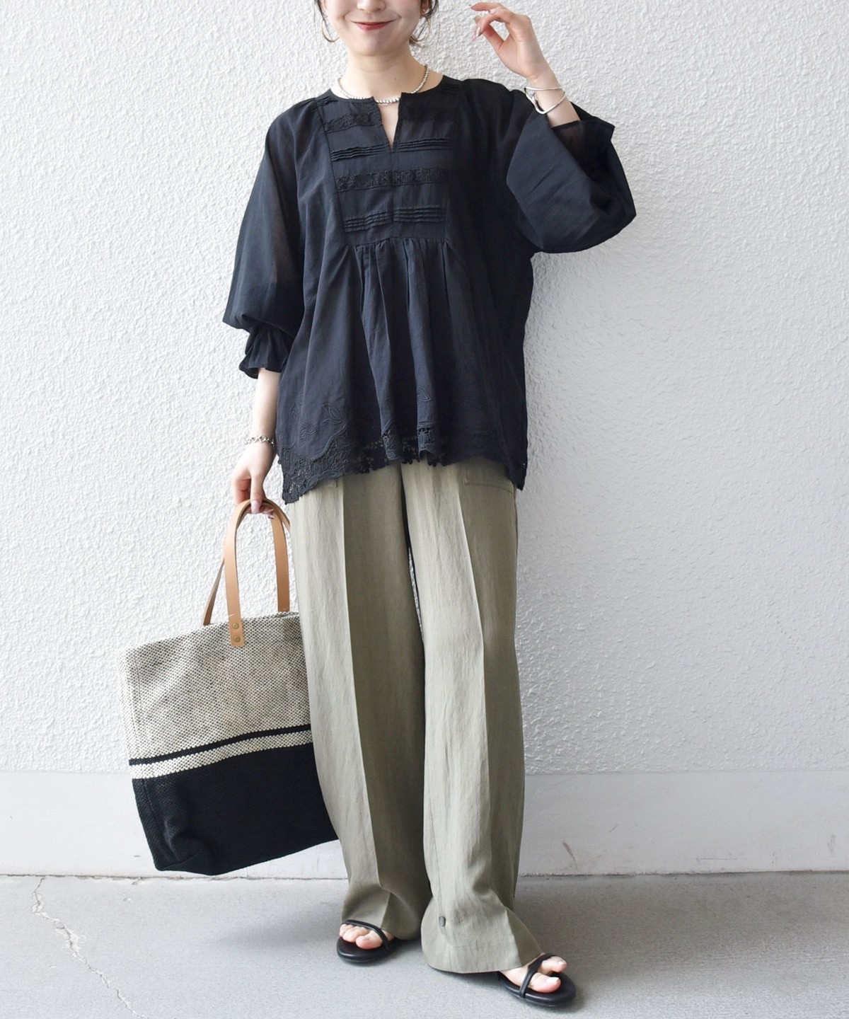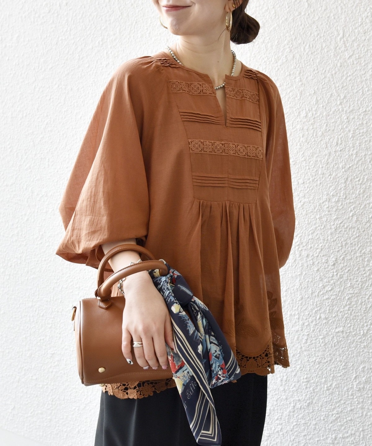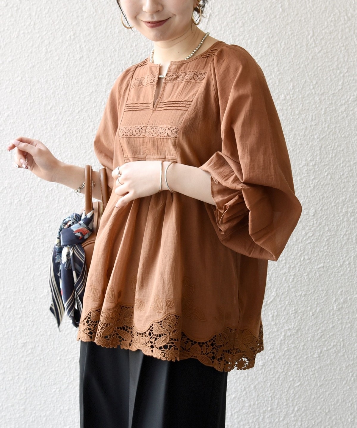 キーネックで顔まわりをすっきりと見せつつ、広めのアームホールとフェミニンなキャンディースリーブが、ふんわりと広がる軽やかなシルエットを演出します。