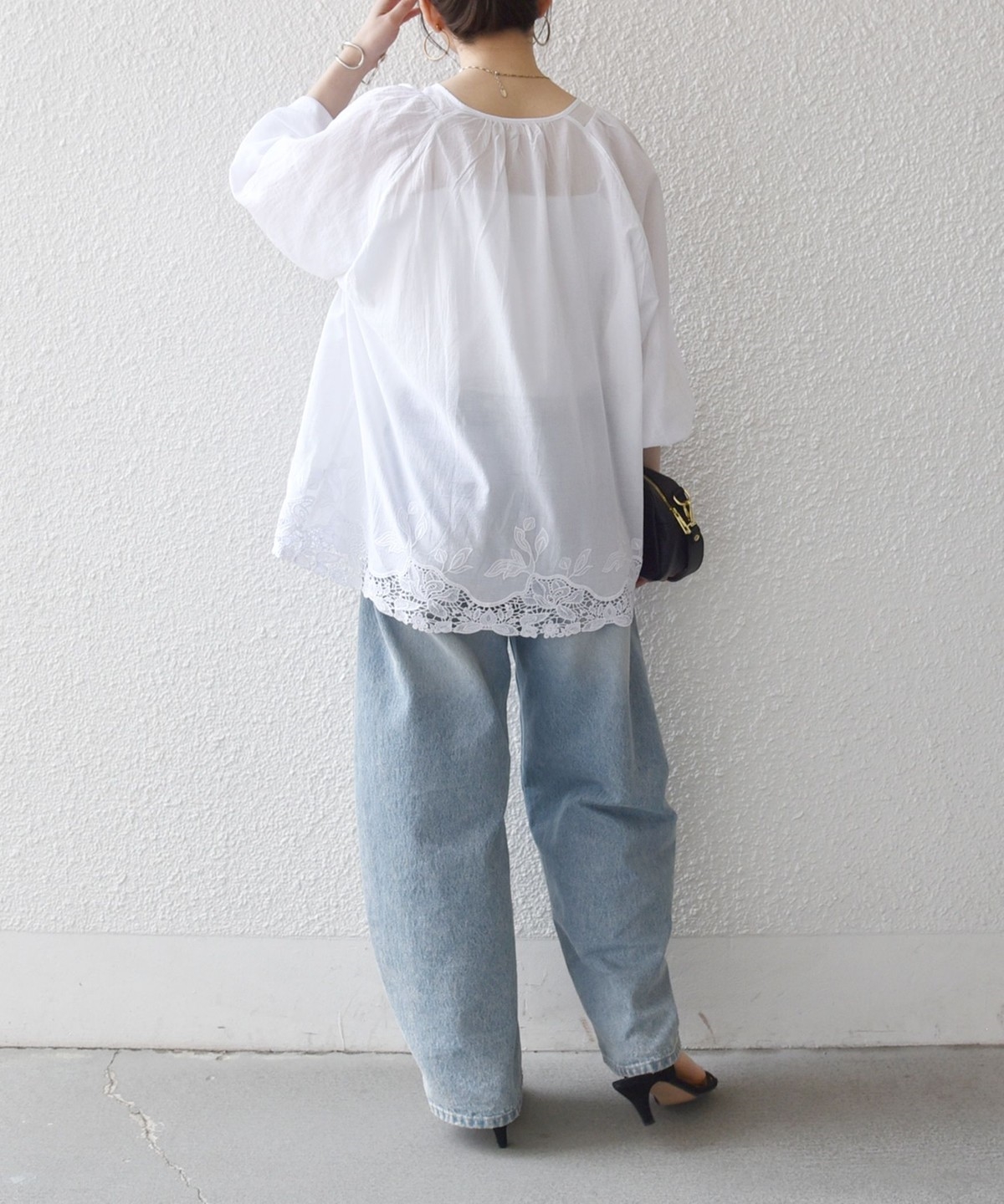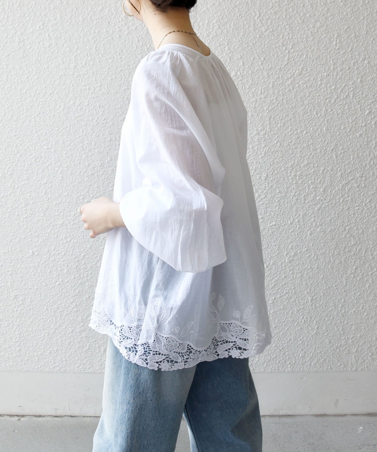 シアー素材と刺繍のデザインでやや甘めな印象のため、シンプルにデニムと合わせたスタイリングがおすすめです。
