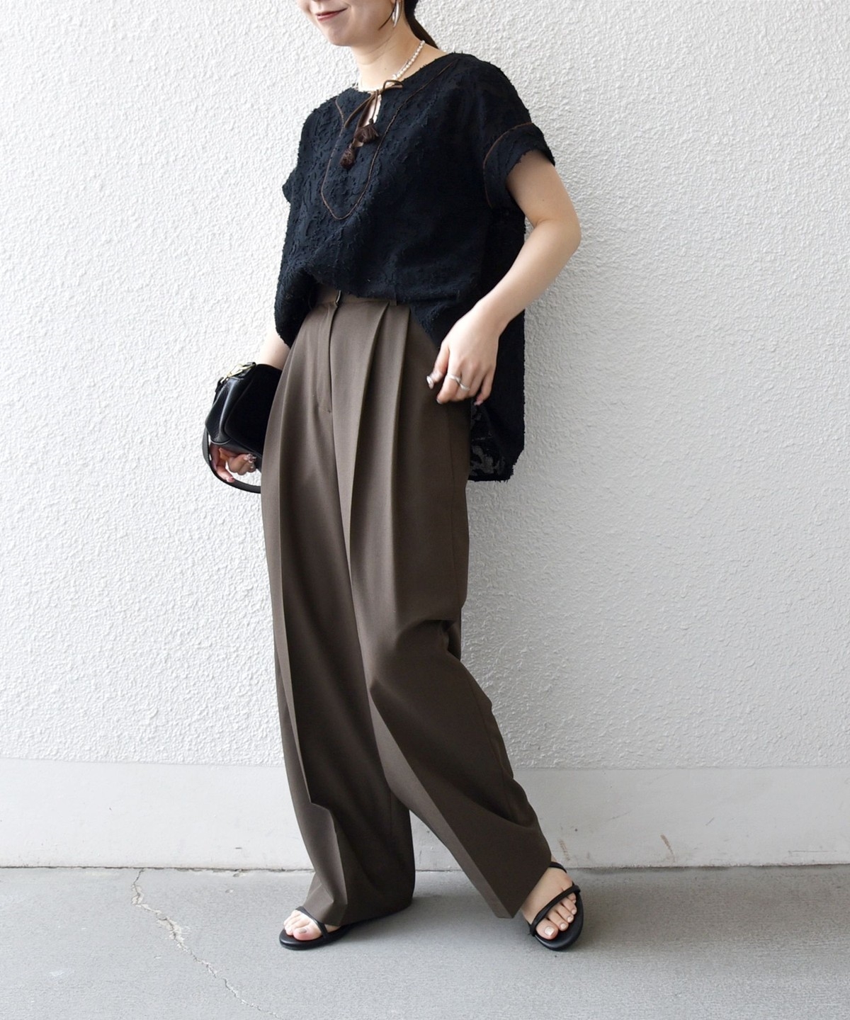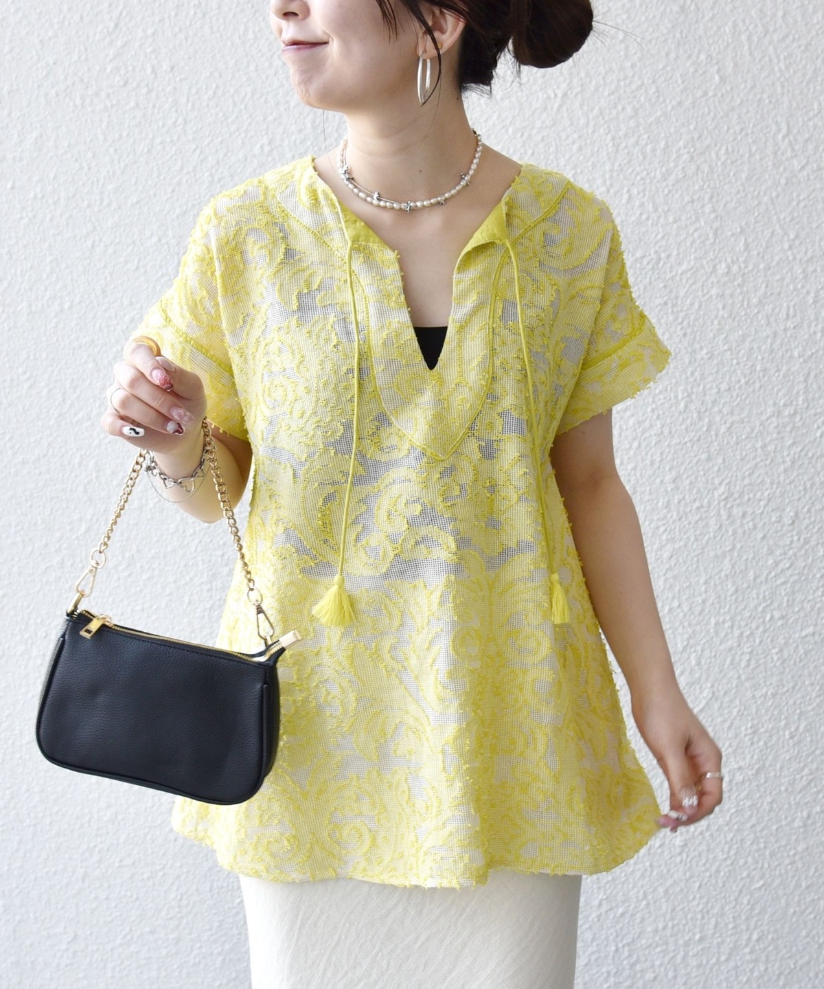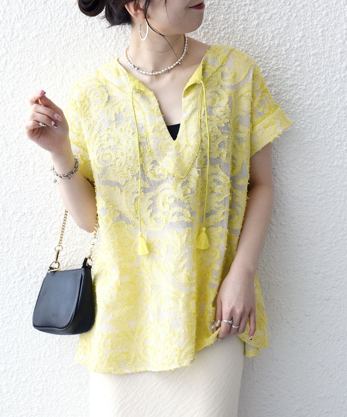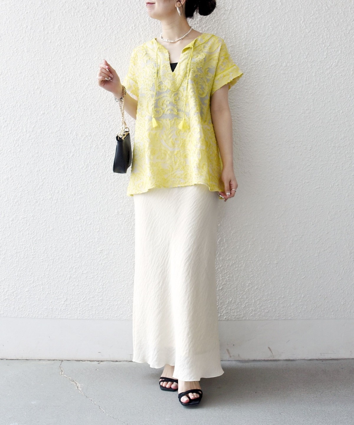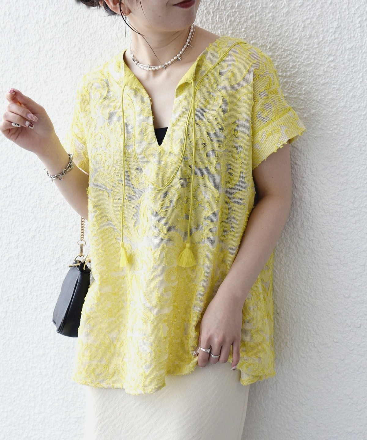 リネン素材のワイドパンツやリラックス感のあるロングスカートと合わせて、夏らしいリゾートムードに。