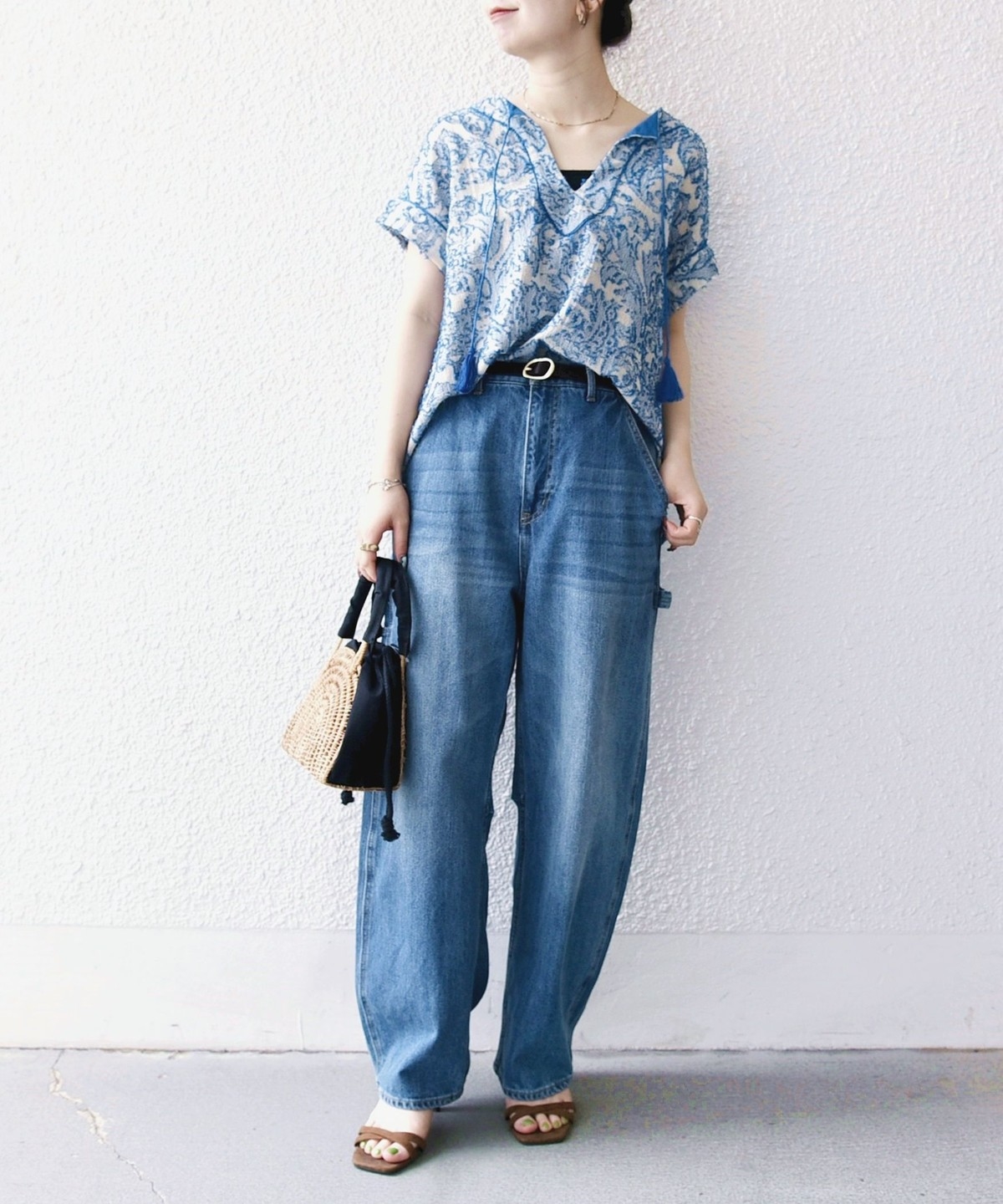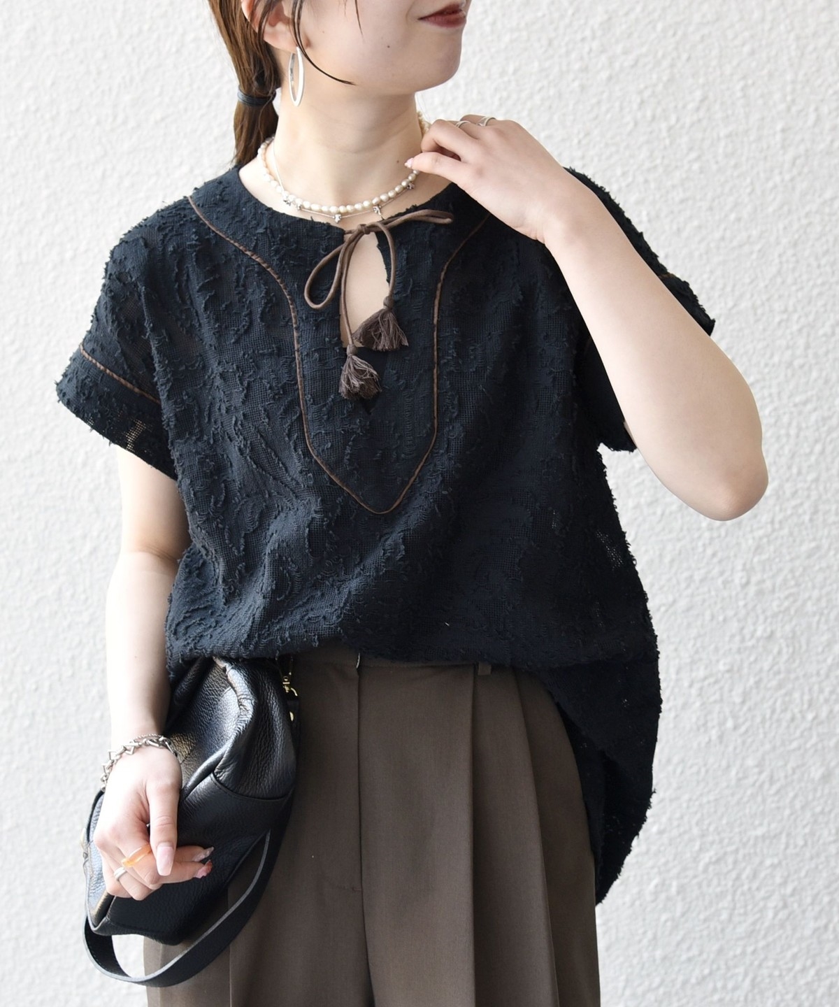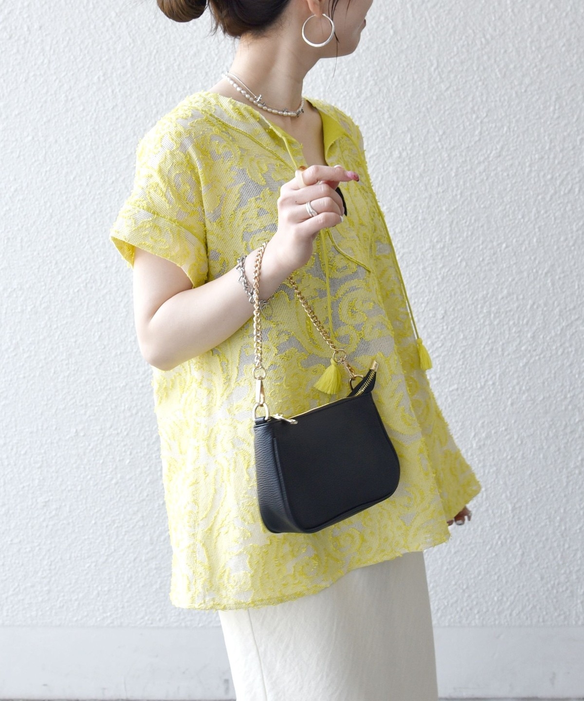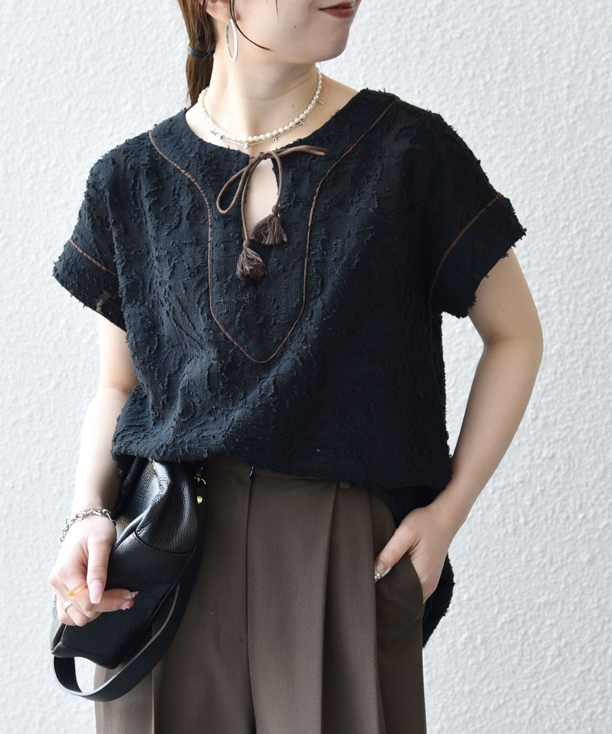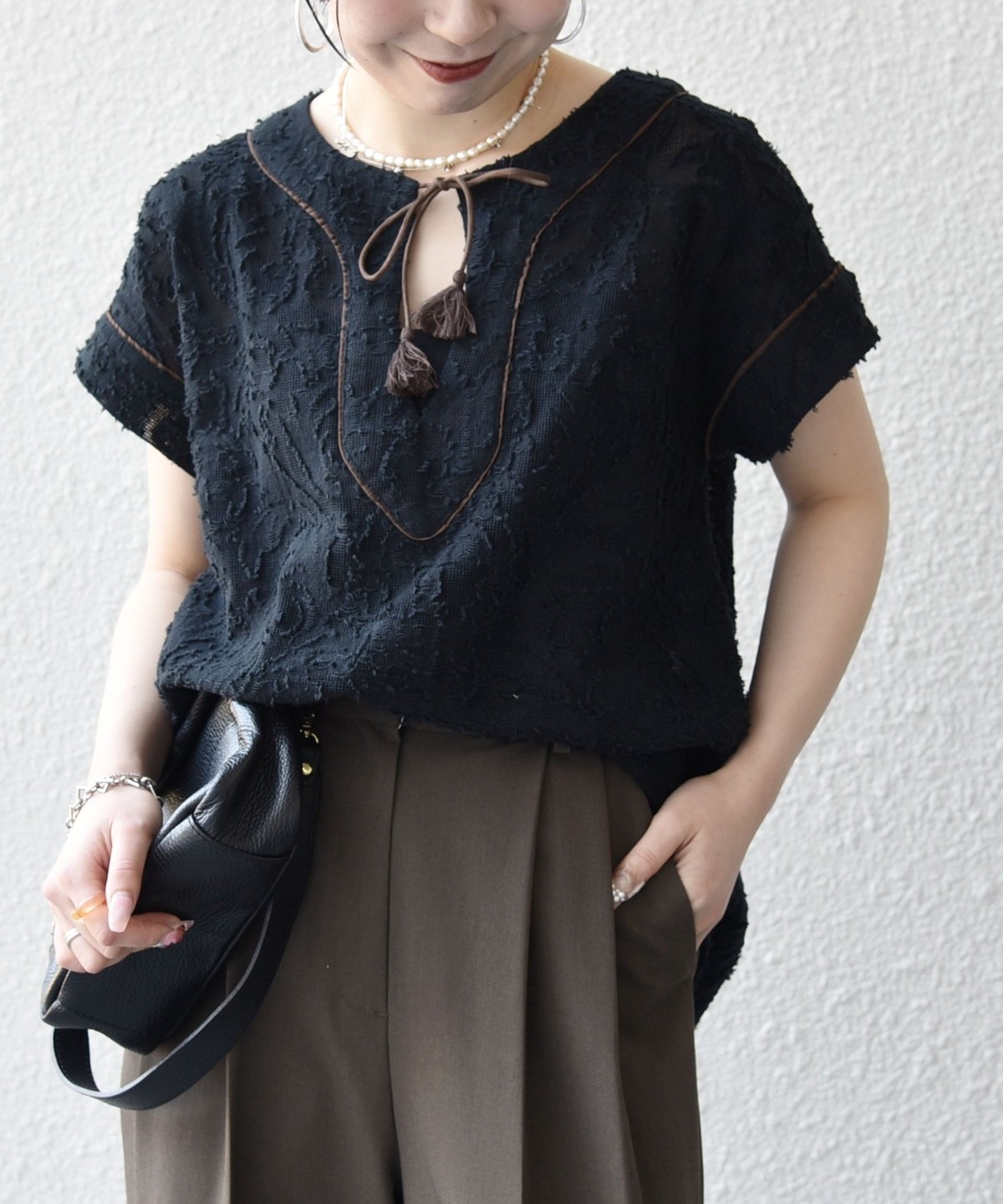リネン素材のワイドパンツやリラックス感のあるロングスカートと合わせて、夏らしいリゾートムードに。