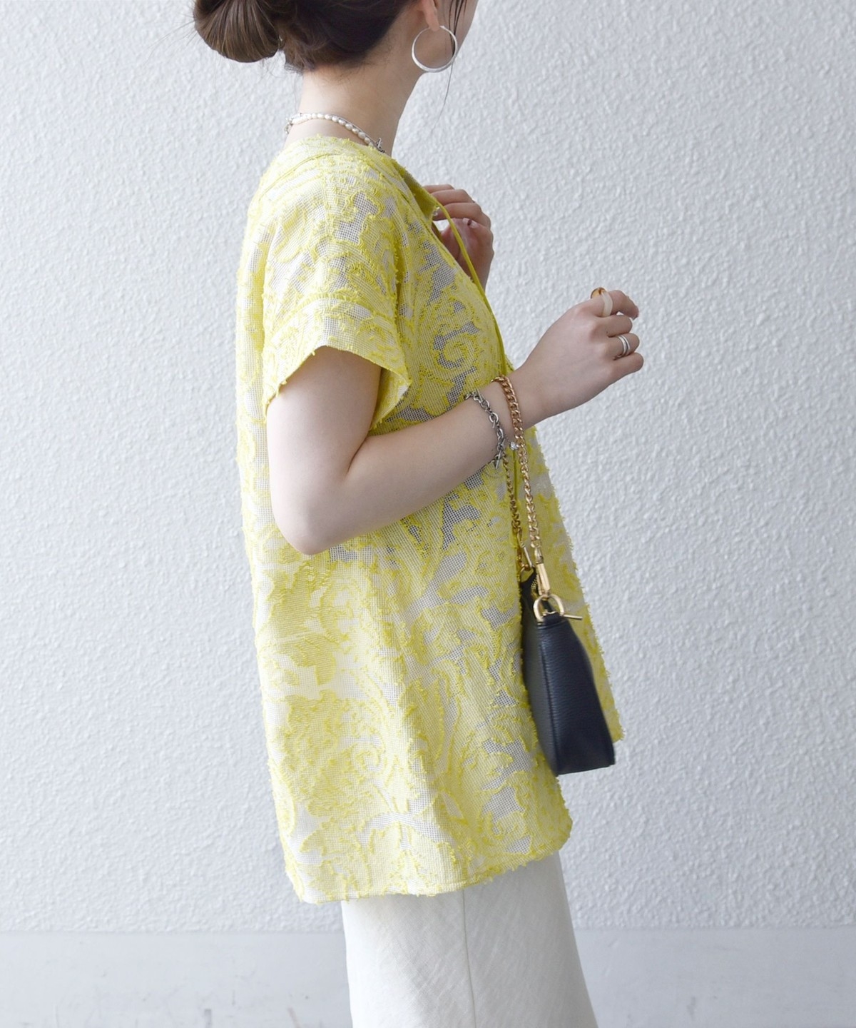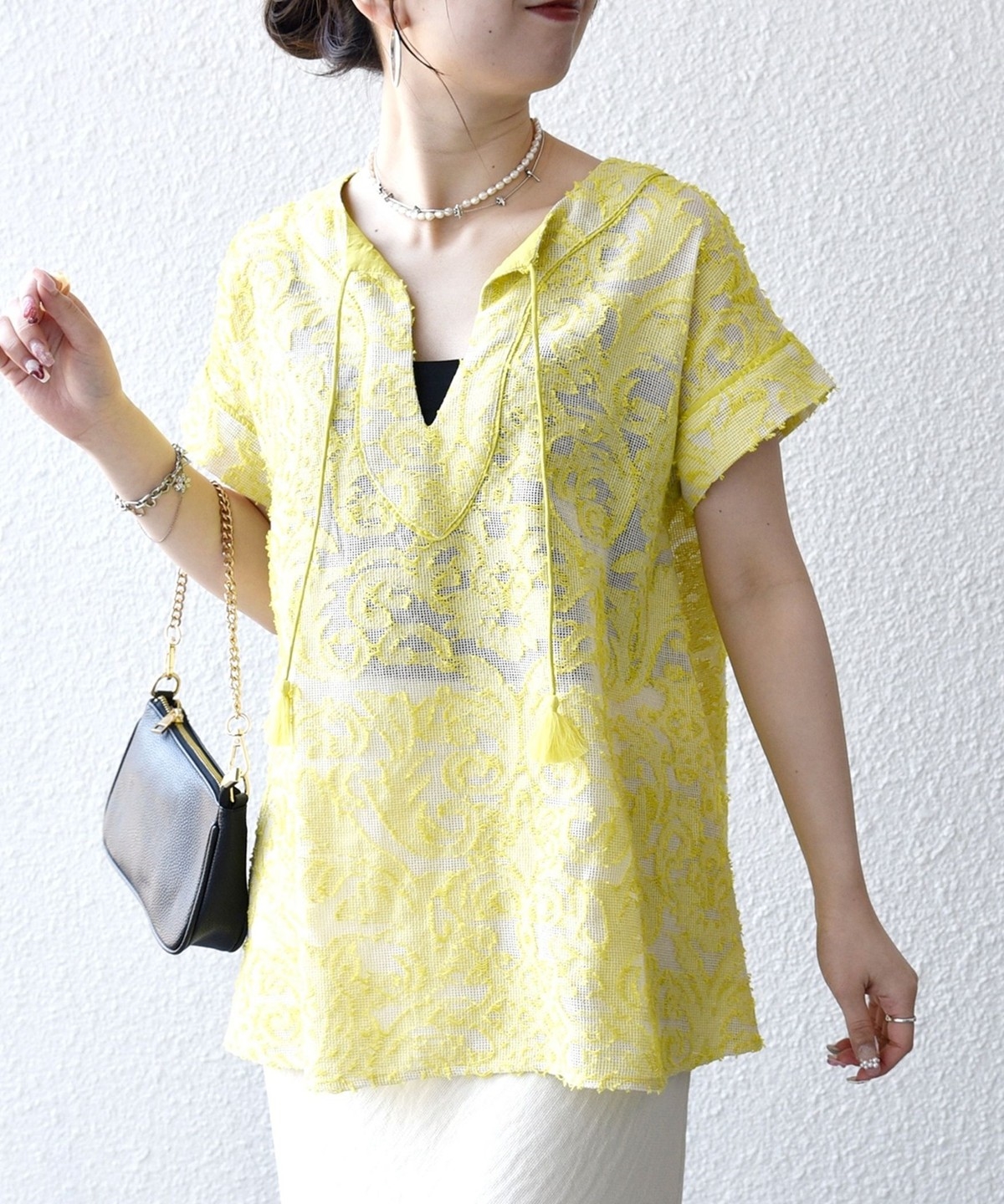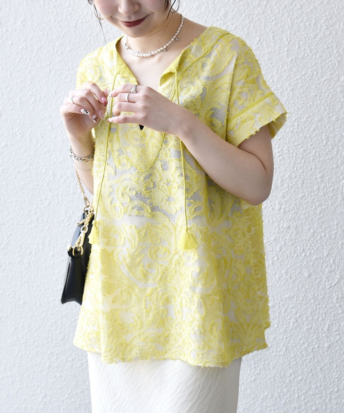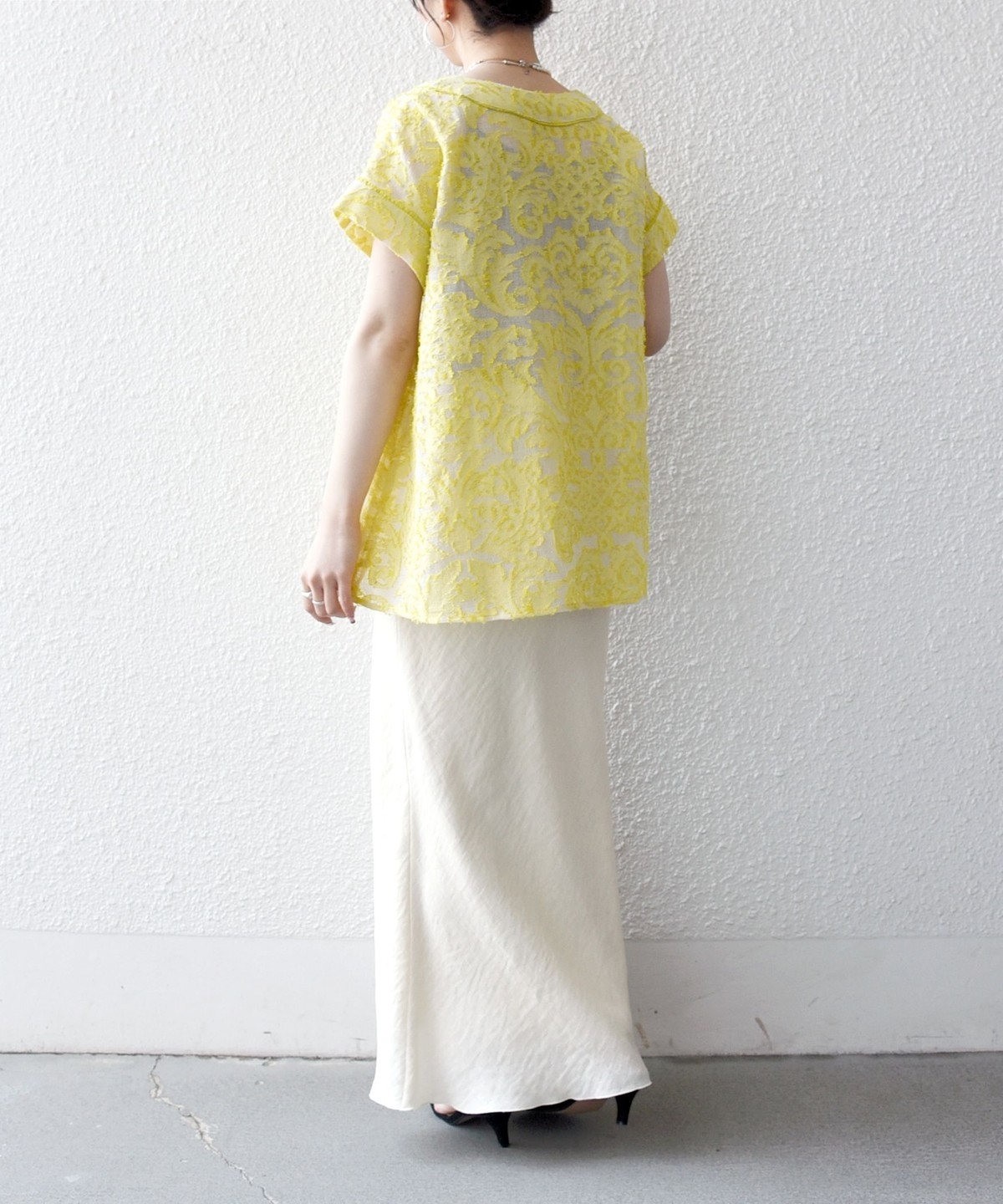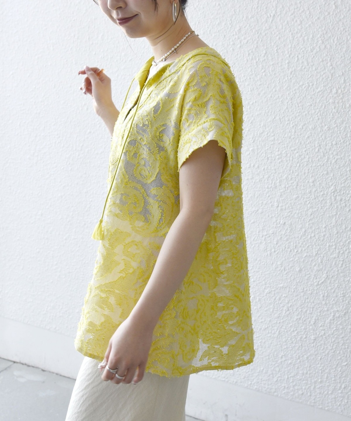 3. 《追加予約》SHIPS any:〈手洗い可能〉メッシュ ジャカード カフタン スキッパー ブラウス イエロー