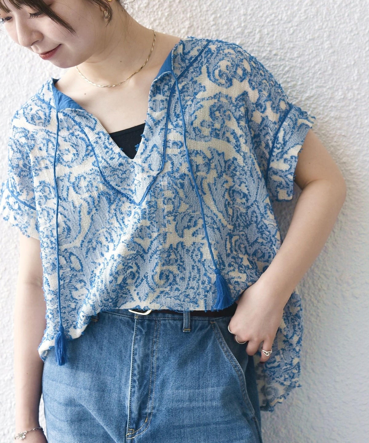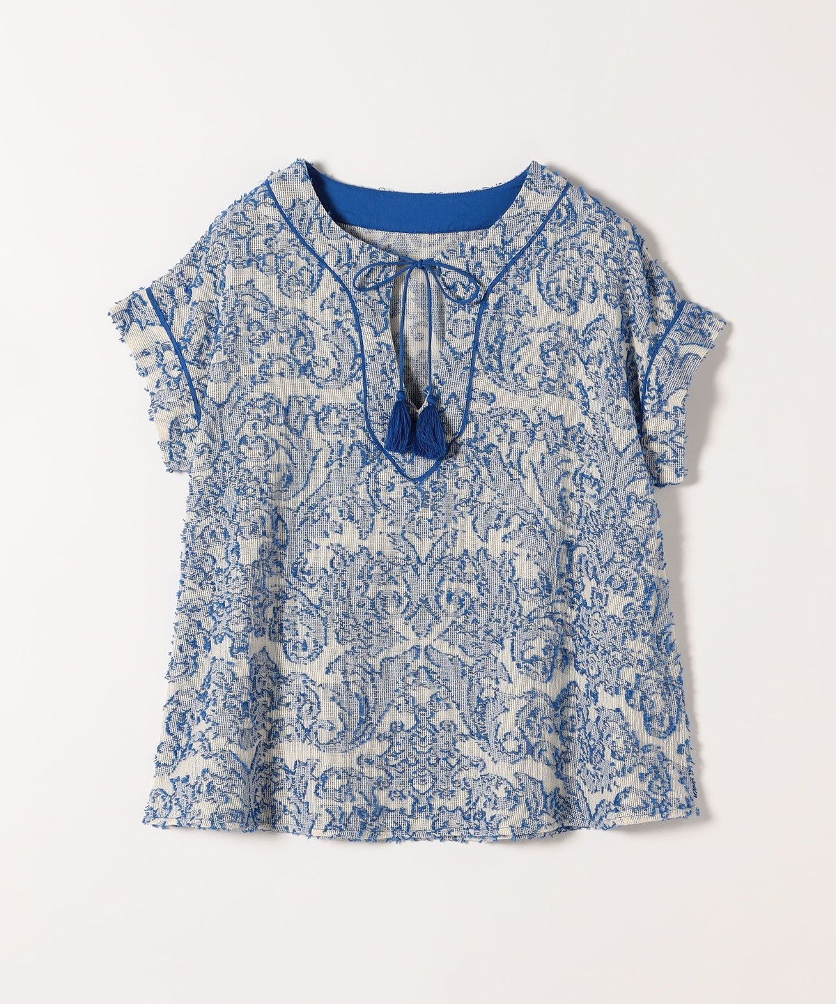 2. 《追加予約》SHIPS any:〈手洗い可能〉メッシュ ジャカード カフタン スキッパー ブラウス ブルー
