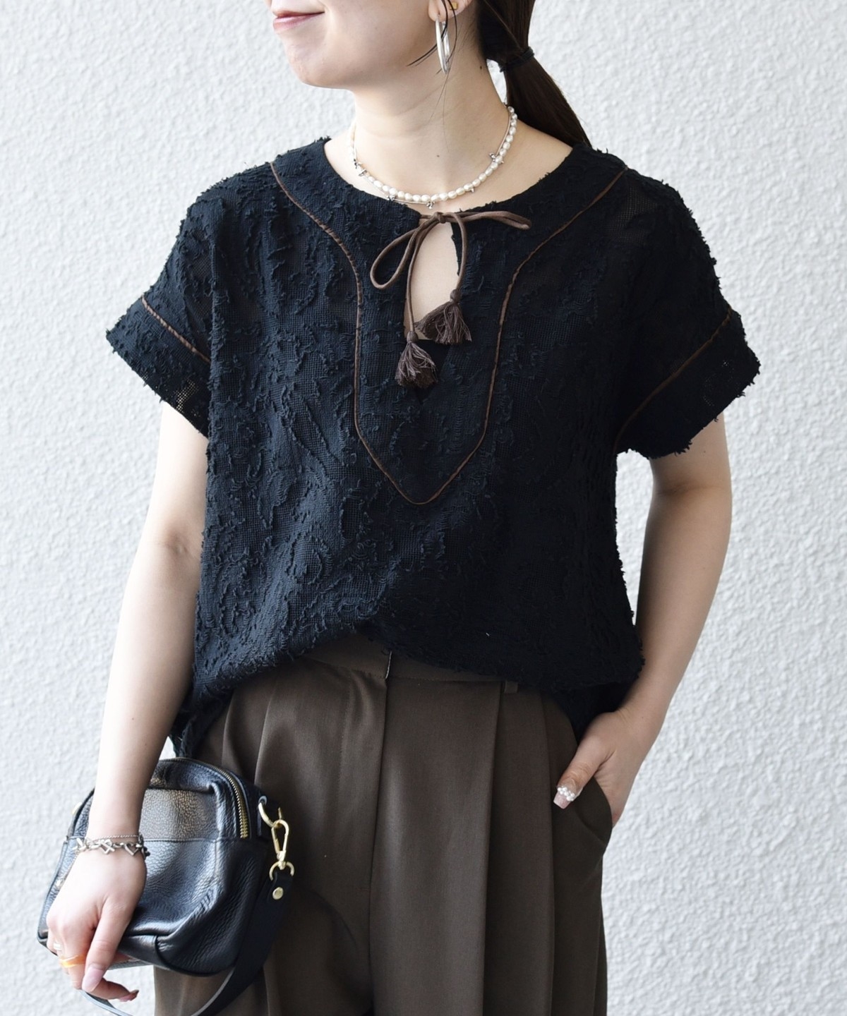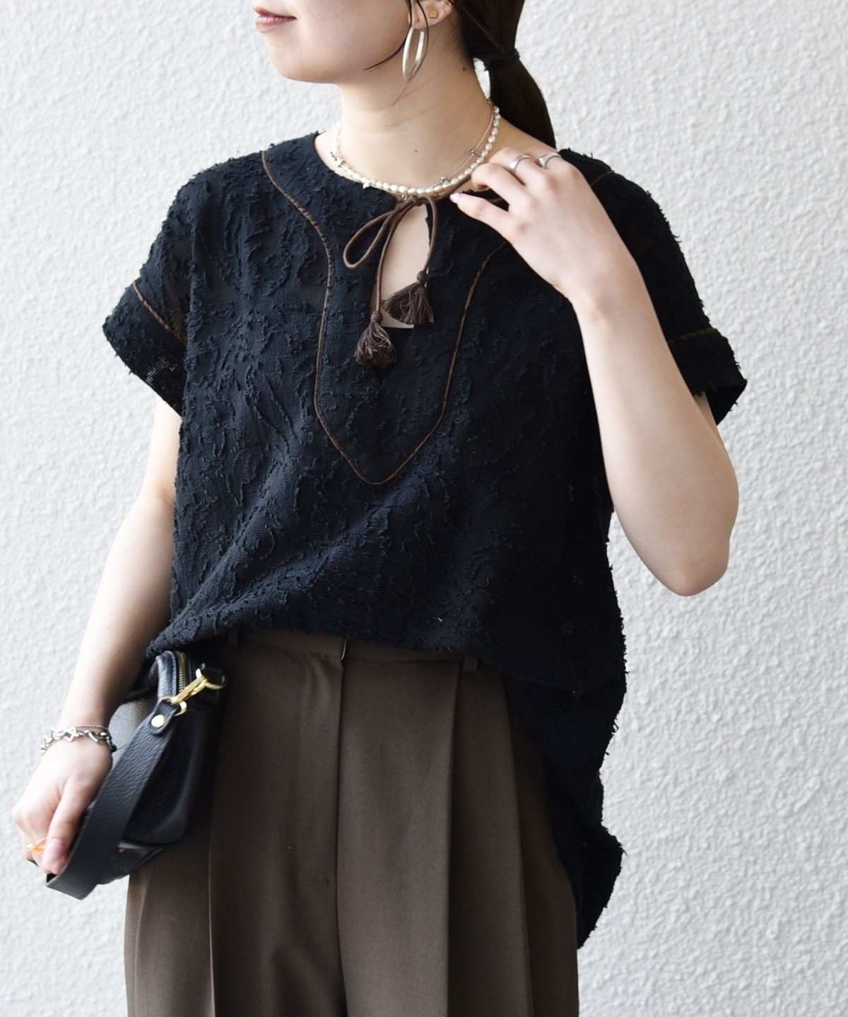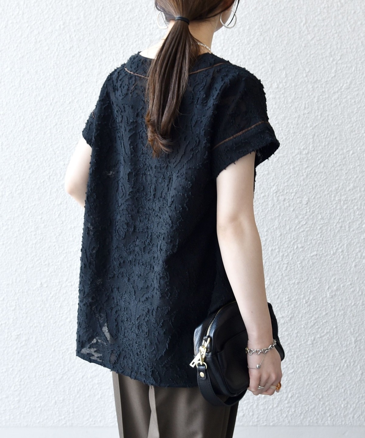 1. 《追加予約》SHIPS any:〈手洗い可能〉メッシュ ジャカード カフタン スキッパー ブラウス ブラック
