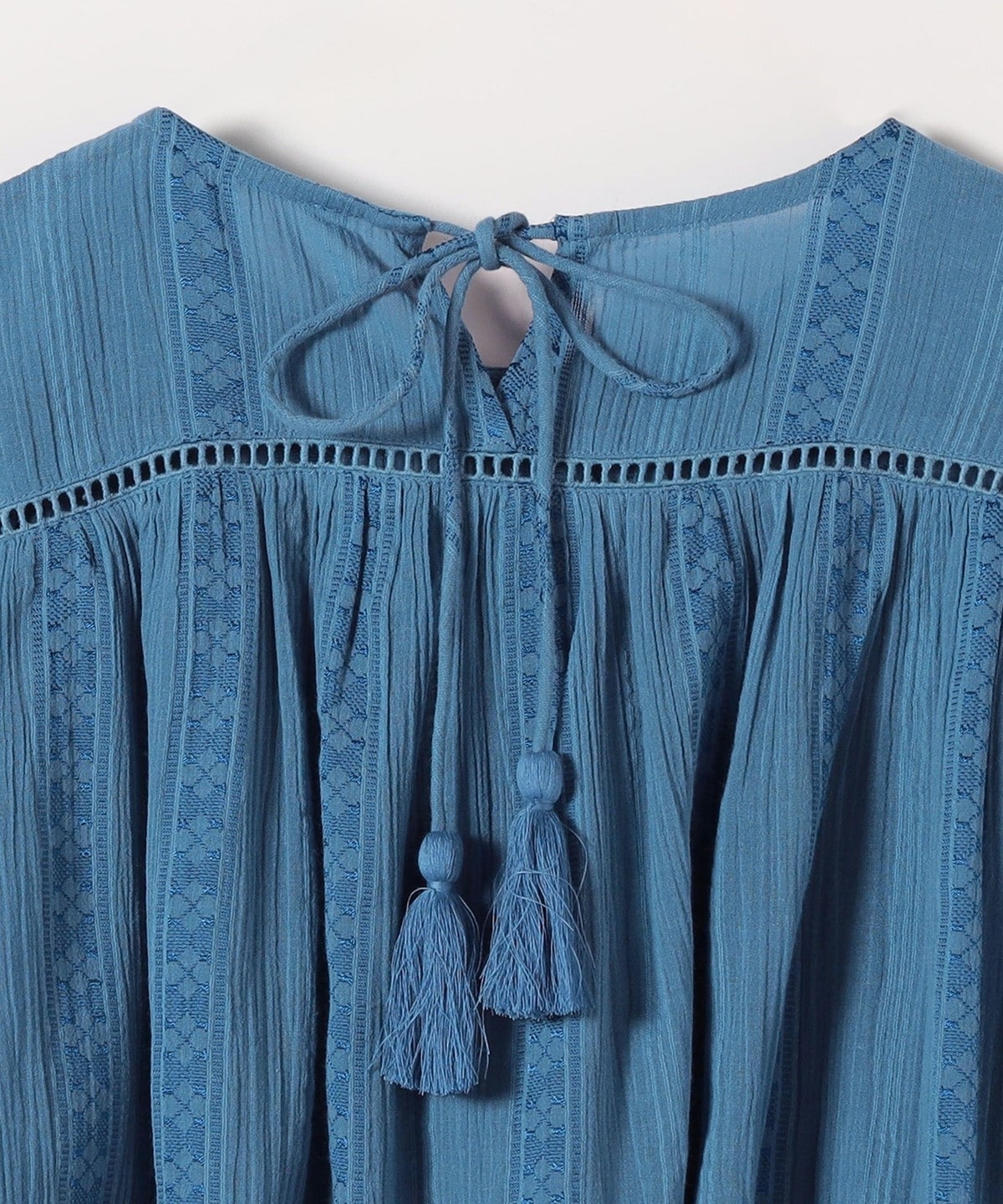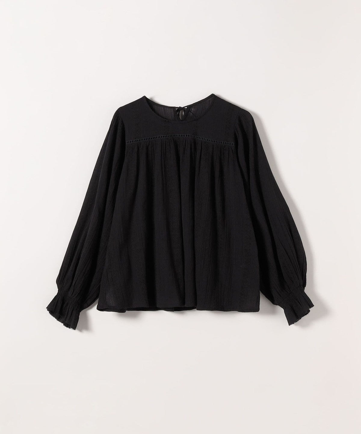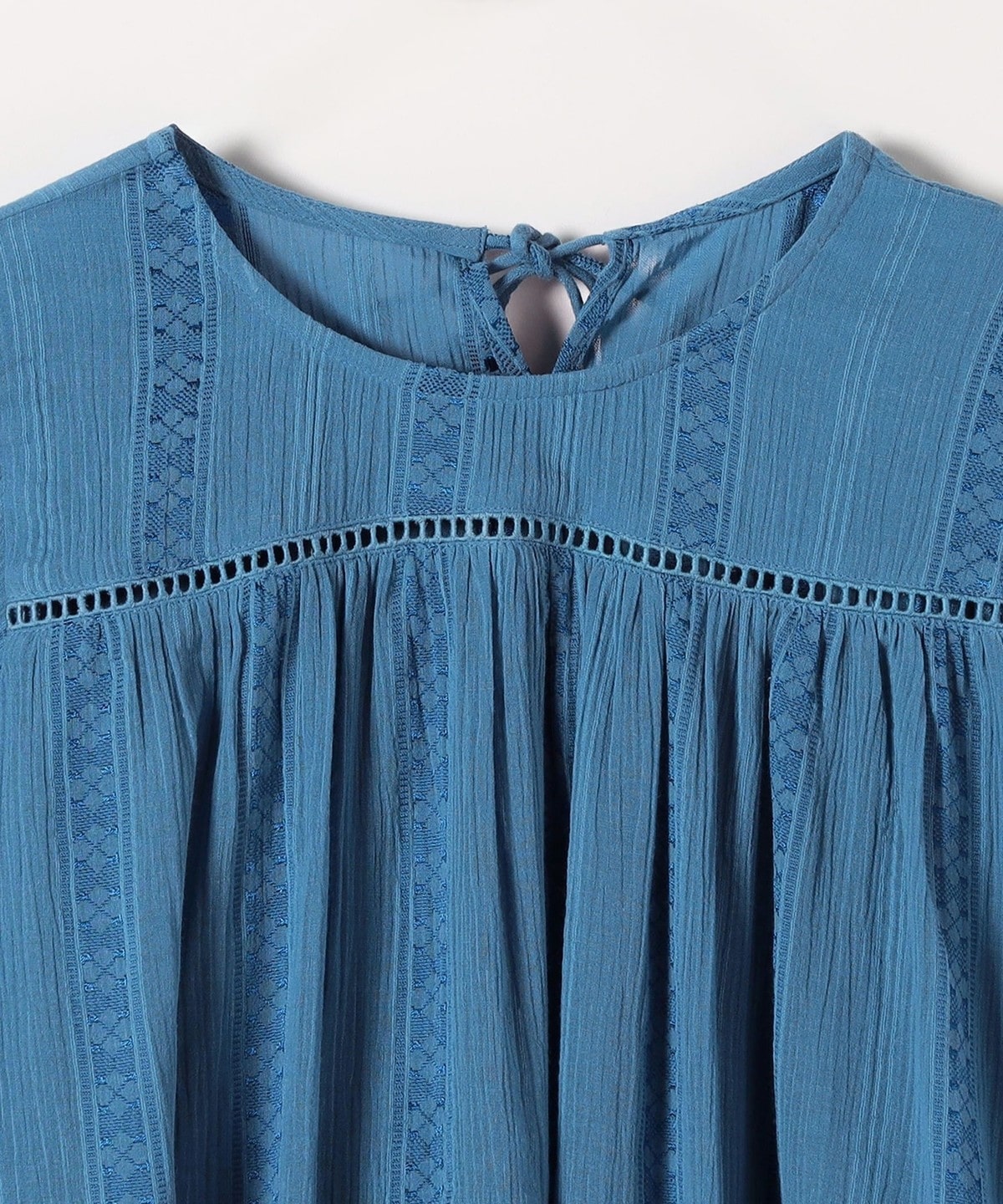 フロントヨークにハシゴレースをあしらった、クルーネックブラウス。